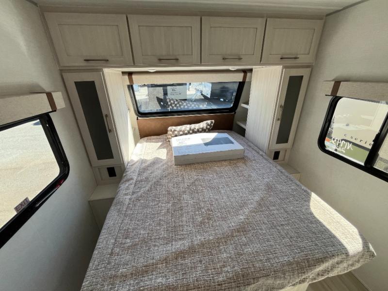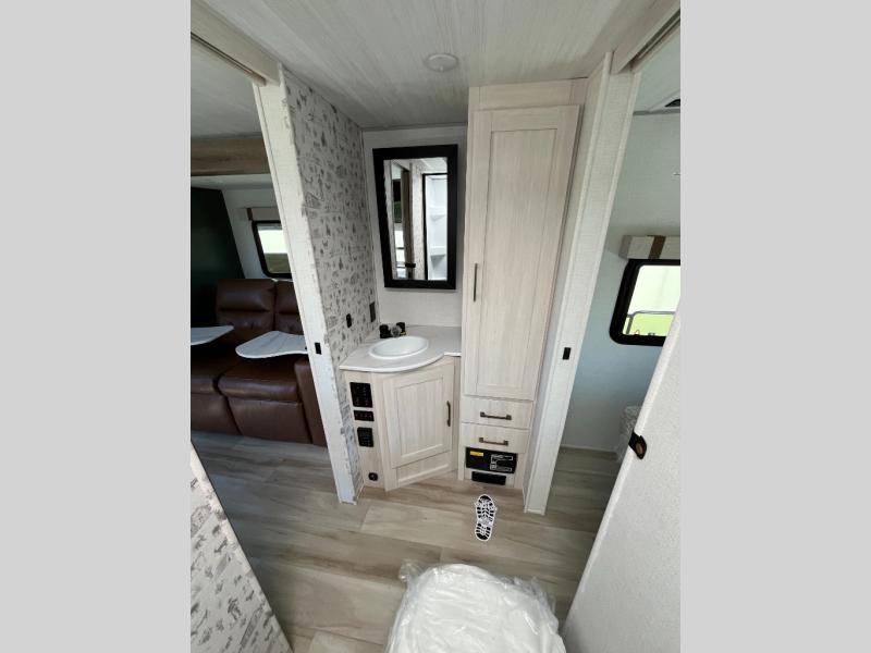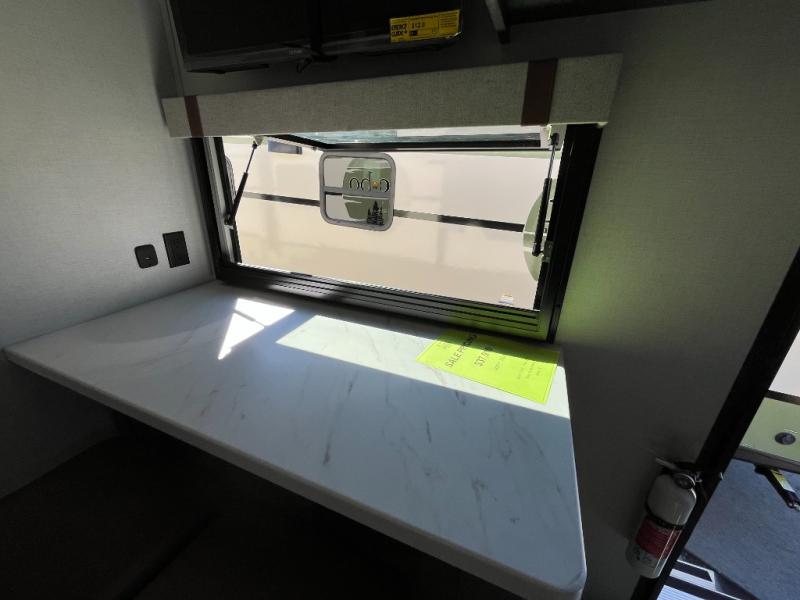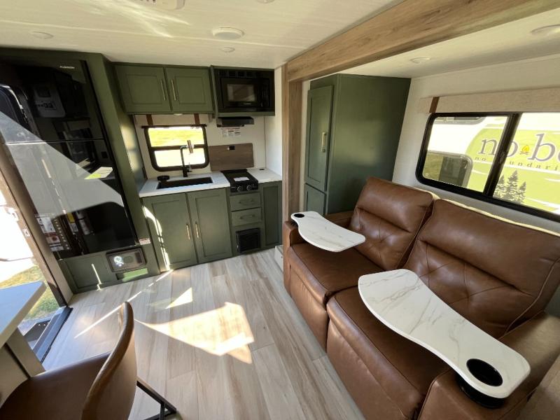 You'll love camping in this couple's trailer! There is a queen bed in the front bedroom, along with dual bedside wardrobes and overhead storage for clothes, books and more. And don't overlook the spacious walk-thru bath! Once you've made breakfast in the rear kitchen or on the outside kitchen, you can dine at the bar top with chairs and a flip-up window. There is also a Trailgate Outdoor Bar if you decide to dine outdoors!