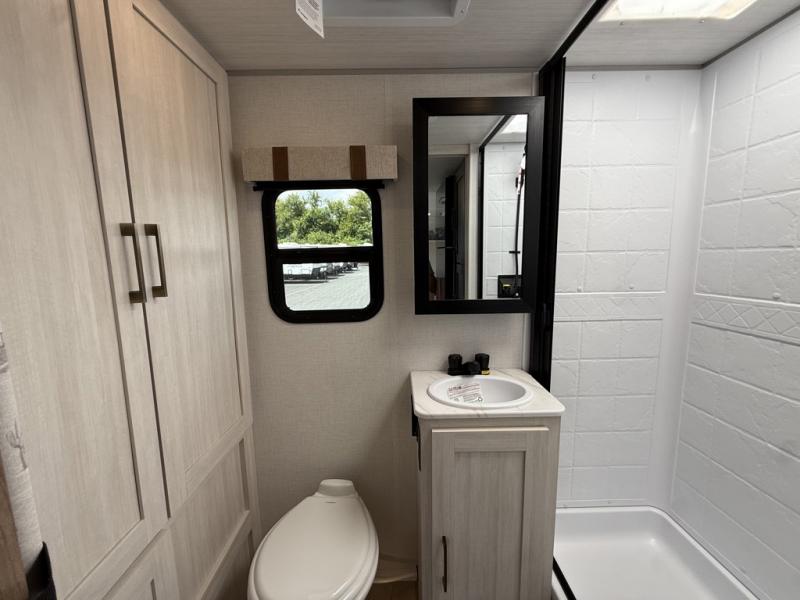 Take this No Boundaries travel trailer out for a no-stress weekend! You'll have a rear bathroom complete with a shower, toilet, vanity, and linen closet, and the kitchen comes with a pantry, microwave and air fryer plus a sink to help you stay on top of the daily meals. A booth dinette will provide a place to dine and play games in the evening, and an overnight guest can make their bed here. Up front, the Murphy bed can be set up for a great night's rest, and there are dual bedside wardrobes to keep your things tidy.