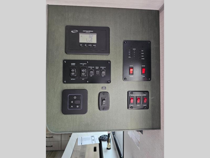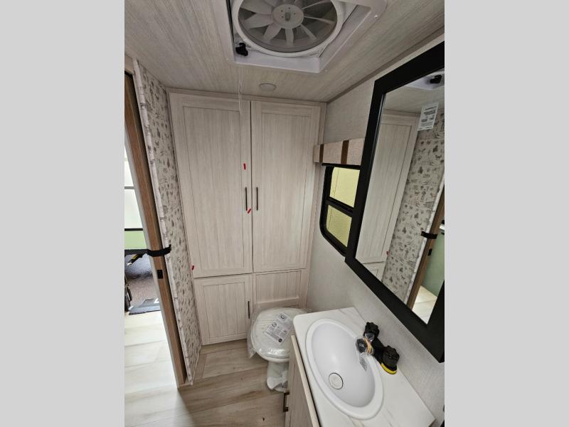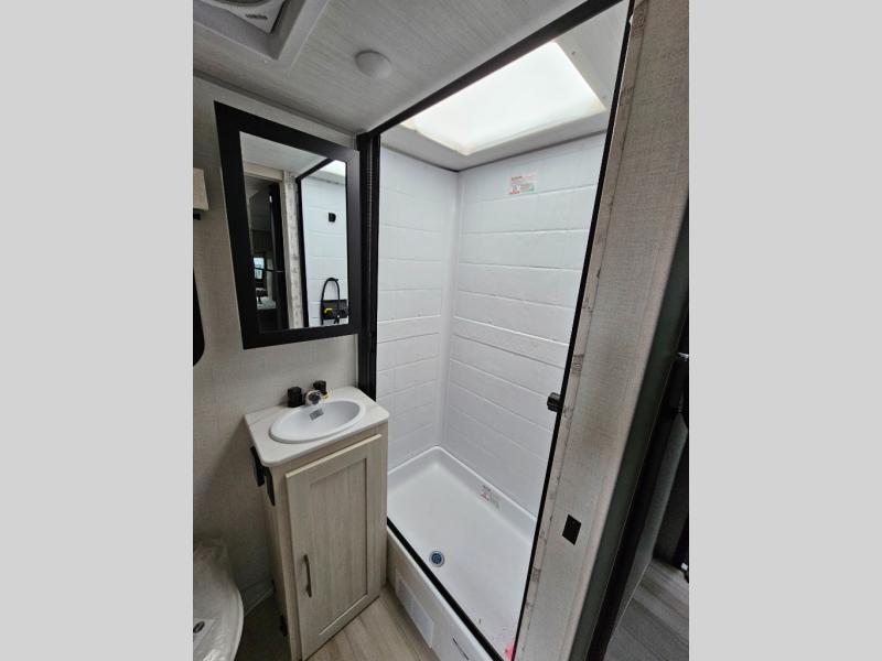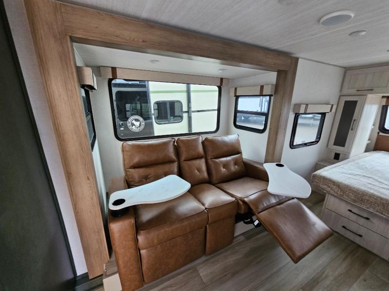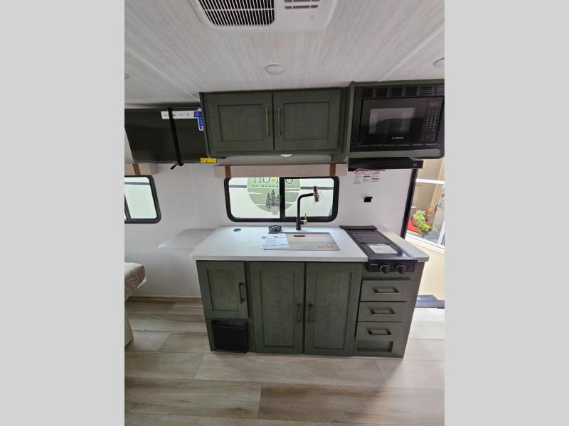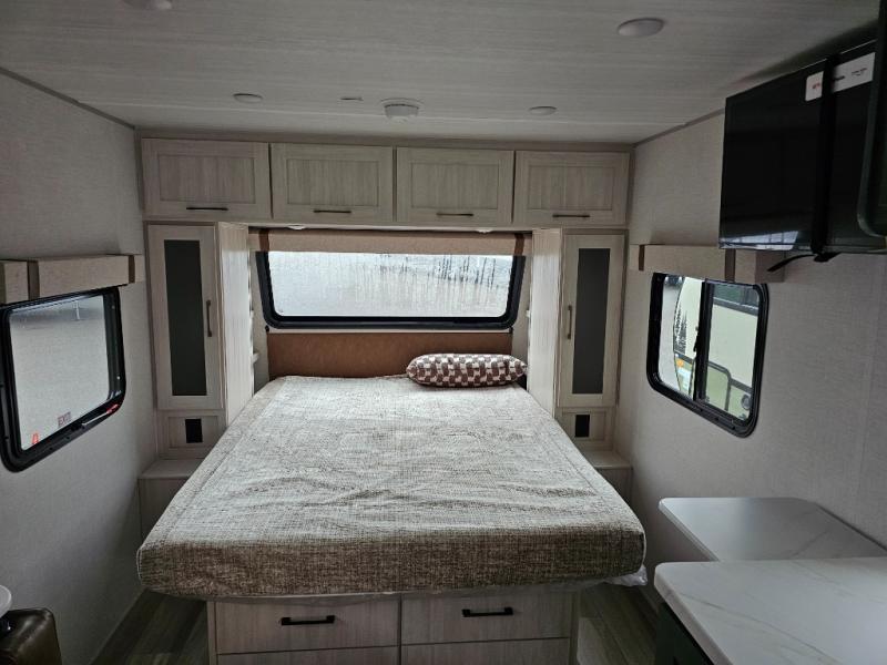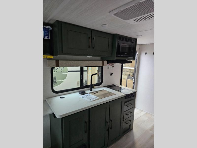 Make your camping dreams come true with this No Boundaries travel trailer! The kitchen has great amenities, like a cooktop and microwave oven, plus a refrigerator, and a sink to clean up, but you may just find yourselves cooking on the outside kitchen. A jackknife sofa slide will provide seating and sleeping space for a guest, while you take the front queen bed. There are dual bedside wardrobes to keep your clothes organized, and the exterior slam latch cargo doors include pass-thru lighting so you can easily find what you're looking for even at night!