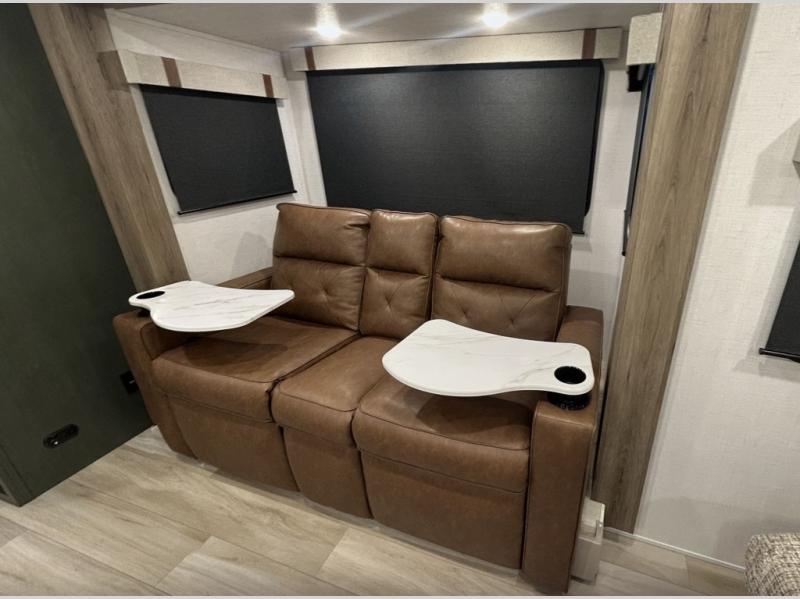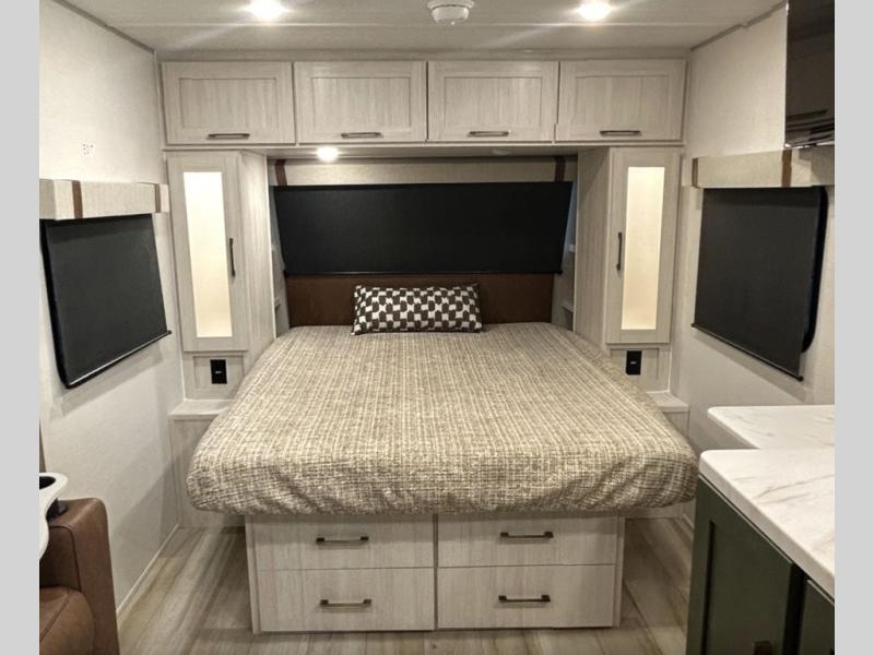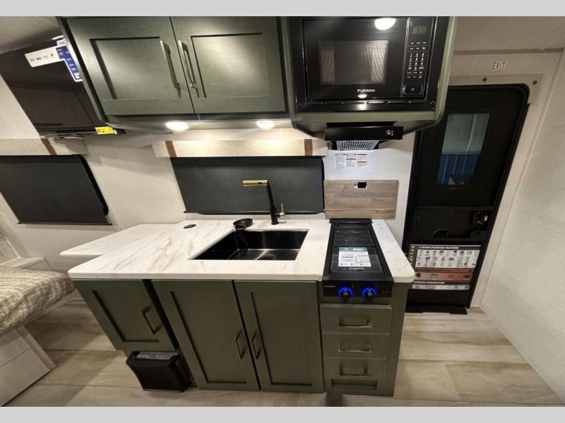Make your camping dreams come true with this No Boundaries travel trailer! The kitchen has great amenities, like a cooktop and microwave oven, plus a refrigerator, and a sink to clean up, but you may just find yourselves cooking on the outside kitchen. A jackknife sofa slide will provide seating and sleeping space for a guest, while you take the front queen bed. There are dual bedside wardrobes to keep your clothes organized, and the exterior slam latch cargo doors include pass-thru lighting so you can easily find what you're looking for even at night!