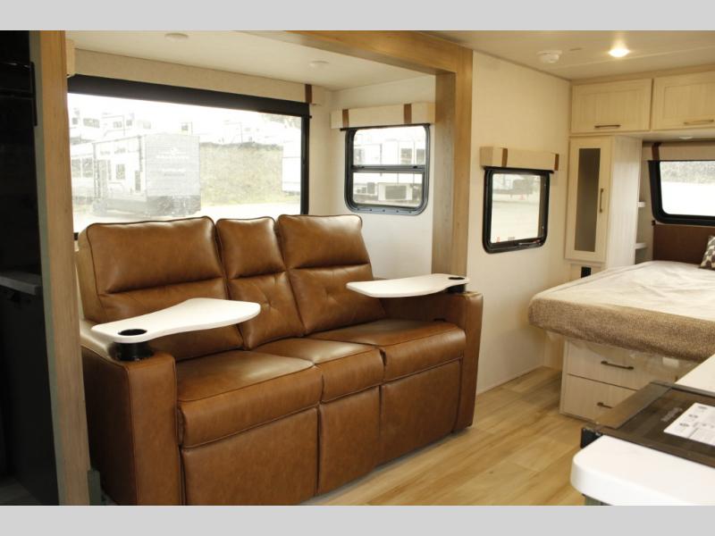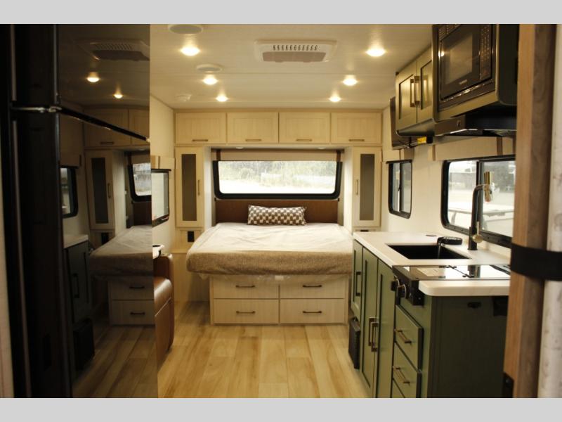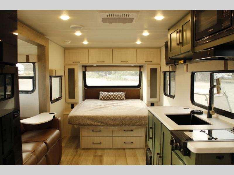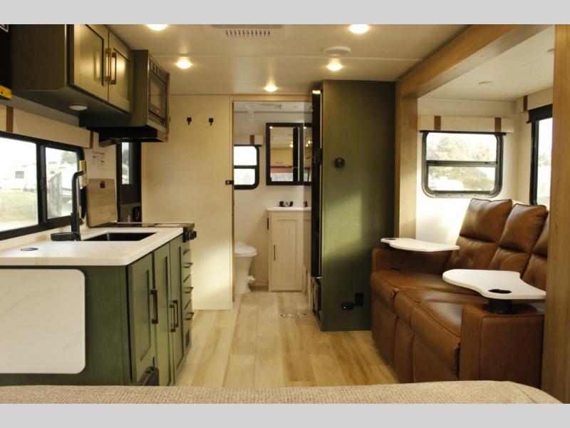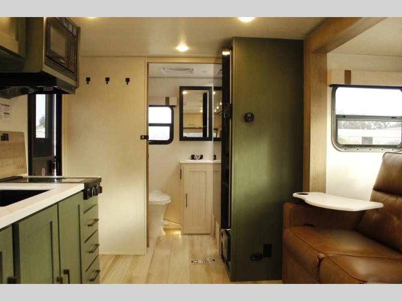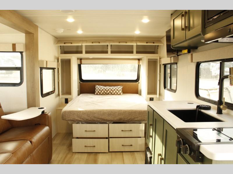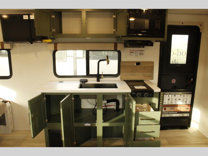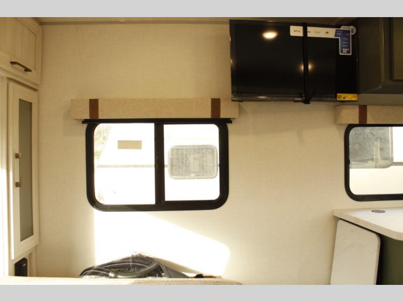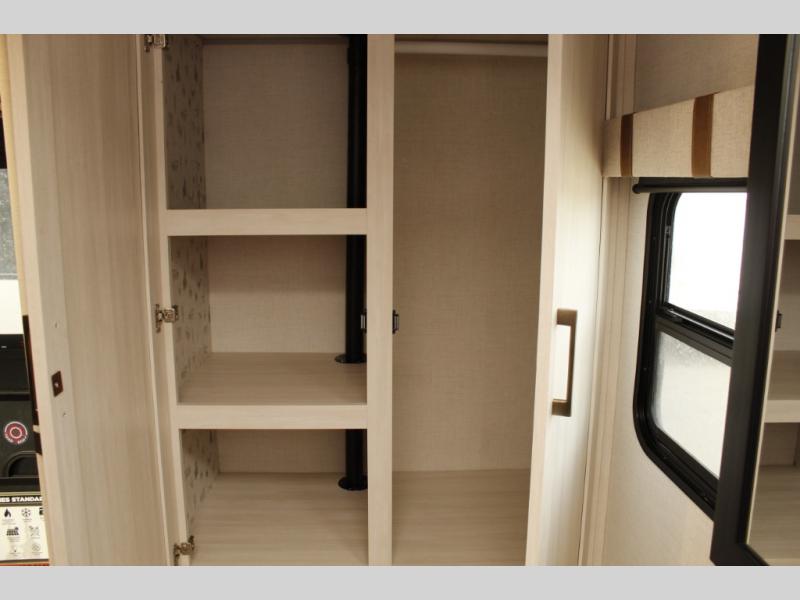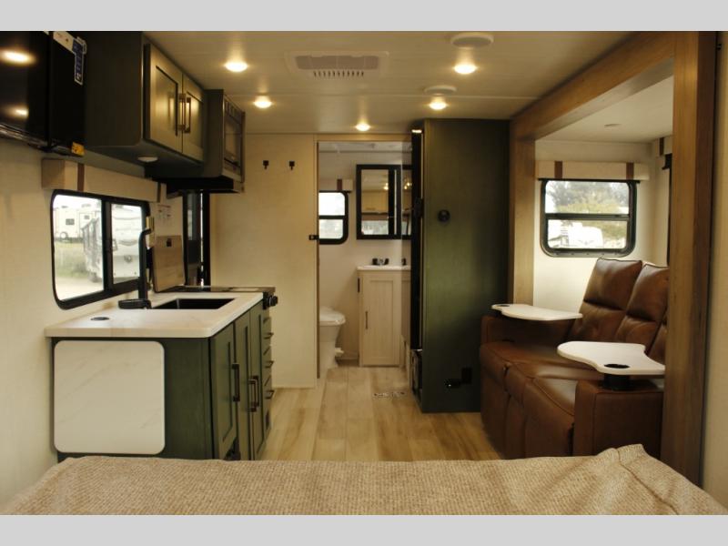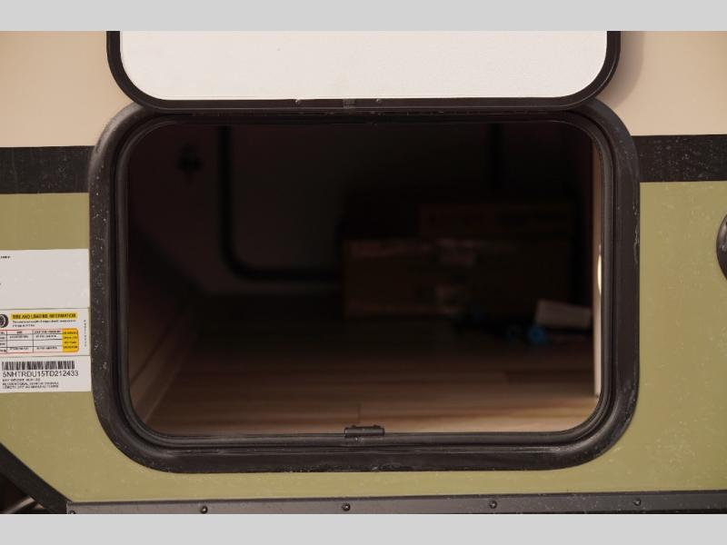 Make your camping dreams come true with this No Boundaries travel trailer! The kitchen has great amenities, like a cooktop and microwave oven, plus a refrigerator, and a sink to clean up, but you may just find yourselves cooking on the outside kitchen. A jackknife sofa slide will provide seating and sleeping space for a guest, while you take the front queen bed. There are dual bedside wardrobes to keep your clothes organized, and the exterior slam latch cargo doors include pass-thru lighting so you can easily find what you're looking for even at night!