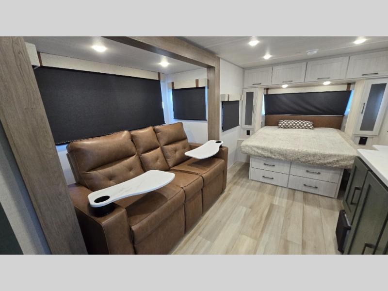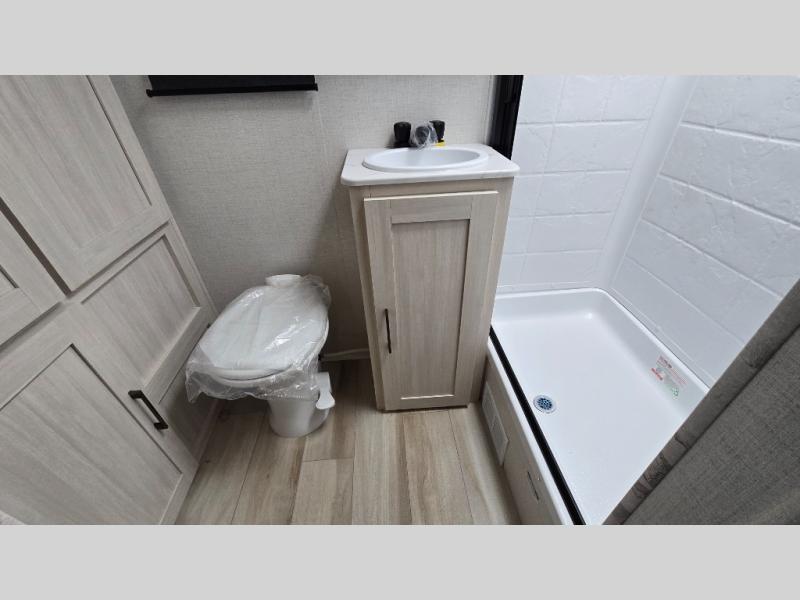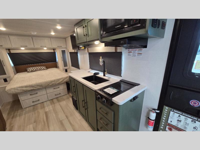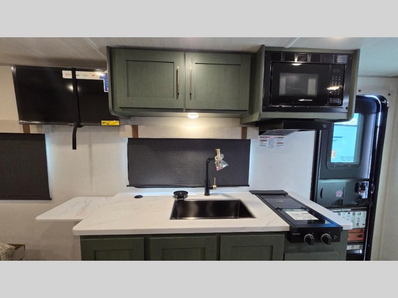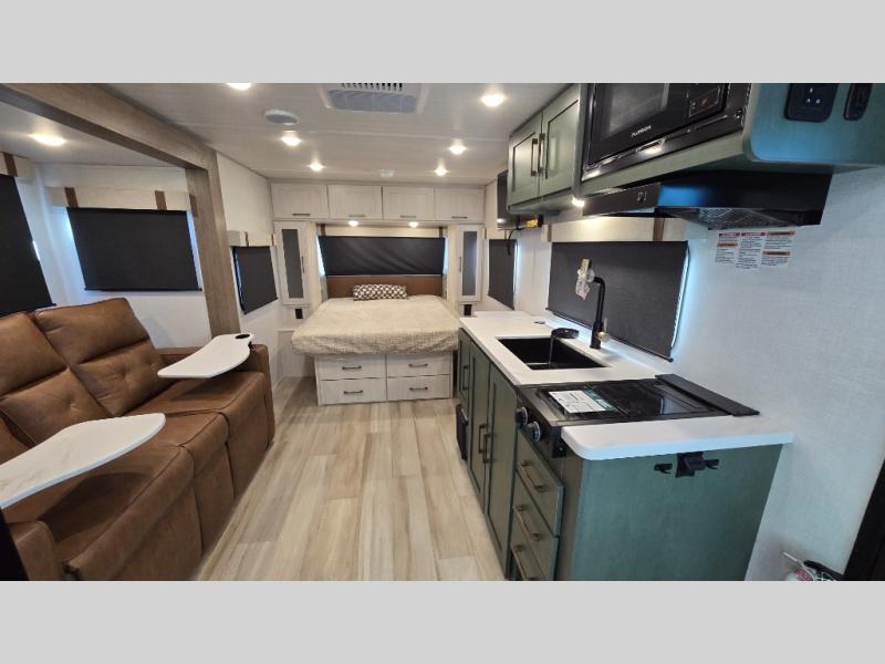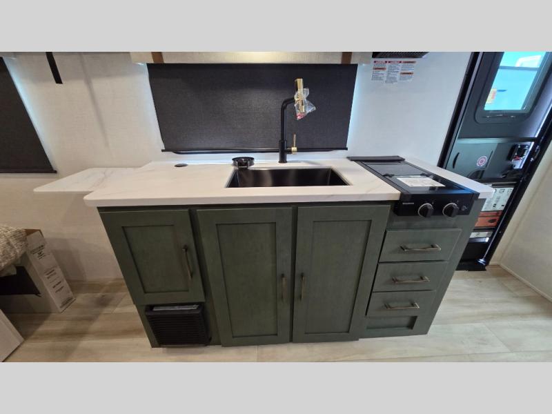 Make your camping dreams come true with this No Boundaries travel trailer! The kitchen has great amenities, like a cooktop and microwave, plus a refrigerator, and a sink to clean up, but you may just find yourselves cooking on the outside kitchen. A jackknife sofa slide will provide seating and sleeping space for a guest, while you take the front queen bed. There are dual bedside wardrobes to keep your clothes organized, and the exterior slam latch cargo doors include pass-thru lighting so you can easily find what you're looking for even at night! When the optional Beast Mode Package on this model is chosen, you'll enjoy a 400-watt solar package, a fresh water filter, a Maxxair roof vent cover, plus a Beast Mode independent suspension for better handling.