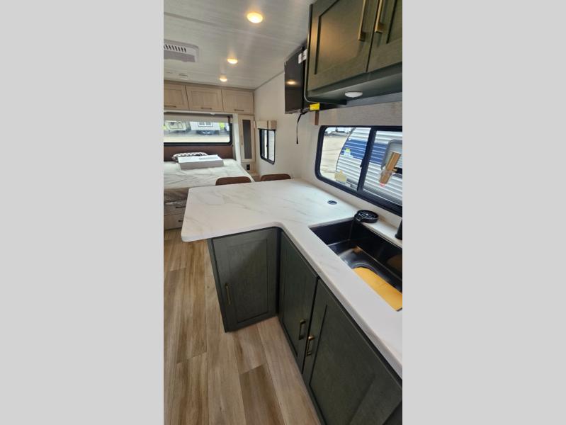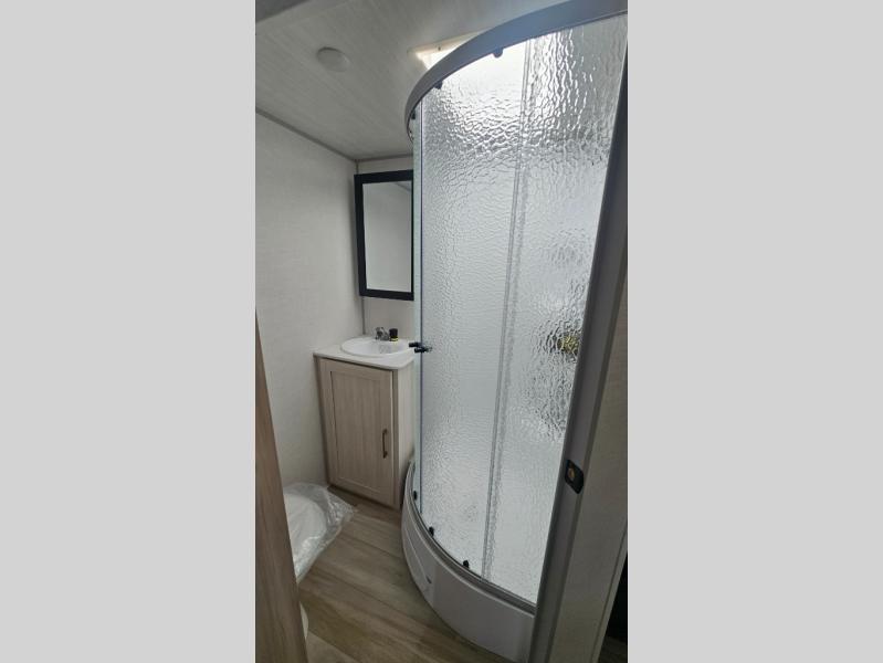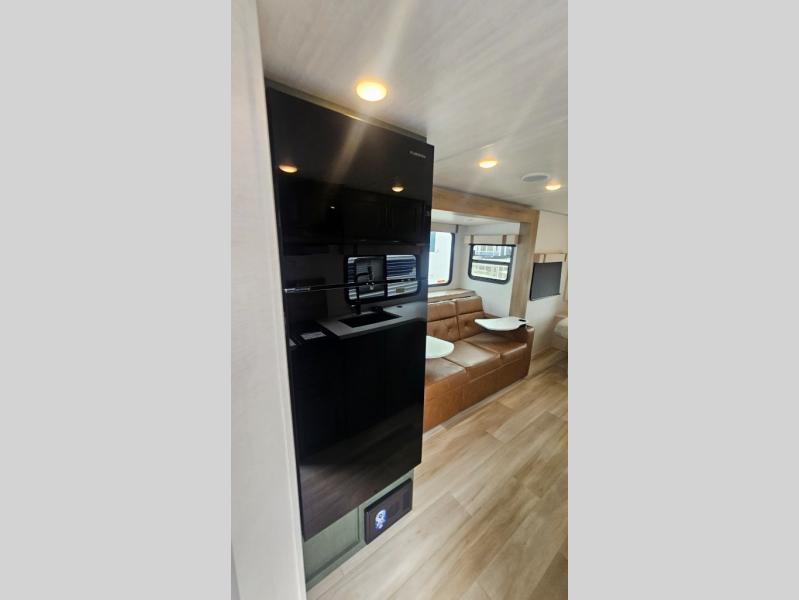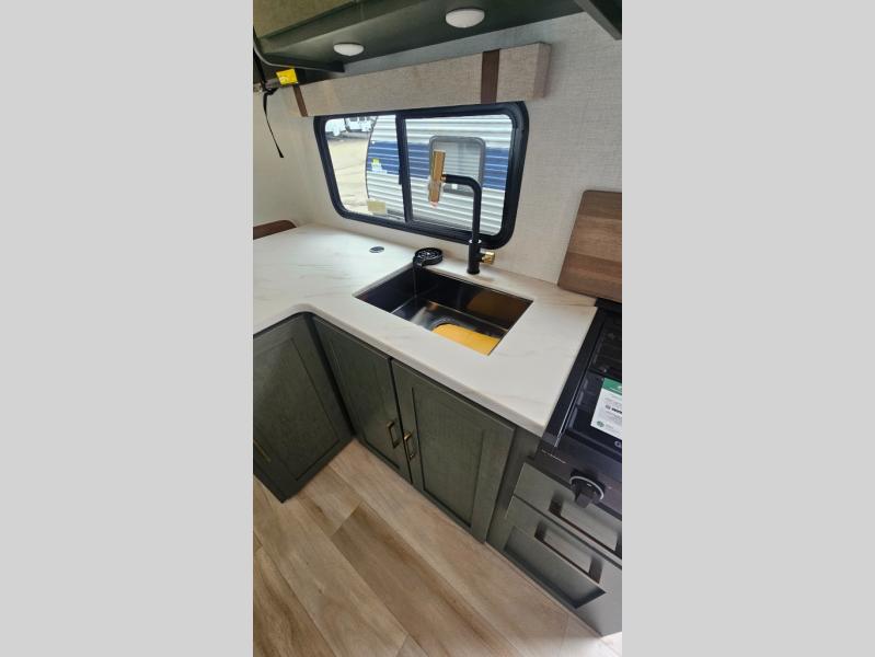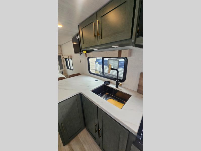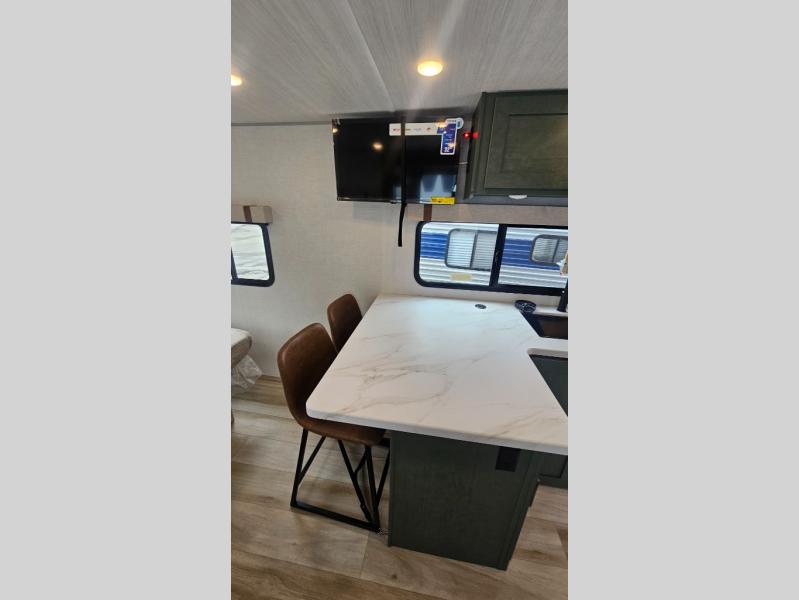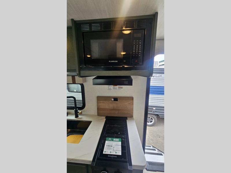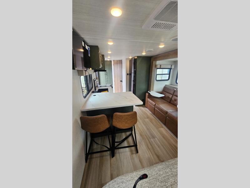 Make your camping dreams come true with this No Boundaries travel trailer! As you enter this unit, you'll notice an entryway pantry that you can use to store your coats and scarves, and the full bathroom is also right in front of the entry door for easy access when you need it. The kitchen has great amenities, like the cooktop and microwave, plus a refrigerator and a sink, and there is a breakfast bar with two stools to enjoy your coffee at each morning. And you'll sleep soundly each night on the front queen bed!