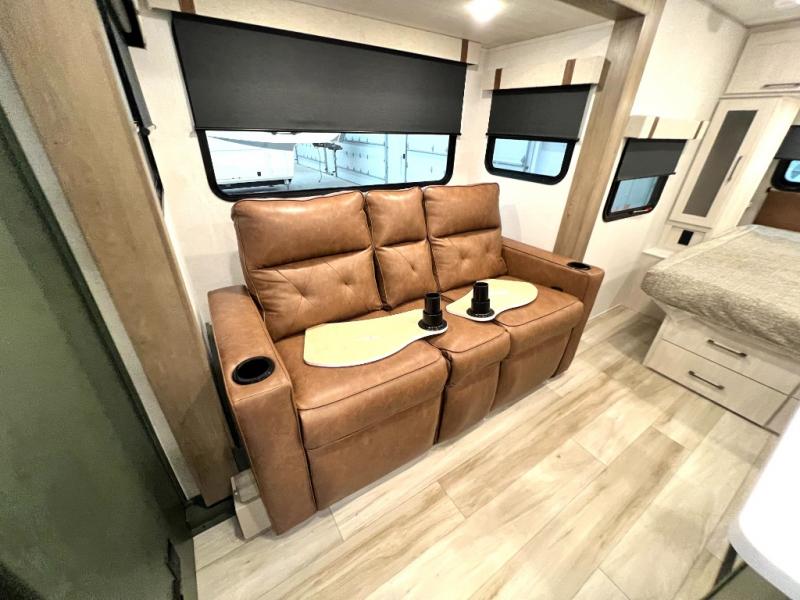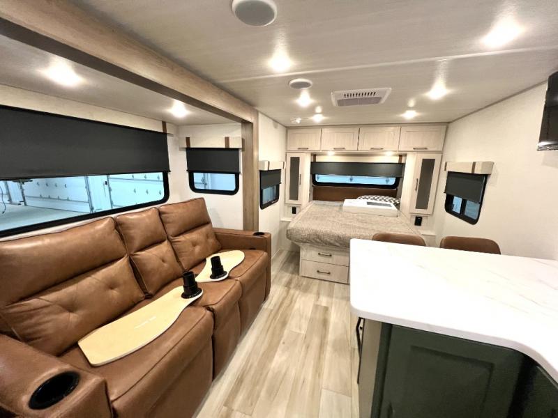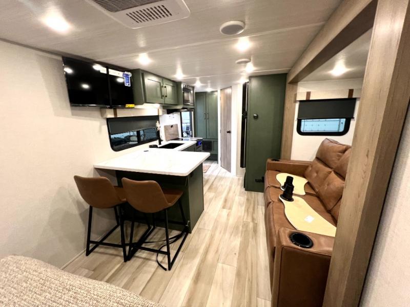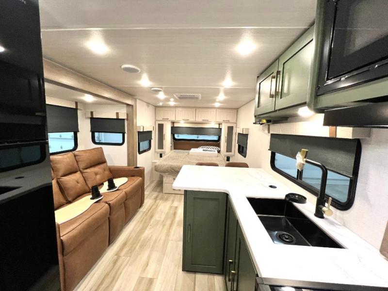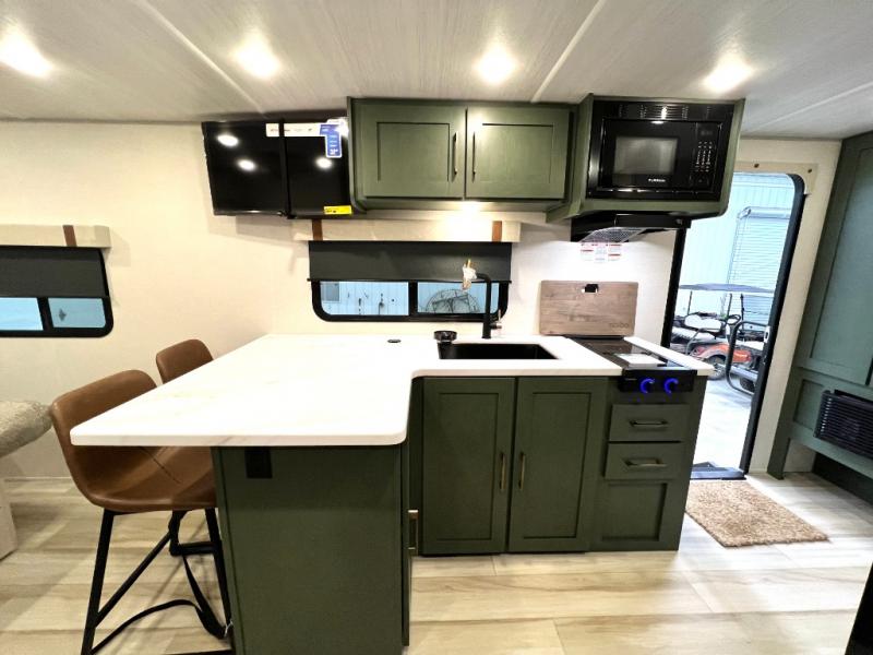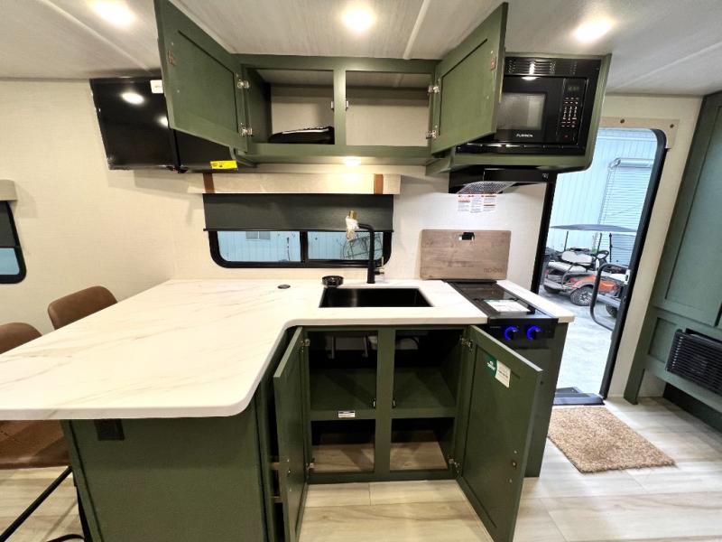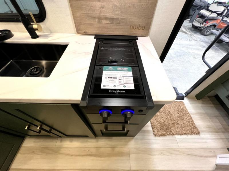 Make your camping dreams come true with this No Boundaries travel trailer! As you enter this unit, you'll notice an entryway pantry that you can use to store your coats and scarves, and the full bathroom is also right in front of the entry door for easy access when you need it. The kitchen has great amenities, like a cooktop and microwave oven, plus a pantry and refrigerator for food storage. And the front queen bed is sure to provide a great night's rest. When the optional Beast Mode Package on this model is chosen, you'll enjoy a 400-watt solar package, a fresh water filter, a Maxxair roof vent cover, plus a Beast Mode independent suspension for better handling.