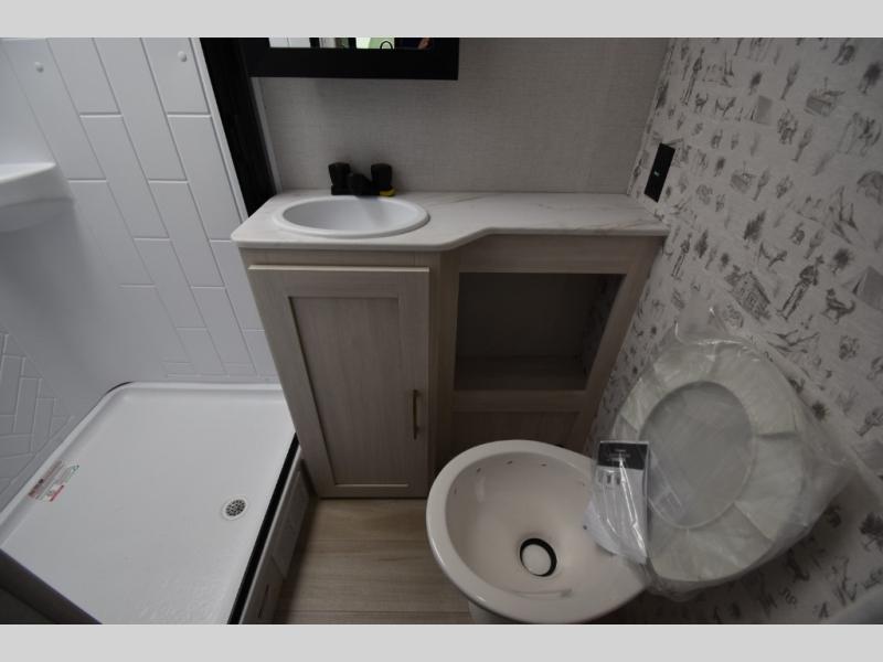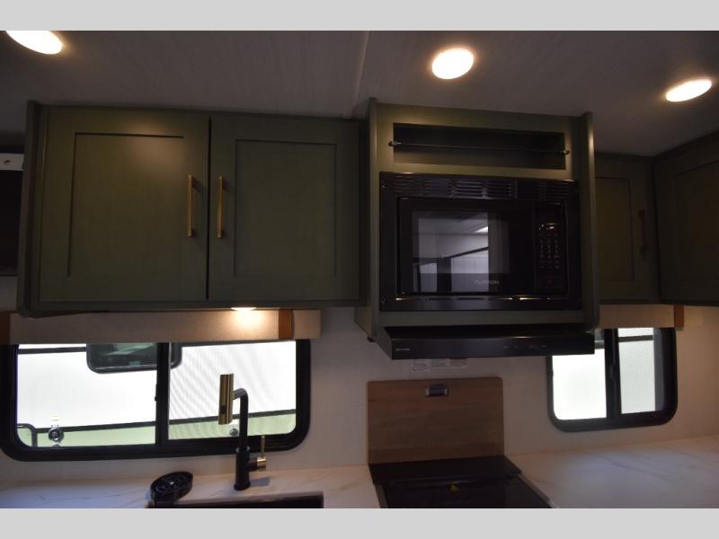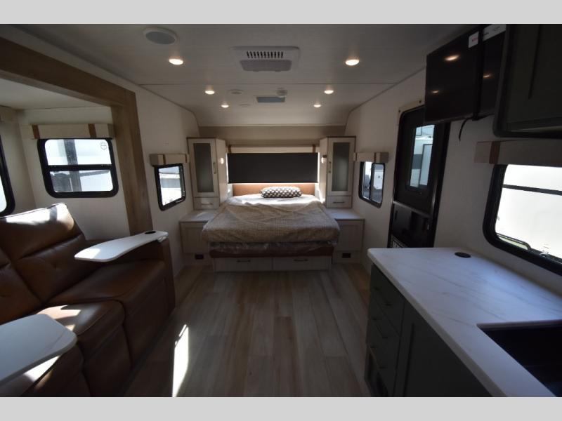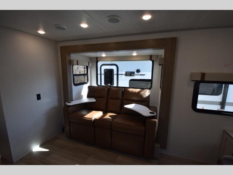 You'll love the versatility and space you'll have in this couple's trailer! The front Murphy bed provides seating and sleeping space, and the wardrobes will help keep your items organized. There is a jackknife sofa slide out to relax on, or you may just find yourselves outdoors under the patio awning. An optional theater seat option can be chosen in place of the jackknife sofa if you'd prefer that type of seating. A full kitchen lets you cook and store meals while at the campground, and the full bath on board means you won't have to use the camp's facilities!