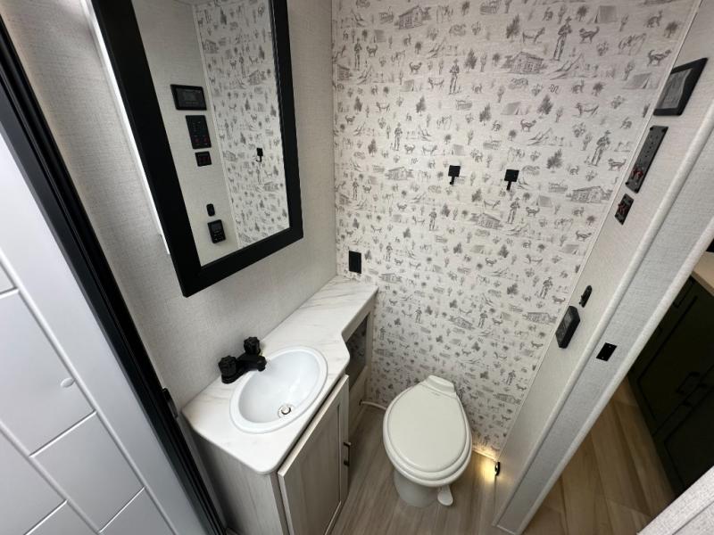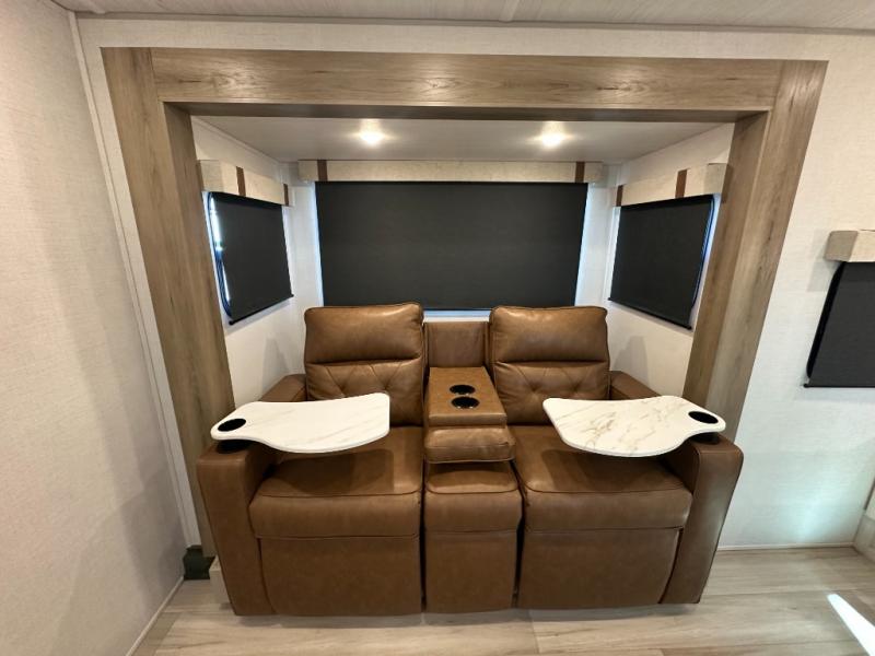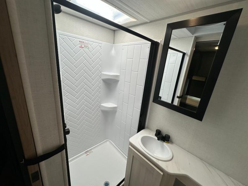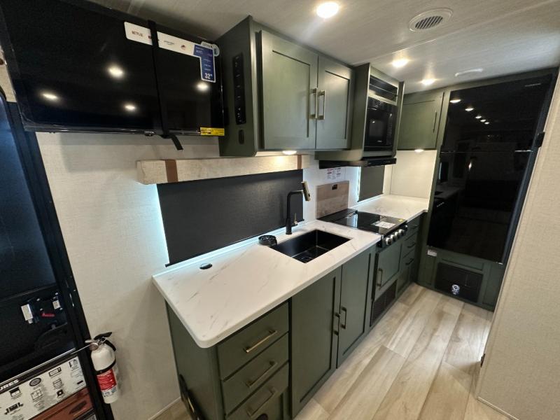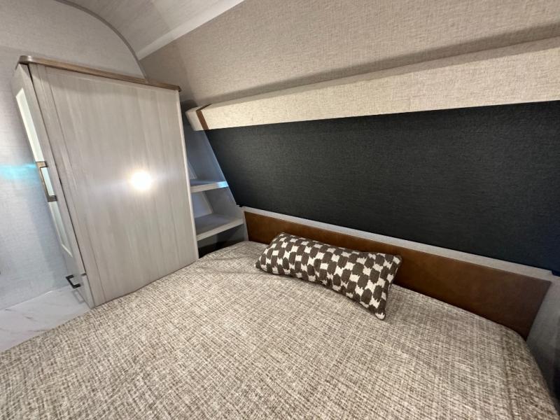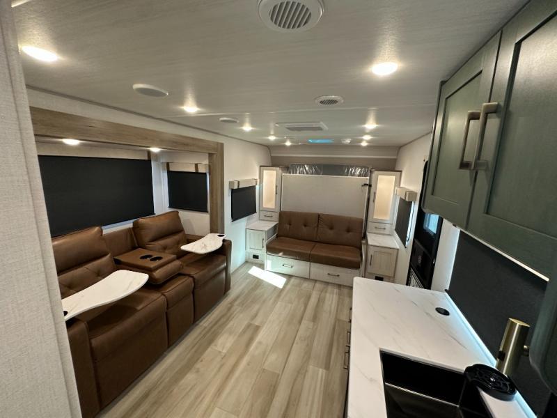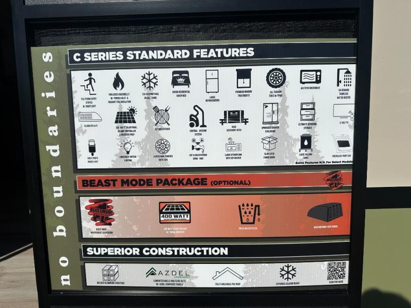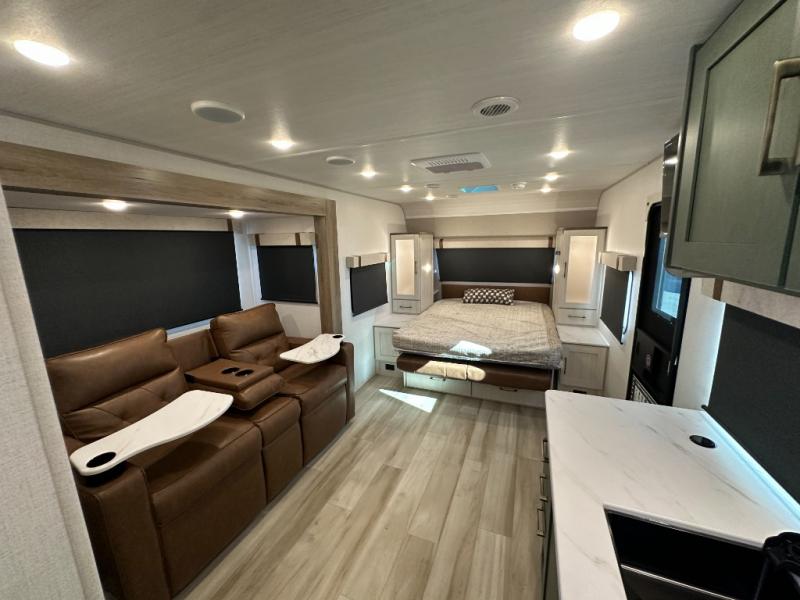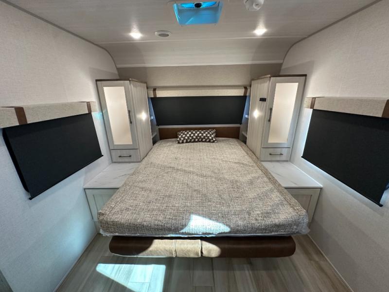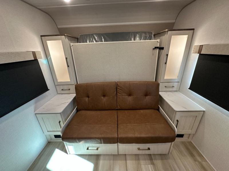 You'll love the versatility and space you'll have in this couple's trailer! The front Murphy bed provides seating and sleeping space, and the wardrobes will help keep your items organized. There is a jackknife sofa slide out to relax on, or you may just find yourselves outdoors under the patio awning. An optional theater seat option can be chosen in place of the jackknife sofa if you'd prefer that type of seating. A full kitchen lets you cook and store meals while at the campground, and the full bath on board means you won't have to use the camp's facilities! When the optional Beast Mode Package on this model is chosen, you'll enjoy a 400-watt solar package, a fresh water filter, a Maxxair roof vent cover, plus a Beast Mode independent suspension for better handling.