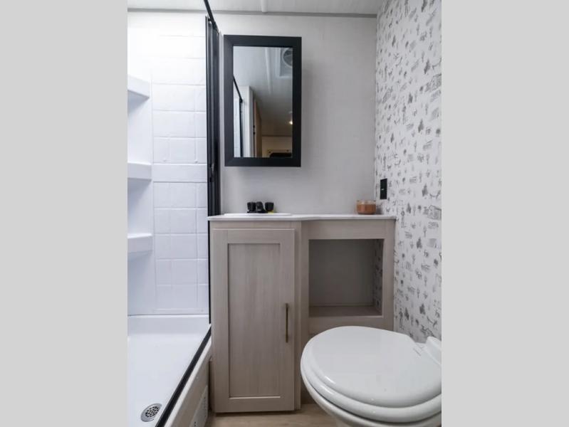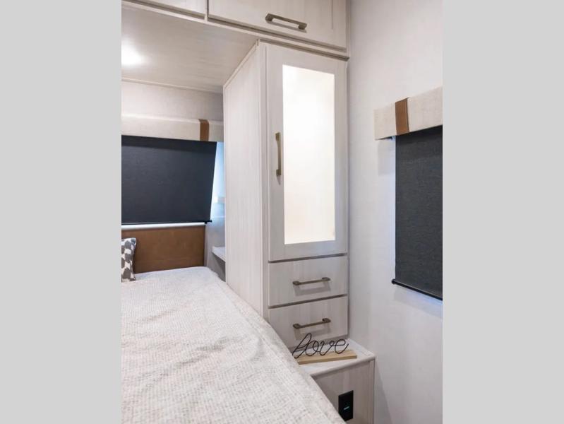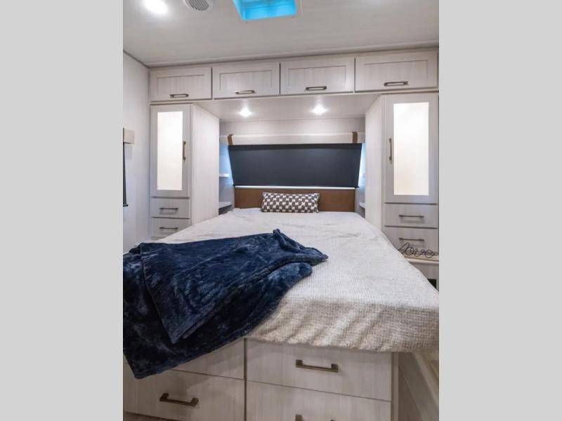 You'll love camping in this couple's trailer! There is a queen bed in the front bedroom, along with dual bedside wardrobes and overhead storage for clothes, books and more. Once you've made breakfast in the full kitchen or on the outside kitchen, you can dine at the bar top with chairs and a flip-up window. There is also theater seating across from a 12V TV to enjoy movie nights! The full bath lets you clean up each day, and you'll love the amount of storage in this trailer, including a walk-in pantry for dry goods, snacks and more!