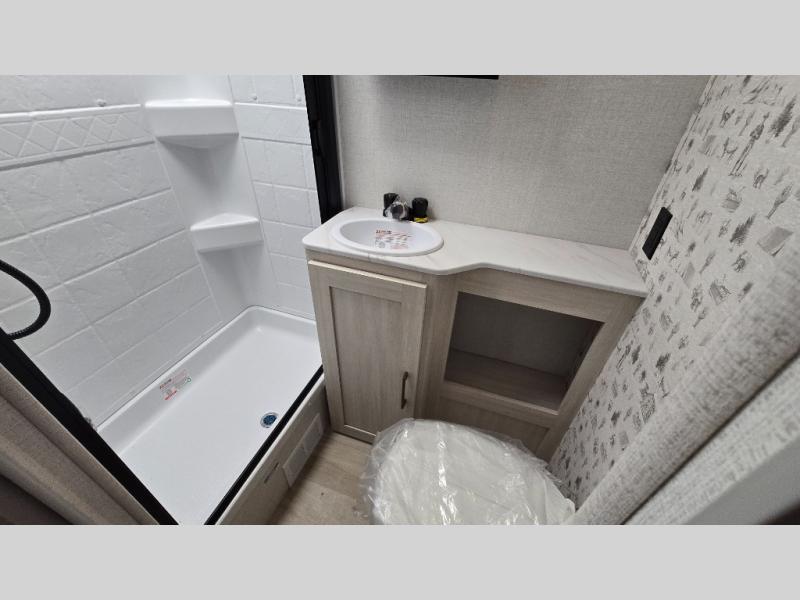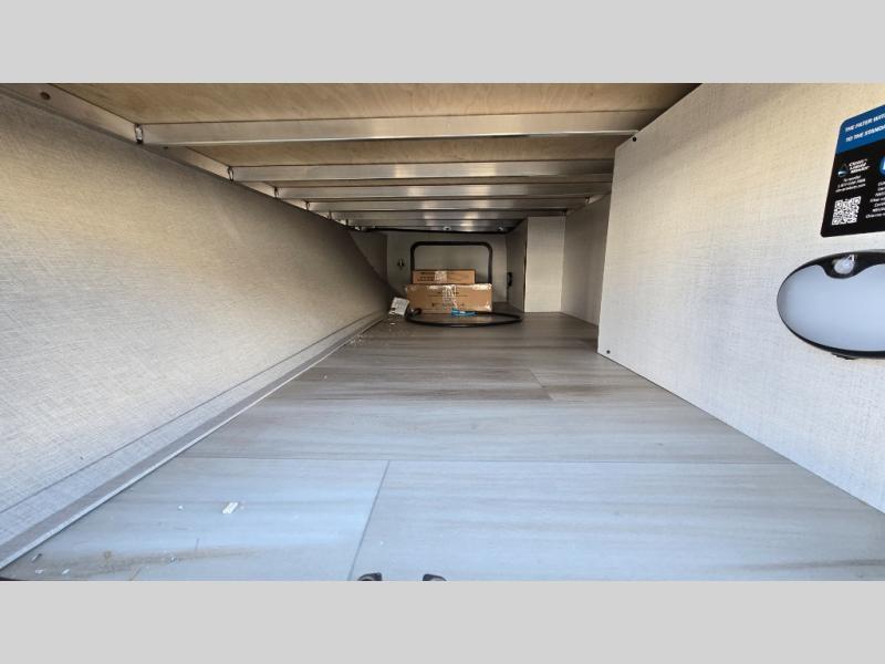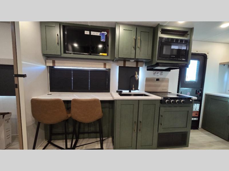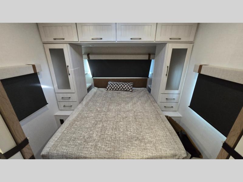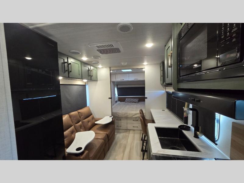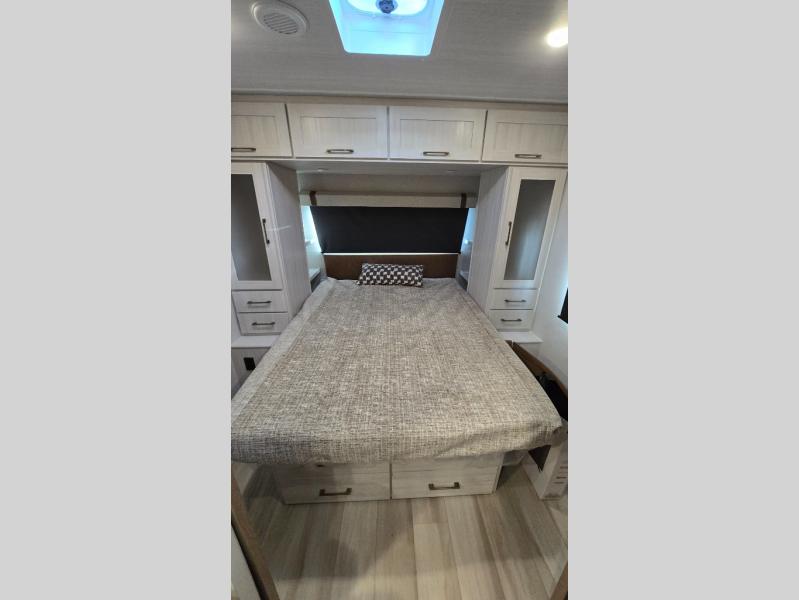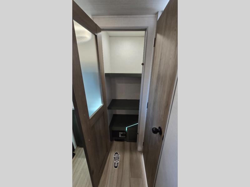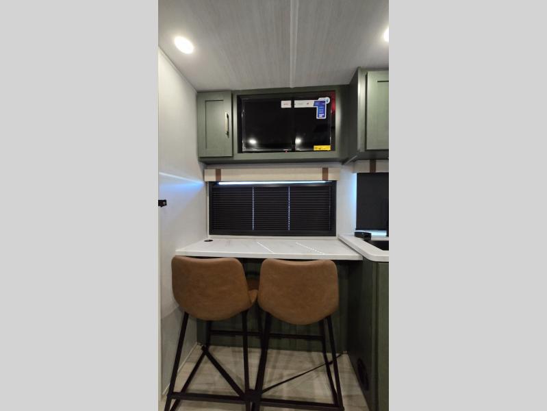 You'll love camping in this couple's trailer! There is a queen bed in the front bedroom, along with dual bedside wardrobes and overhead storage for clothes, books and more. Once you've made breakfast in the full kitchen or on the outside kitchen, you can dine at the bar top with chairs and a flip-up window. There is also theater seating across from a 12V TV to enjoy movie nights! The full bath lets you clean up each day, and you'll love the amount of storage in this trailer, including a walk-in pantry for dry goods, snacks and more!