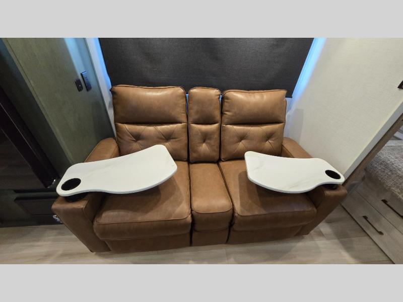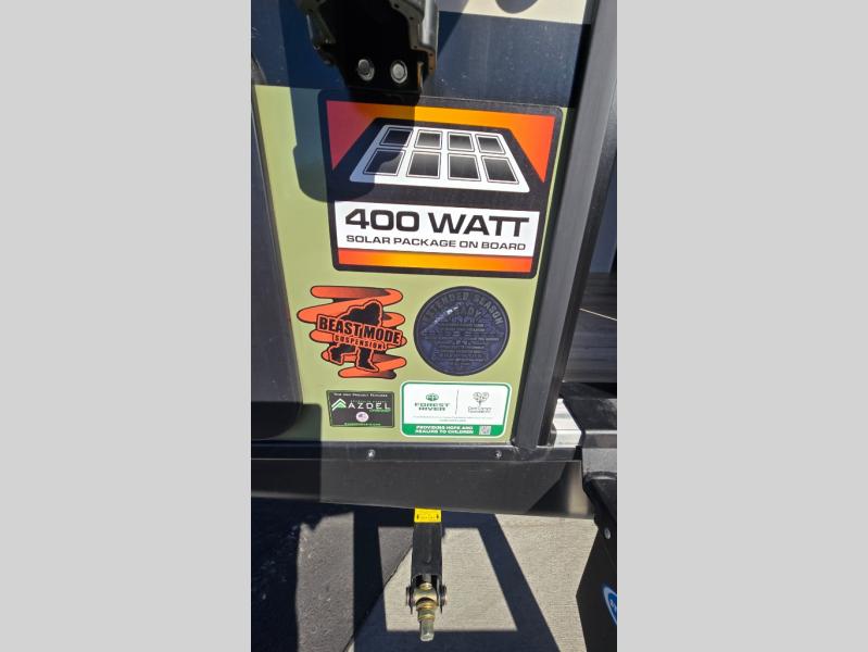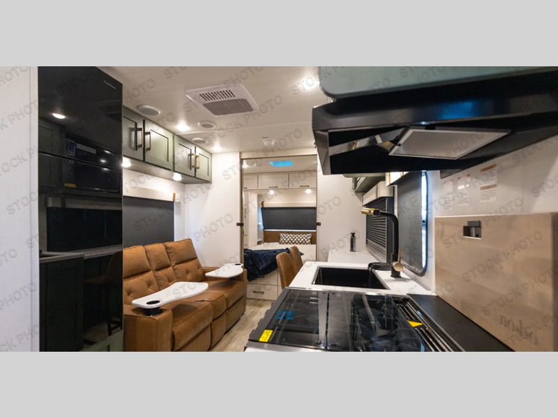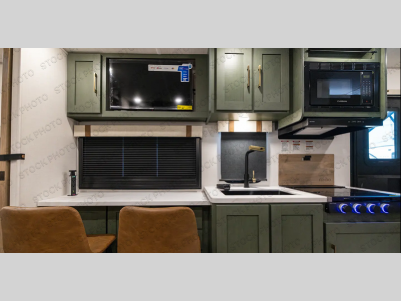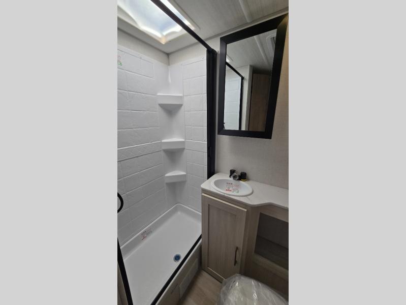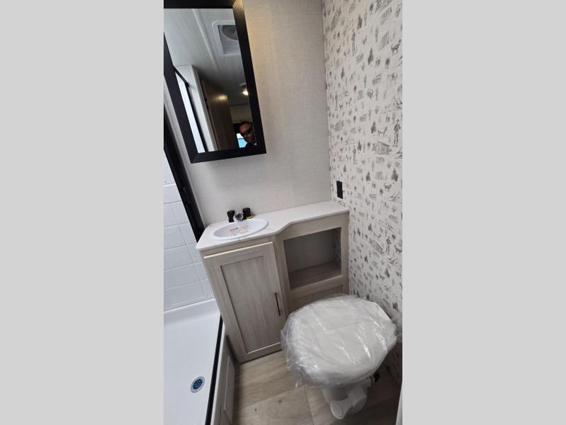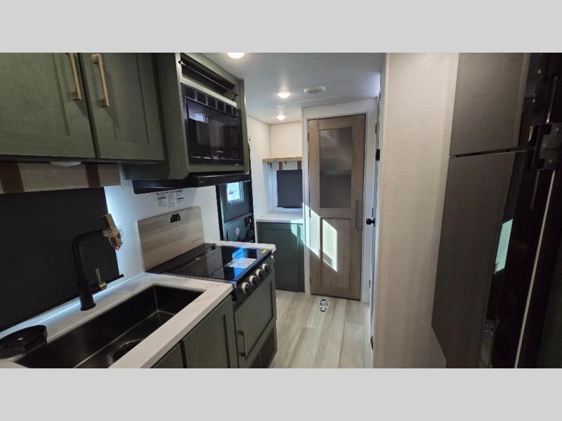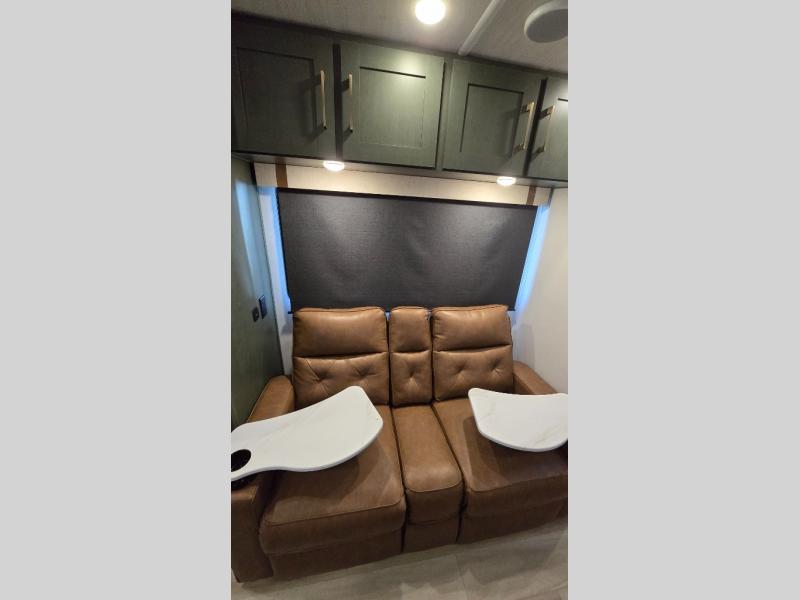 You'll love camping in this couple's trailer! There is a queen bed in the front bedroom, along with dual bedside wardrobes and overhead storage for clothes, books and more. Once you've made breakfast in the full kitchen or on the outside kitchen, you can dine at the bar top with chairs and a flip-up window. There is also theater seating across from a 12V TV to enjoy movie nights! The full bath lets you clean up each day, and you'll love the amount of storage in this trailer, including a walk-in pantry for dry goods, snacks and more!