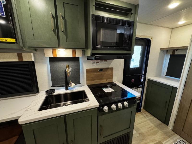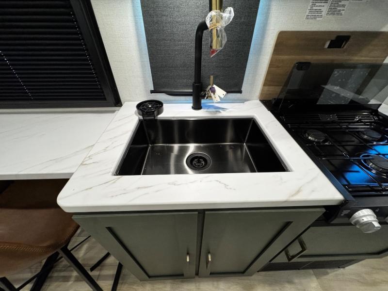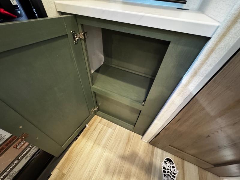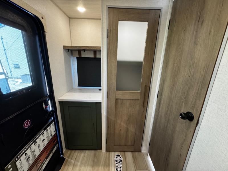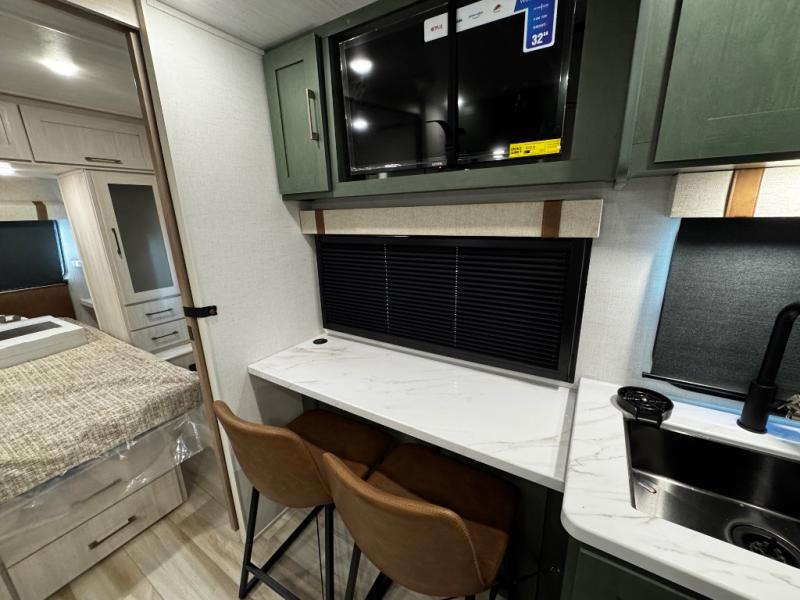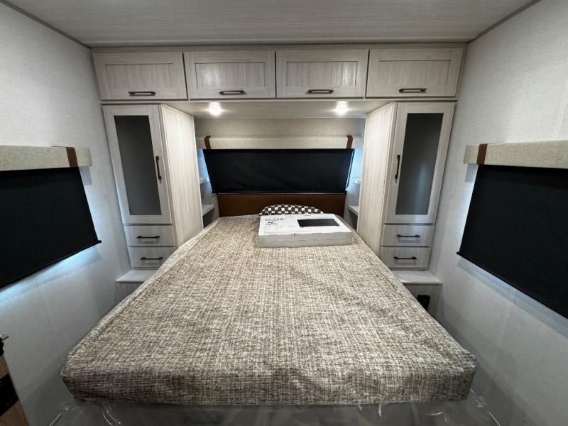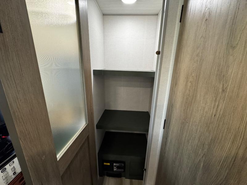 You'll love camping in this couple's trailer! There is a queen bed in the front bedroom, along with dual bedside wardrobes and overhead storage for clothes, books and more. Once you've made breakfast in the full kitchen or on the outside kitchen, you can dine at the bar top with chairs and a flip-up window. There is also theater seating to relax in comfort each day! The full bath lets you clean up each day, and you'll love the amount of storage in this trailer, including a walk-in pantry for dry goods, snacks and more!