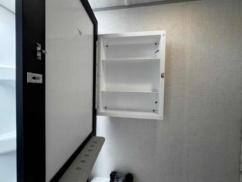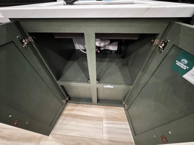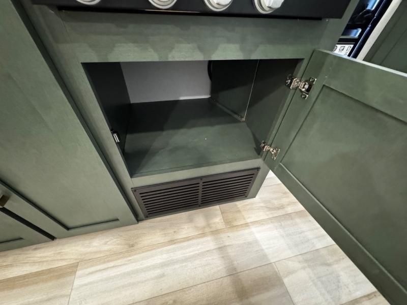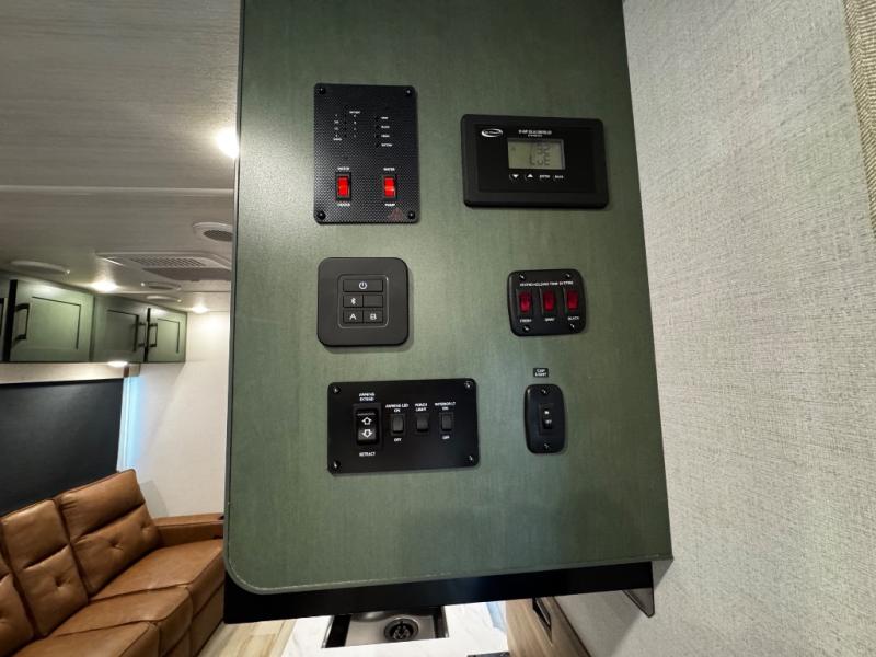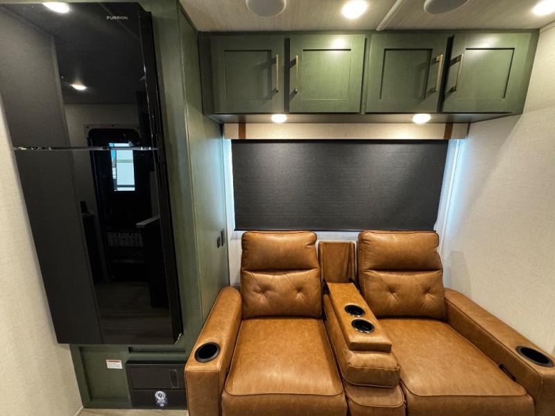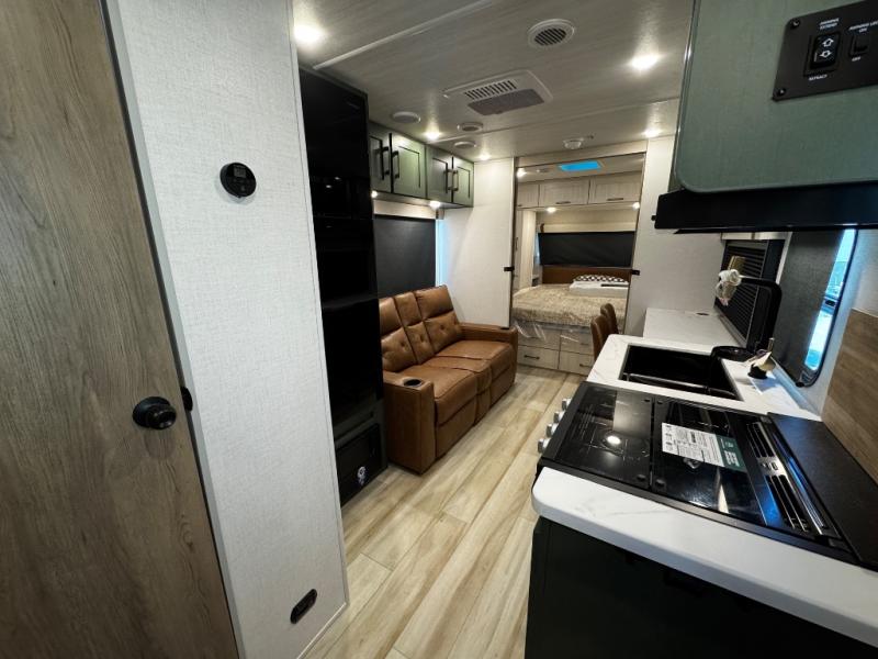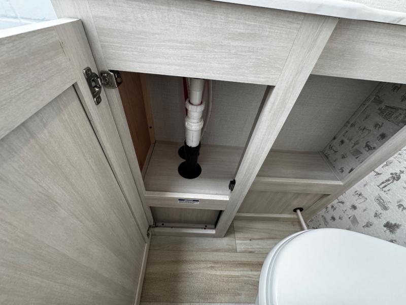 You'll love camping in this couple's trailer! There is a queen bed in the front bedroom, along with dual bedside wardrobes and overhead storage for clothes, books and more. Once you've made breakfast in the full kitchen or on the outside kitchen, you can dine at the bar top with chairs and a flip-up window. There is also theater seating to relax in comfort each day! The full bath lets you clean up each day, and you'll love the amount of storage in this trailer, including a walk-in pantry for dry goods, snacks and more!