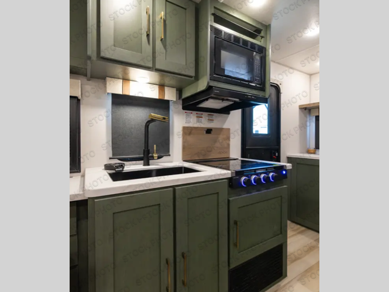 You'll love camping in this couple's trailer! There is a queen bed in the front bedroom, along with dual bedside wardrobes and overhead storage for clothes, books and more. Once you've made breakfast in the full kitchen or on the outside kitchen, you can dine at the bar top with chairs and a flip-up window. There is also theater seating to relax in comfort each day! The full bath lets you clean up each day, and you'll love the amount of storage in this trailer, including a walk-in pantry for dry goods, snacks and more. When the optional Beast Mode Package is chosen with this model, you'll find a Beast Mode independent suspension, an additional 200-watt solar panel, a fresh water filter and more!