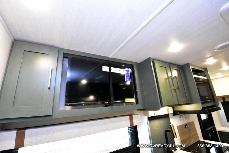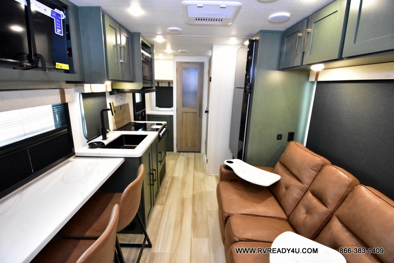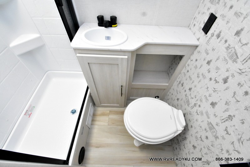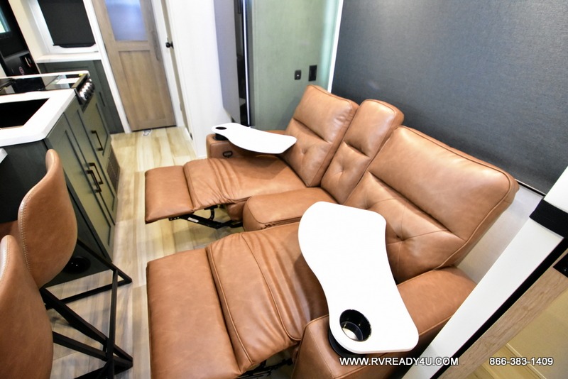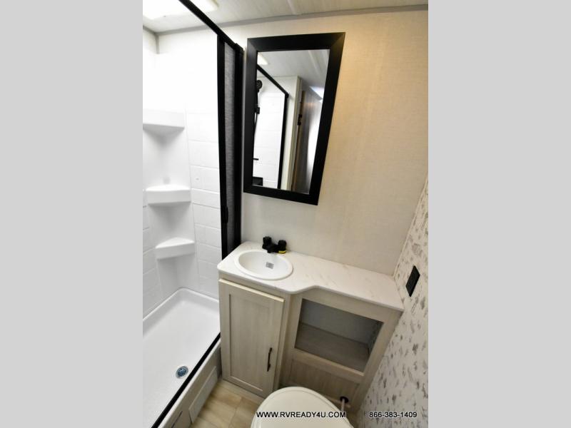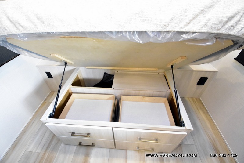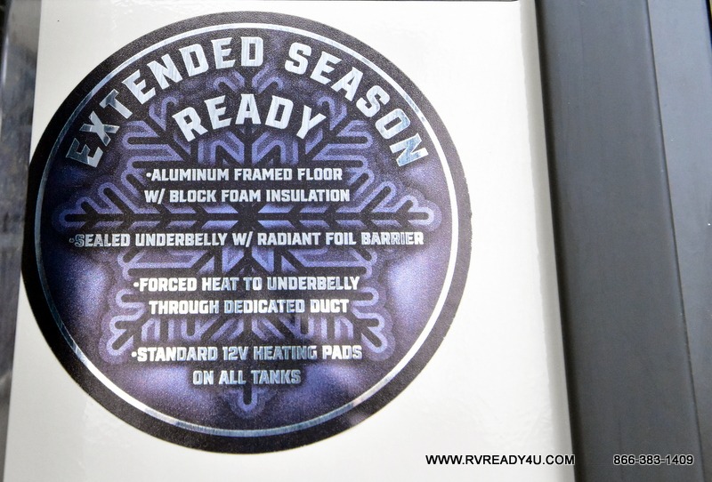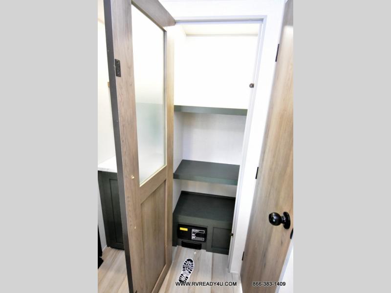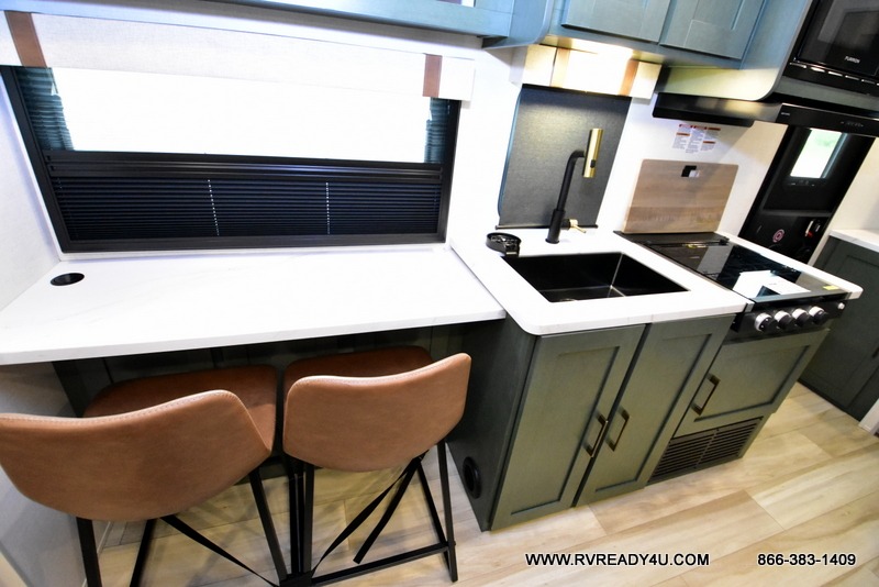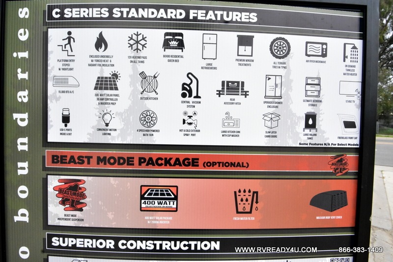 You'll love camping in this couple's trailer! There is a queen bed in the front bedroom, along with dual bedside wardrobes and overhead storage for clothes, books and more. Once you've made breakfast in the full kitchen or on the outside kitchen, you can dine at the bar top with chairs and a flip-up window. There is also theater seating to relax in comfort each day! The full bath lets you clean up each day, and you'll love the amount of storage in this trailer, including a walk-in pantry for dry goods, snacks and more. When the optional Beast Mode Package is chosen with this model, you'll find a Beast Mode independent suspension, an additional 200-watt solar panel, a fresh water filter and more!
