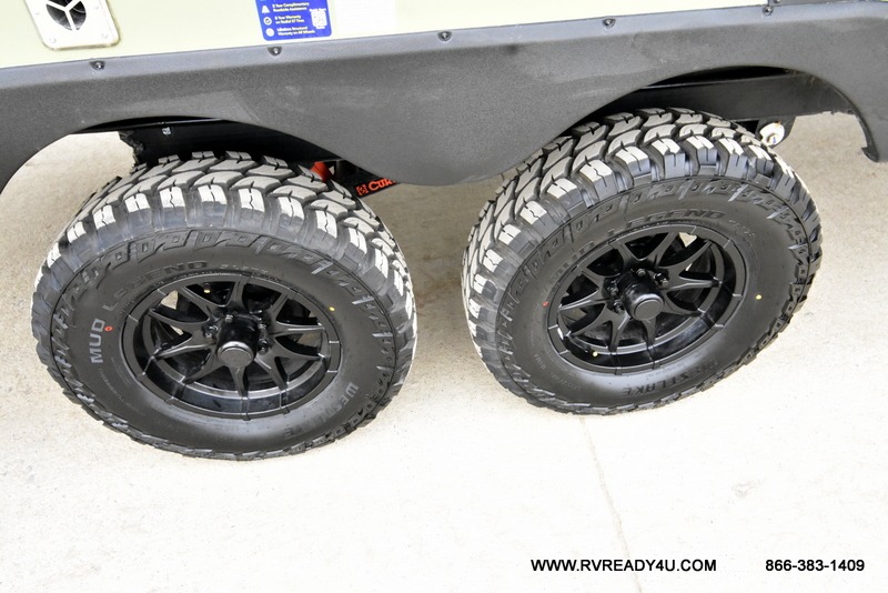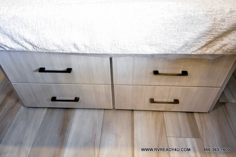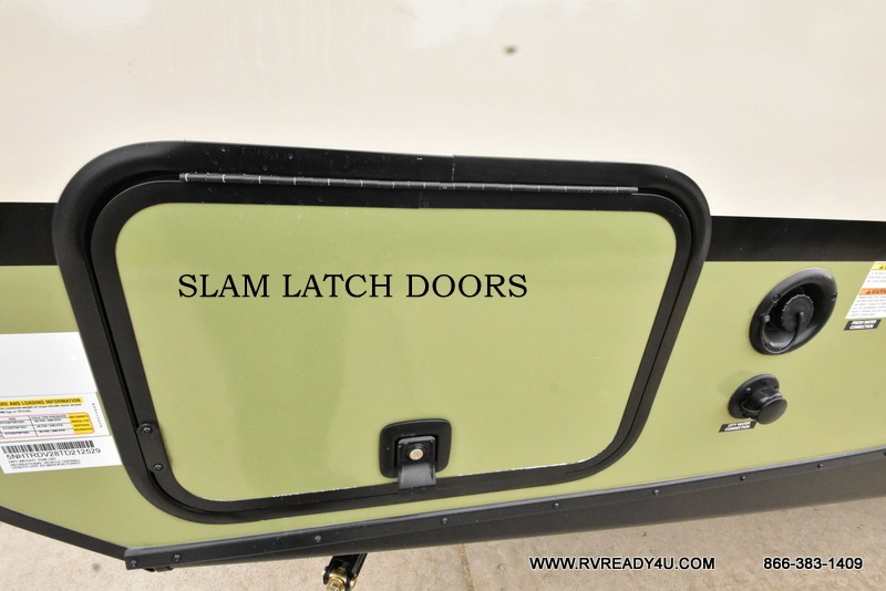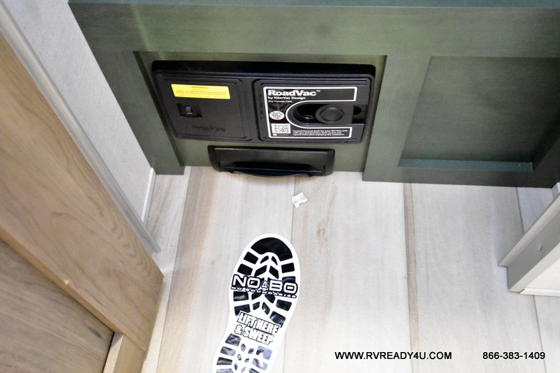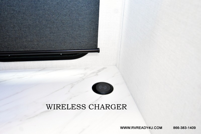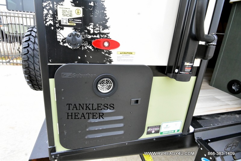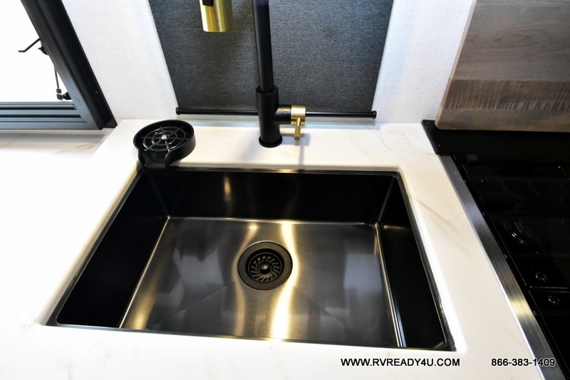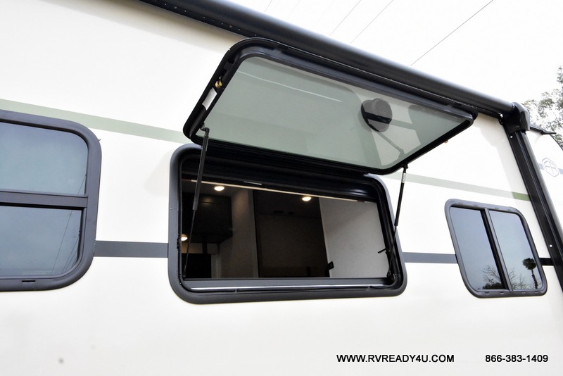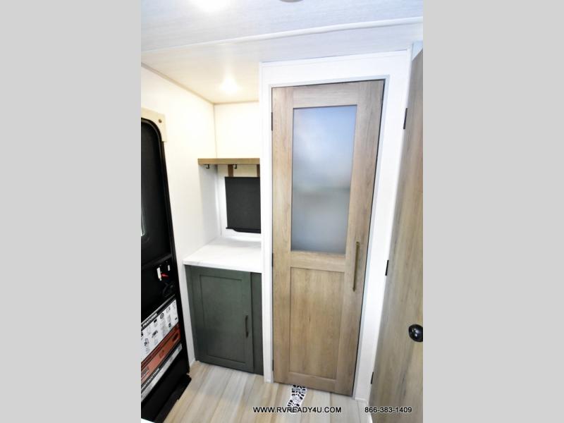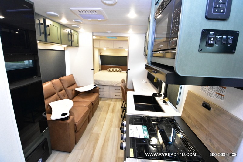 You'll love camping in this couple's trailer! There is a queen bed in the front bedroom, along with dual bedside wardrobes and overhead storage for clothes, books and more. Once you've made breakfast in the full kitchen or on the outside kitchen, you can dine at the bar top with chairs and a flip-up window. There is also theater seating to relax in comfort each day! The full bath lets you clean up each day, and you'll love the amount of storage in this trailer, including a walk-in pantry for dry goods, snacks and more. When the optional Beast Mode Package is chosen with this model, you'll find a Beast Mode independent suspension, an additional 200-watt solar panel, a fresh water filter and more!