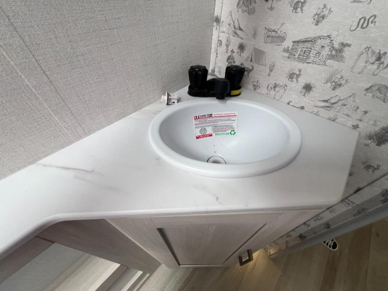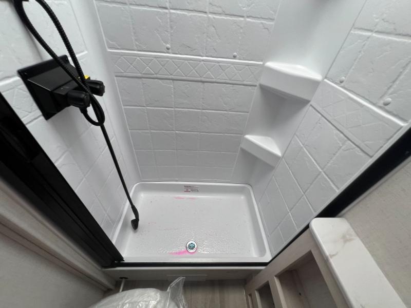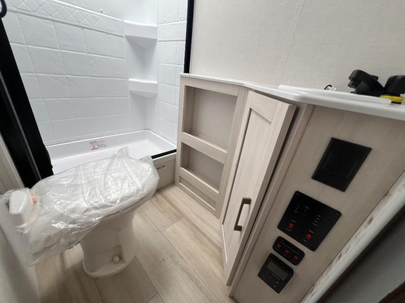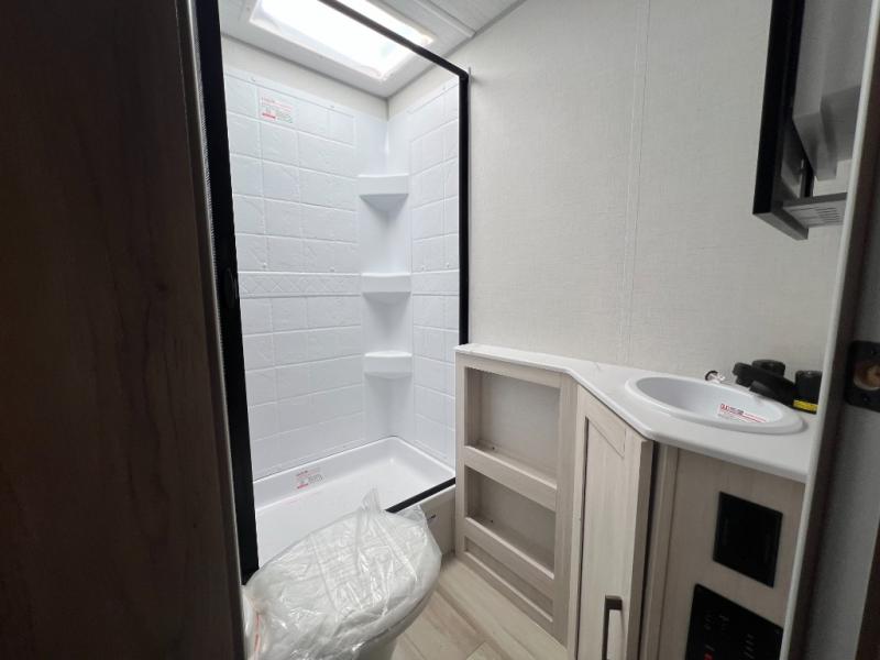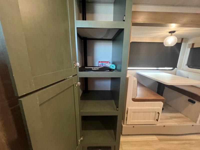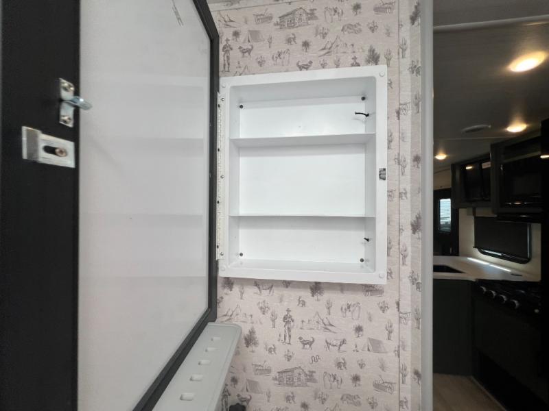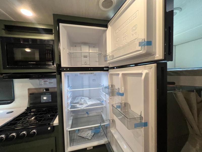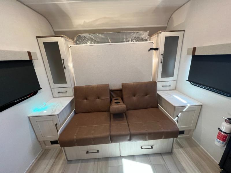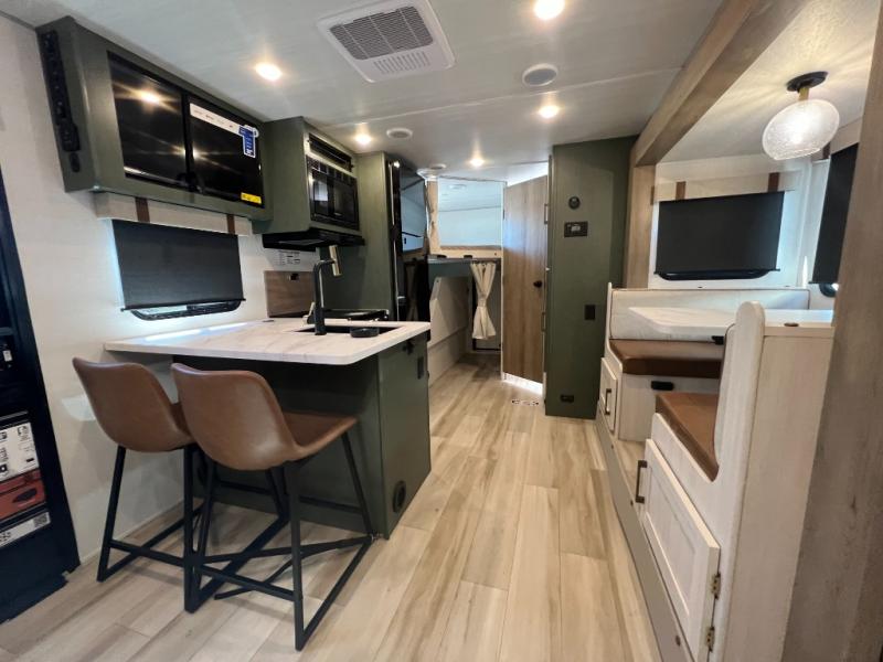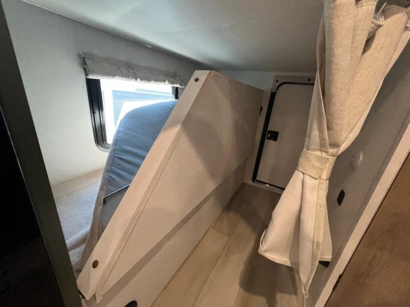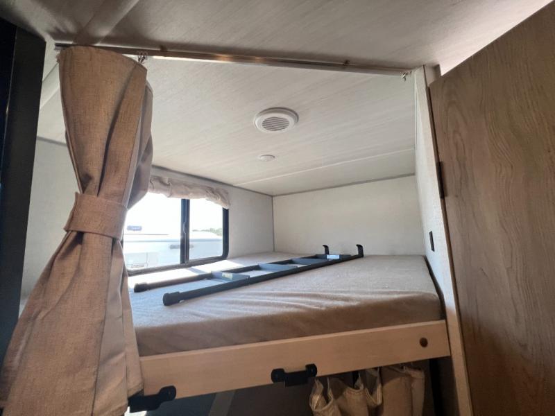 Pack up this very versatile Murphy bed travel trailer and head out to explore! You will love the space saving aspect that a Murphy bed gives you by not increasing the tow length in order to give you a separate bedroom and living space, and you don't even have to make the bed, just fold it up into the wall in the morning! Double-size bunks in the rear corner are perfect for accommodating both children and adults. The kitchen offers everything a cook would need to feed the whole gang and there is even a counter bar area with two stools which will be perfect for breakfast time. There is a booth dinette slide for more dining space, or a place to enjoy a board game or card game when you are inside.