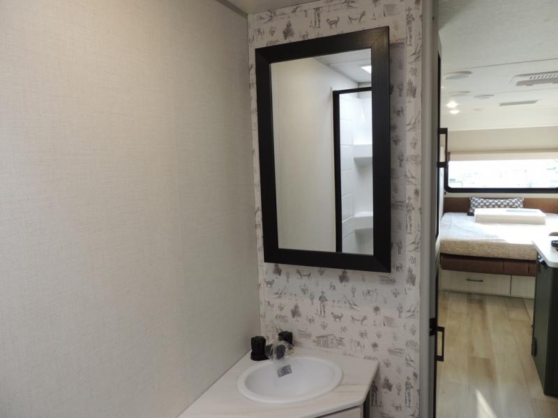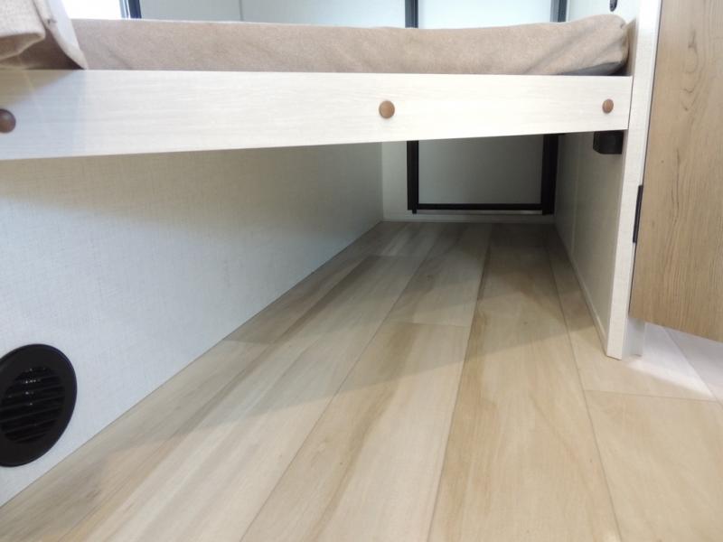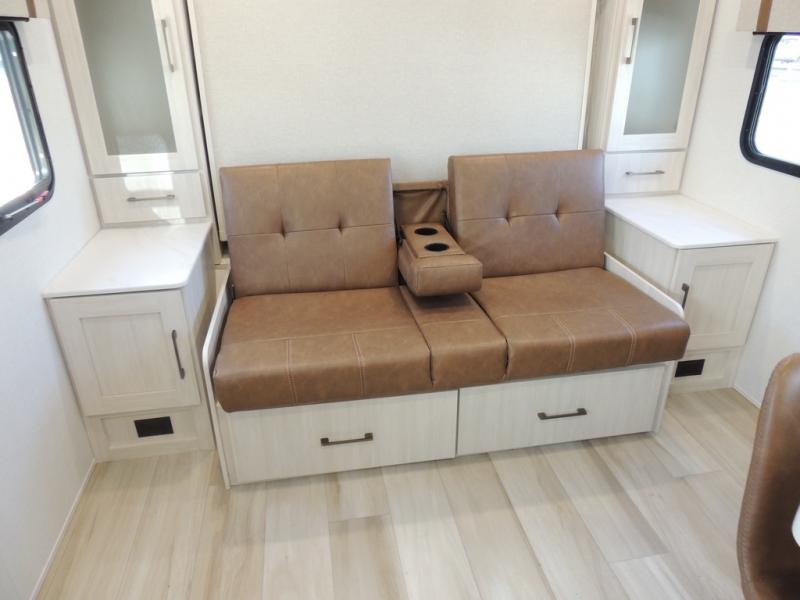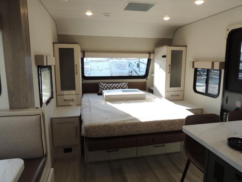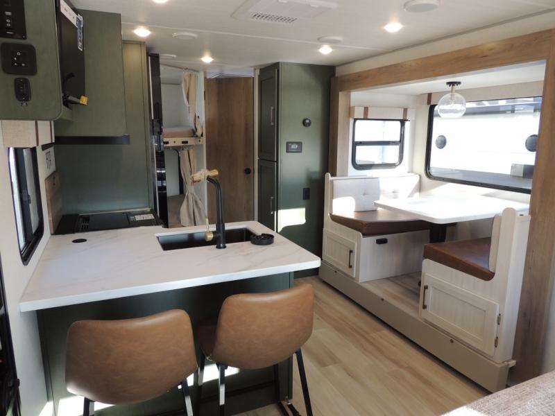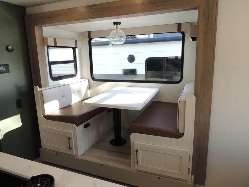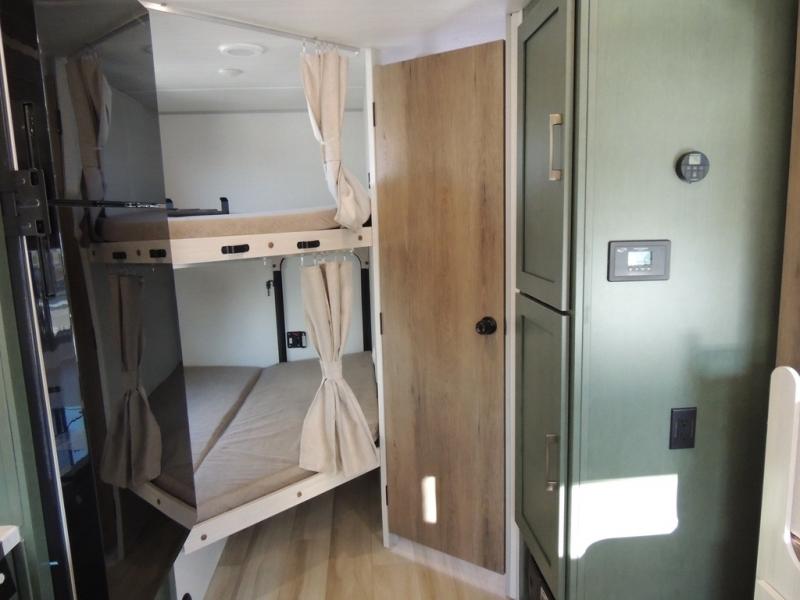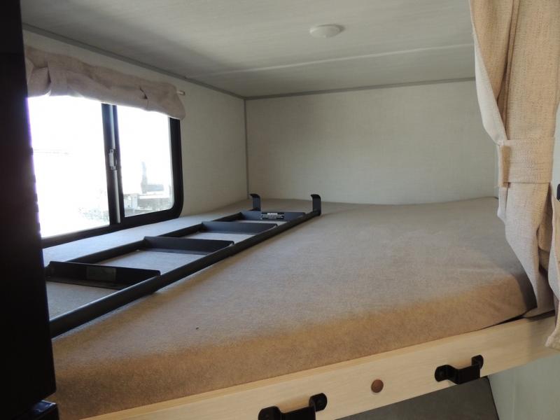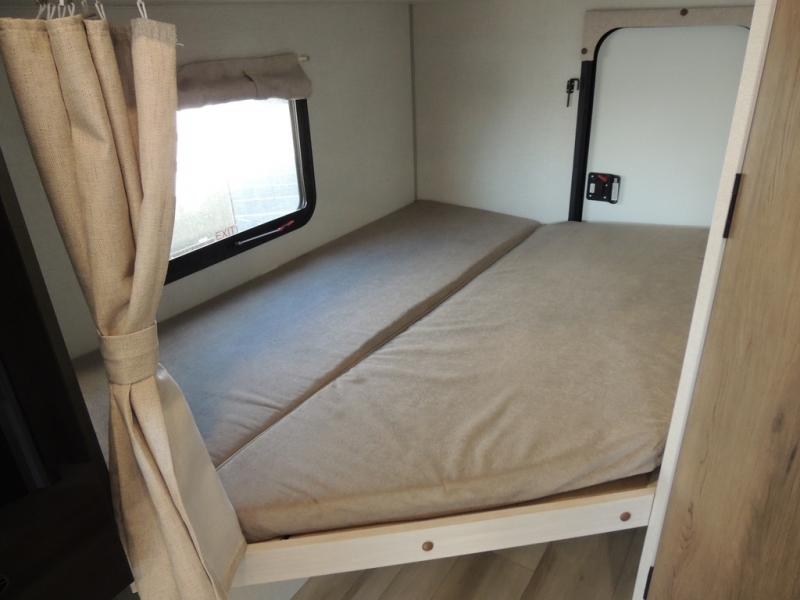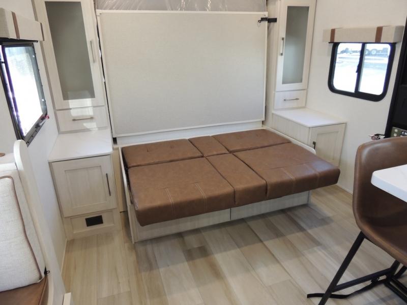 Pack up this very versatile Murphy bed travel trailer and head out to explore! You will love the space saving aspect that a Murphy bed gives you by not increasing the tow length in order to give you a separate bedroom and living space, and you don't even have to make the bed, just fold it up into the wall in the morning! Double-size bunks in the rear corner are perfect for accommodating both children and adults. The kitchen offers everything a cook would need to feed the whole gang and there is even a counter bar area with two stools which will be perfect for breakfast time. There is a booth dinette slide for more dining space, or a place to enjoy a board game or card game when you are inside.
