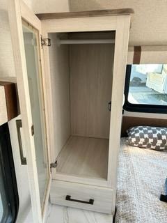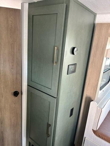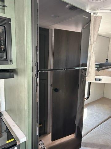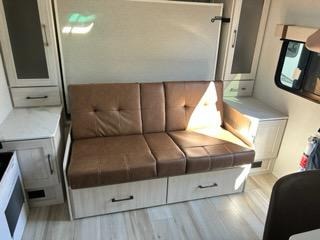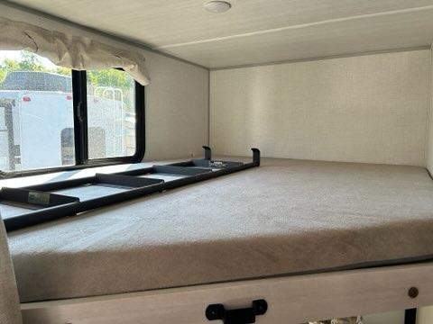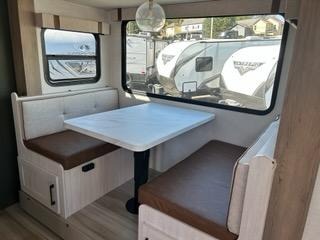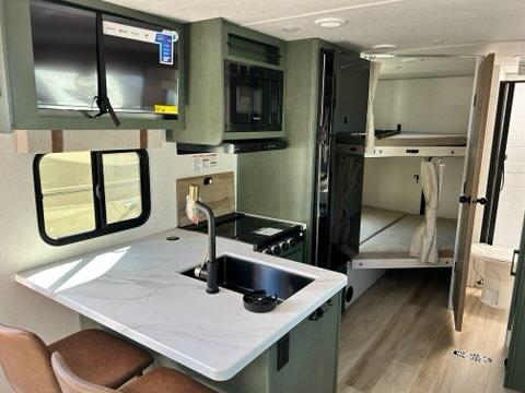 Pack up this very versatile Murphy bed travel trailer and head out to explore! You will love the space saving aspect that a Murphy bed gives you by not increasing the tow length in order to give you a separate bedroom and living space, and you don't even have to make the bed, just fold it up into the wall in the morning! Double-size bunks in the rear corner are perfect for accommodating both children and adults. The kitchen offers everything a cook would need to feed the whole gang and there is even a counter bar area with two stools which will be perfect for breakfast time. There is a booth dinette slide for more dining space, or a place to enjoy a board game or card game when you are inside.