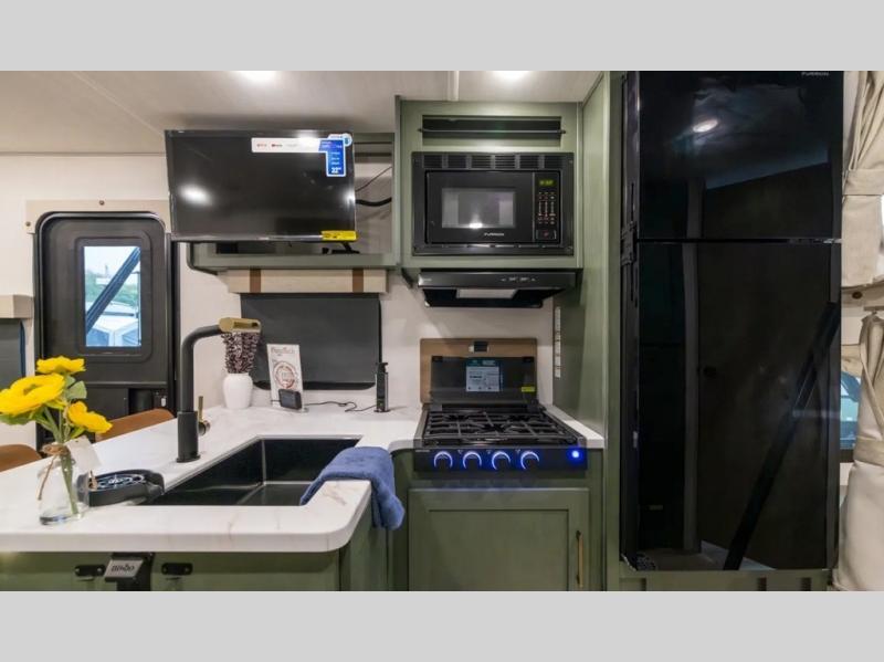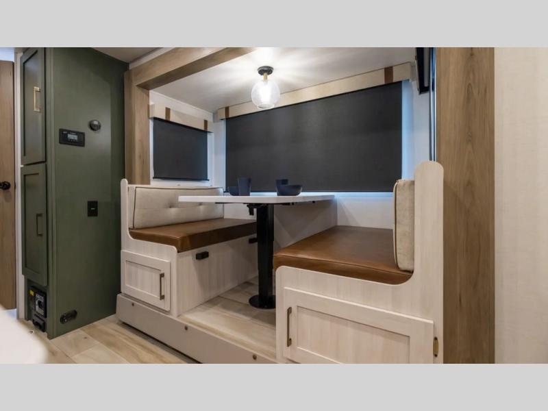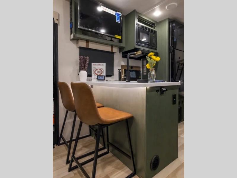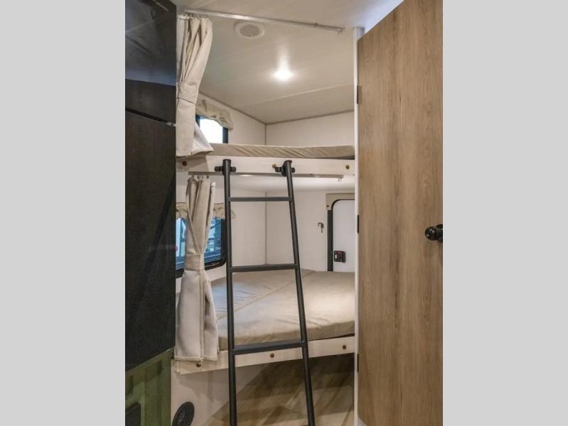 Pack up this very versatile Murphy bed travel trailer and head out to explore! You will love the space saving aspect that a Murphy bed gives you by not increasing the tow length in order to give you a separate bedroom and living space, and you don't even have to make the bed, just fold it up into the wall in the morning! Double-size bunks in the rear corner are perfect for accommodating both children and adults. The kitchen offers everything a cook would need to feed the whole gang and there is even a counter bar area with two stools which will be perfect for breakfast time. There is a booth dinette slide for more dining space, or a place to enjoy a board game or card game when you are inside.