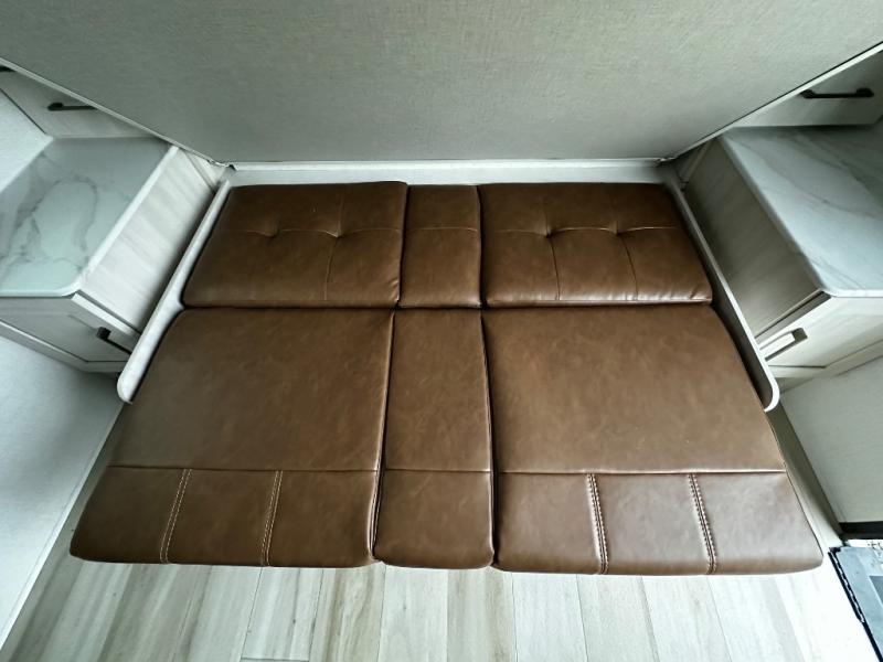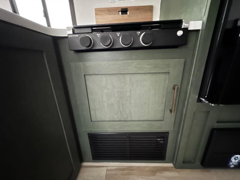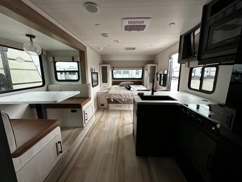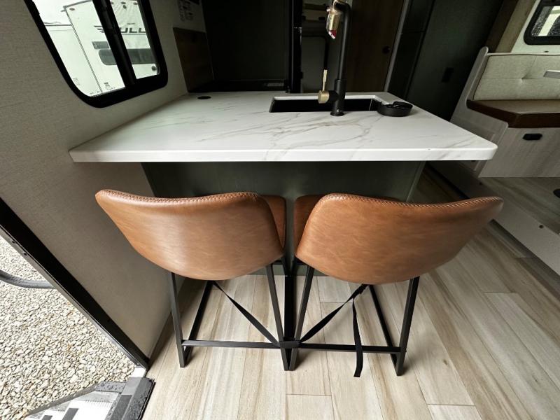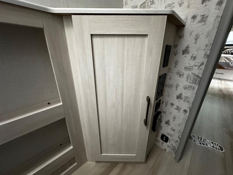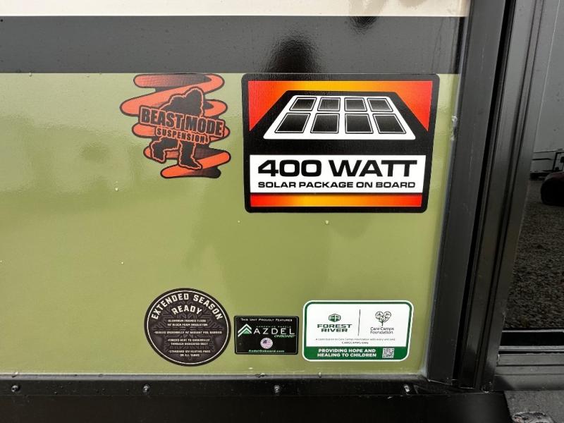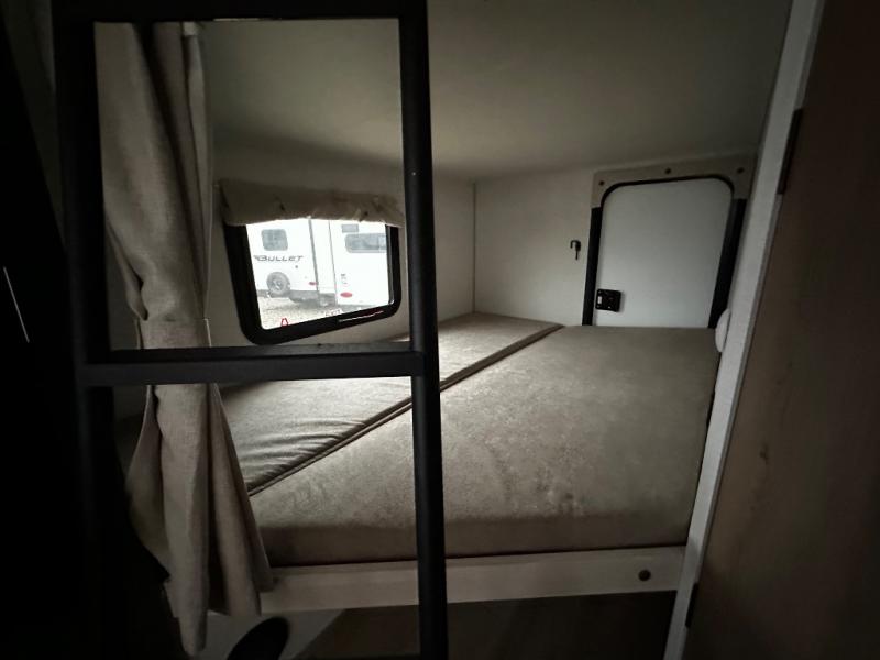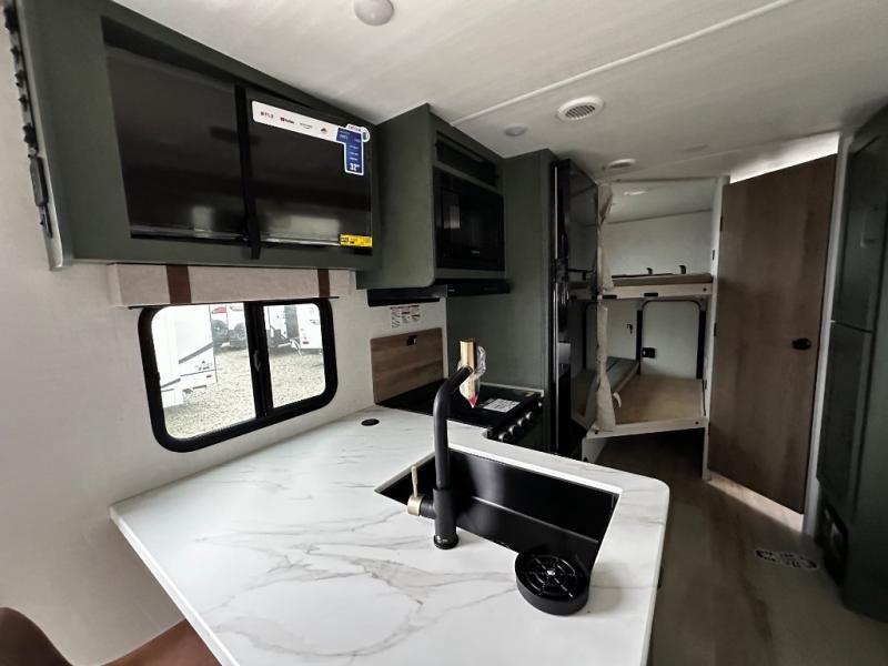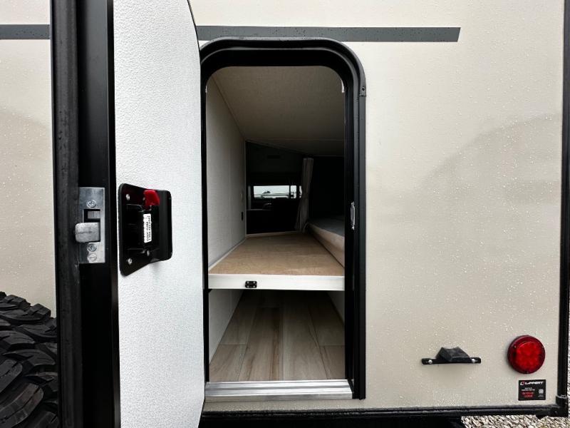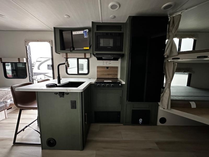 Pack up this very versatile Murphy bed travel trailer and head out to explore! You will love the space saving aspect that a Murphy bed gives you by not increasing the tow length in order to give you a separate bedroom and living space, and you don't even have to make the bed, just fold it up into the wall in the morning! Double-size bunks in the rear corner are perfect for accommodating both children and adults. The kitchen offers everything a cook would need to feed the whole gang and there is even a counter bar area with two stools which will be perfect for breakfast time. There is a booth dinette slide for more dining space, or a place to enjoy a board game or card game when you are inside. When the optional Beast Mode Package on this model is chosen, you'll enjoy a 400-watt solar package, a fresh water filter, a Maxxair roof vent cover, plus a Beast Mode independent suspension for better handling.