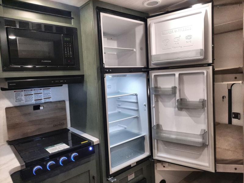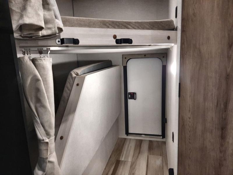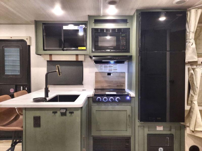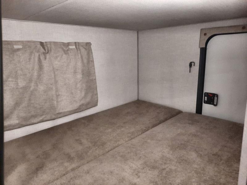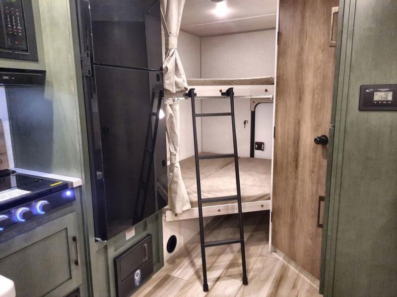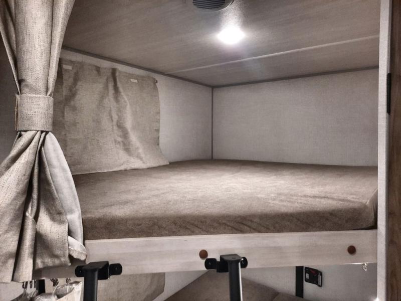 Pack up this very versatile Murphy bed travel trailer and head out to explore! You will love the space saving aspect that a Murphy bed gives you by not increasing the tow length in order to give you a separate bedroom and living space, and you don't even have to make the bed, just fold it up into the wall in the morning! Double-size bunks in the rear corner are perfect for accommodating both children and adults. The kitchen offers everything a cook would need to feed the whole gang and there is even a counter bar area with two stools which will be perfect for breakfast time. There is a booth dinette slide for more dining space, or a place to enjoy a board game or card game when you are inside. When the optional Beast Mode Package on this model is chosen, you'll enjoy a 400-watt solar package, a fresh water filter, a Maxxair roof vent cover, plus a Beast Mode independent suspension for better handling.