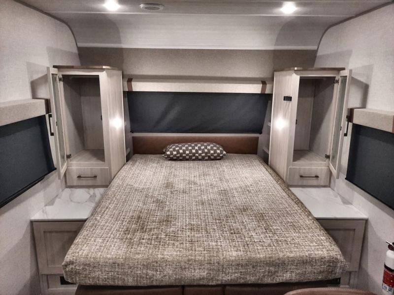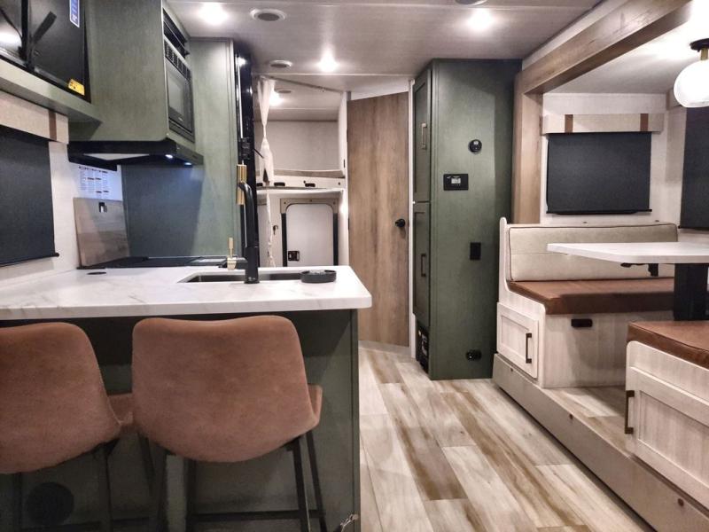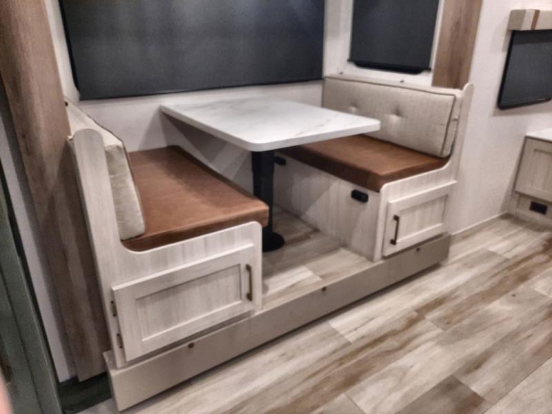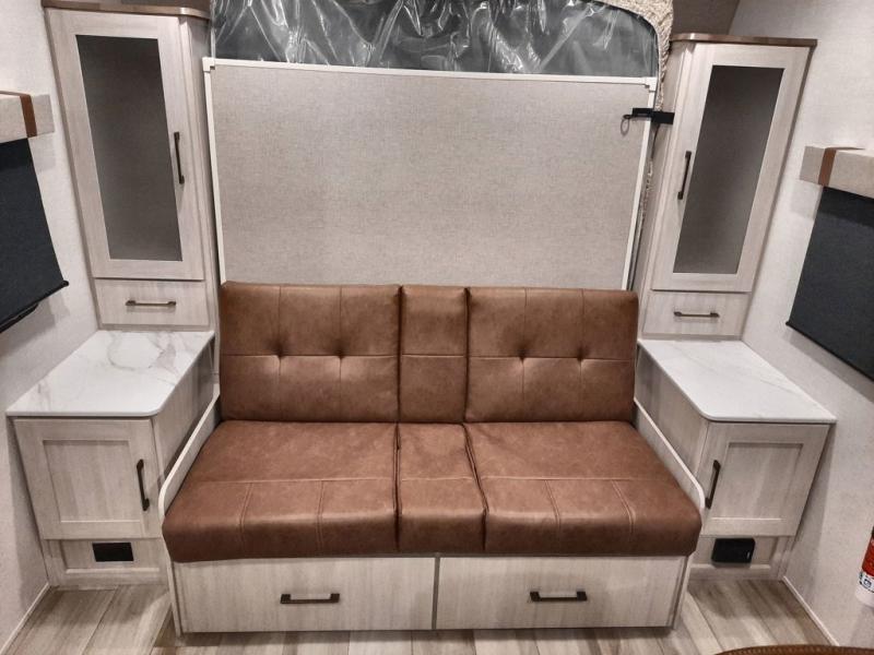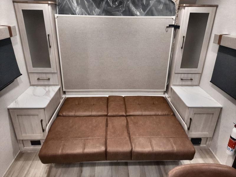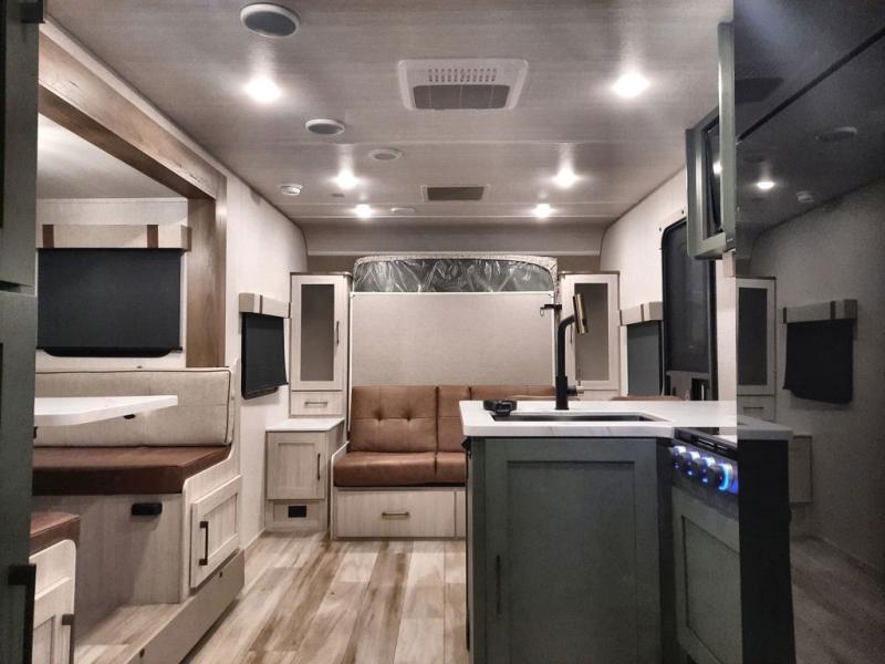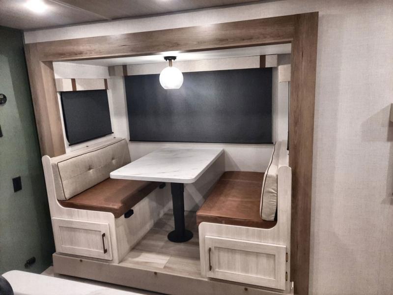 Pack up this very versatile Murphy bed travel trailer and head out to explore! You will love the space saving aspect that a Murphy bed gives you by not increasing the tow length in order to give you a separate bedroom and living space, and you don't even have to make the bed, just fold it up into the wall in the morning! Double-size bunks in the rear corner are perfect for accommodating both children and adults. The kitchen offers everything a cook would need to feed the whole gang and there is even a counter bar area with two stools which will be perfect for breakfast time. There is a booth dinette slide for more dining space, or a place to enjoy a board game or card game when you are inside. When the optional Beast Mode Package on this model is chosen, you'll enjoy a 400-watt solar package, a fresh water filter, a Maxxair roof vent cover, plus a Beast Mode independent suspension for better handling.