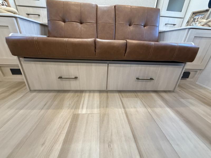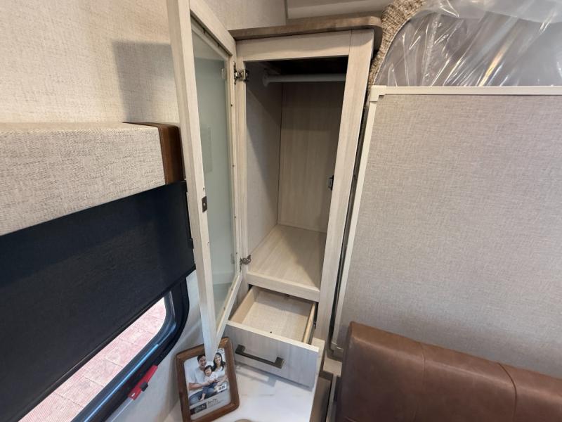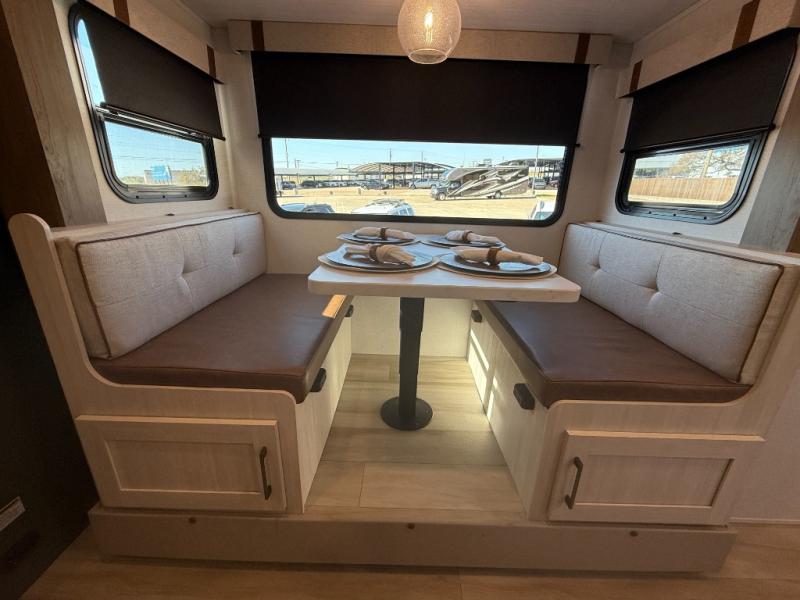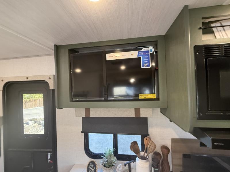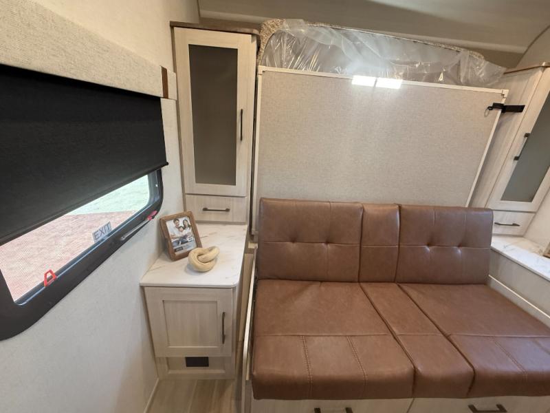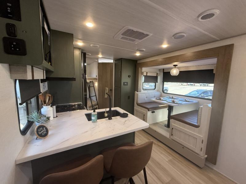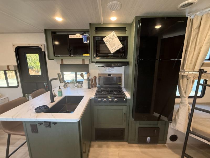 Pack up this very versatile Murphy bed travel trailer and head out to explore! You will love the space saving aspect that a Murphy bed gives you by not increasing the tow length in order to give you a separate bedroom and living space, and you don't even have to make the bed, just fold it up into the wall in the morning! Double-size bunks in the rear corner are perfect for accommodating both children and adults. The kitchen offers everything a cook would need to feed the whole gang and there is even a counter bar area with two stools which will be perfect for breakfast time. There is a booth dinette slide for more dining space, or a place to enjoy a board game or card game when you are inside. When the optional Beast Mode Package on this model is chosen, you'll enjoy a 400-watt solar package, a fresh water filter, a Maxxair roof vent cover, plus a Beast Mode independent suspension for better handling.