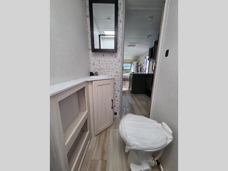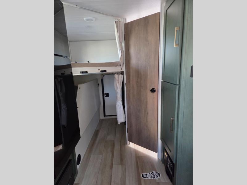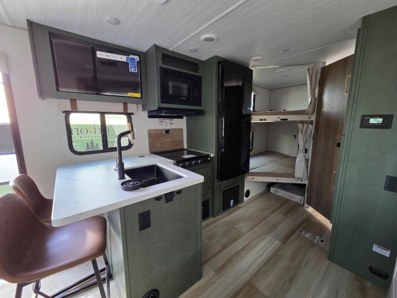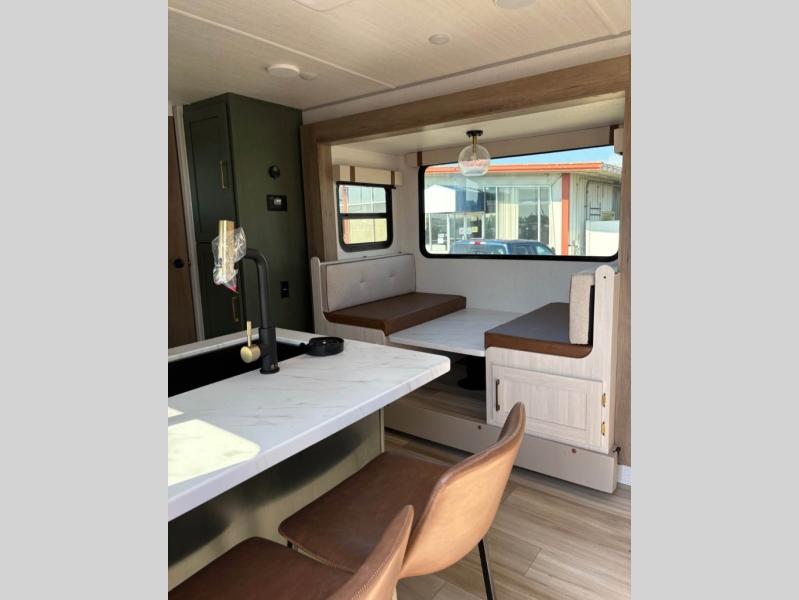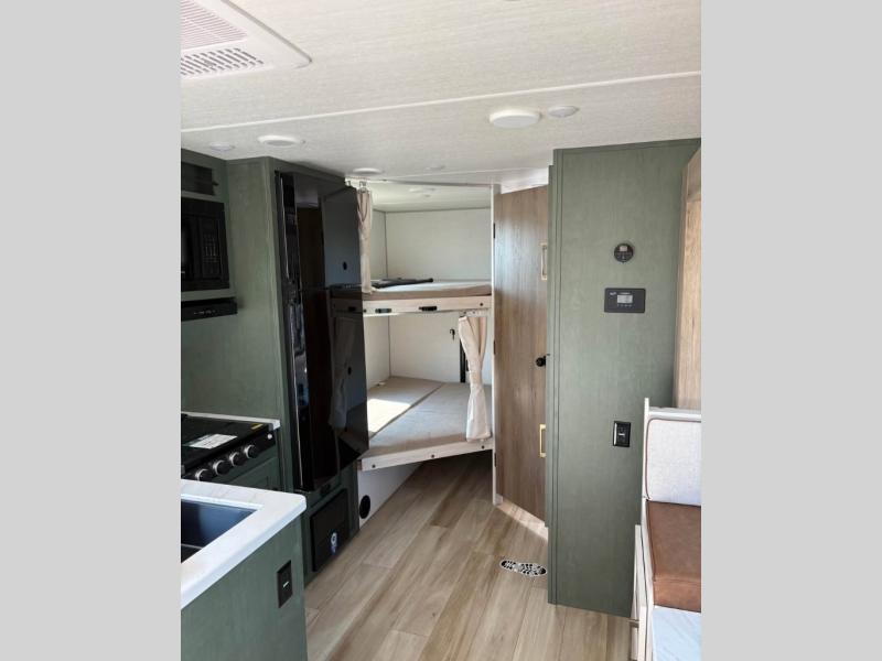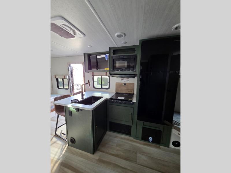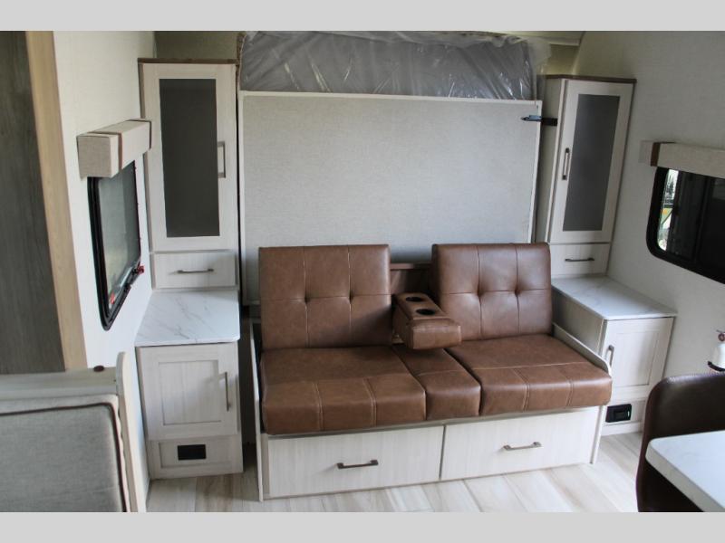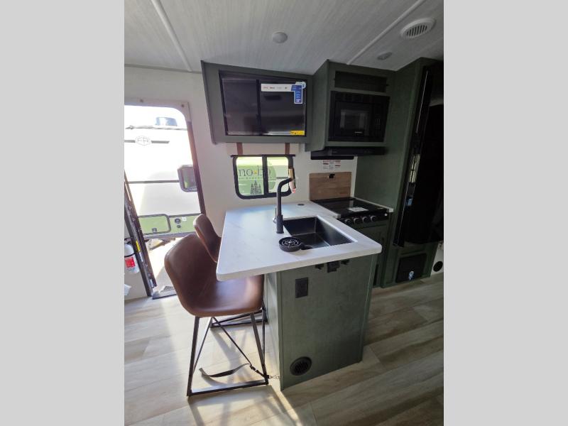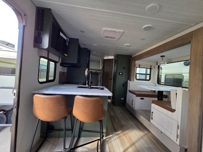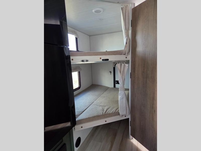 Pack up this very versatile Murphy bed travel trailer and head out to explore! You will love the space saving aspect that a Murphy bed gives you by not increasing the tow length in order to give you a separate bedroom and living space, and you don't even have to make the bed, just fold it up into the wall in the morning! Double-size bunks in the rear corner are perfect for accommodating both children and adults. The kitchen offers everything a cook would need to feed the whole gang and there is even a counter bar area with two stools which will be perfect for breakfast time. There is a booth dinette slide for more dining space, or a place to enjoy a board game or card game when you are inside. When the optional Beast Mode Package on this model is chosen, you'll enjoy a 400-watt solar package, a fresh water filter, a Maxxair roof vent cover, plus a Beast Mode independent suspension for better handling.