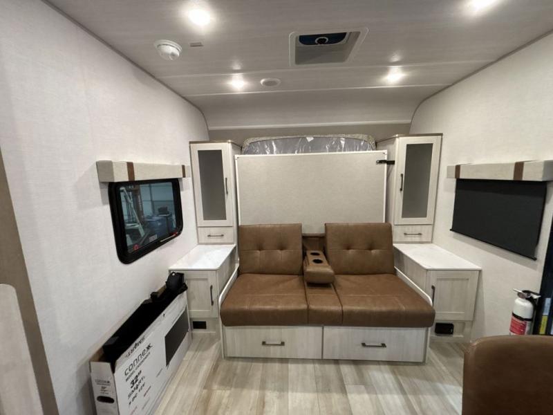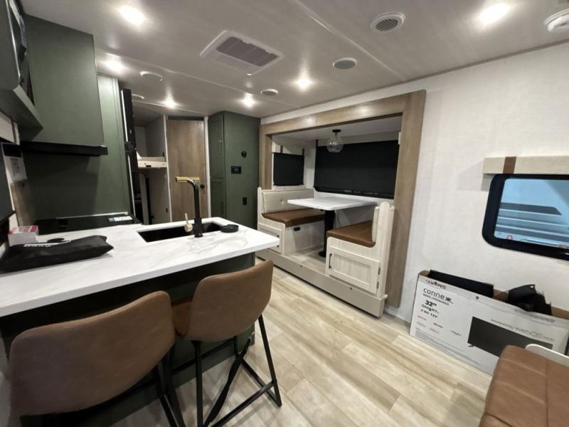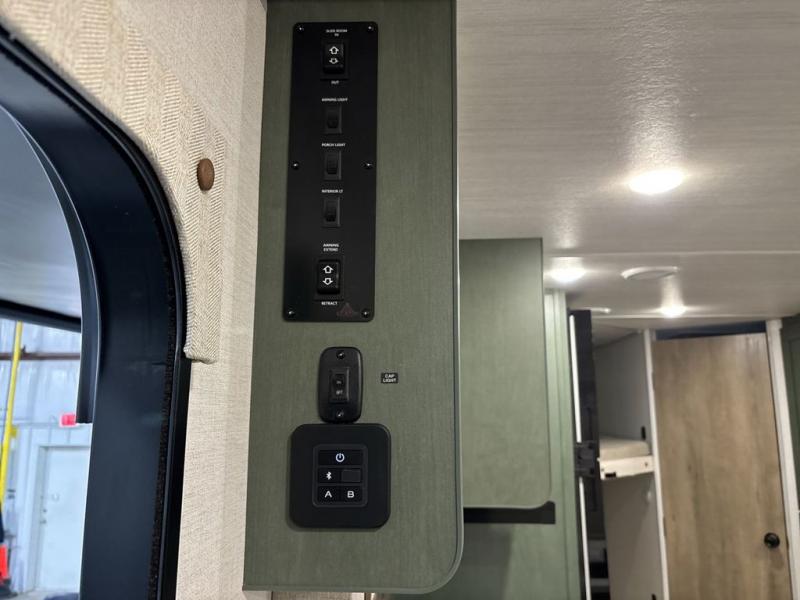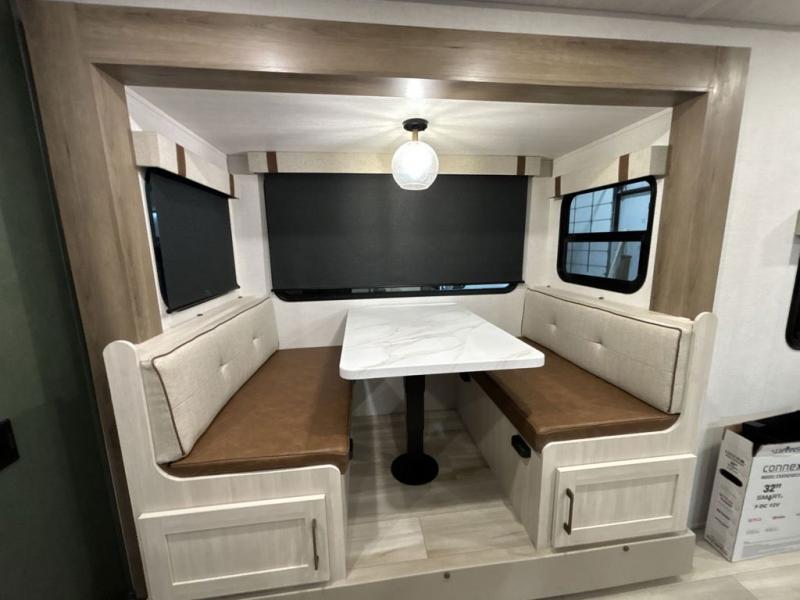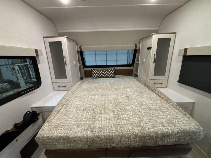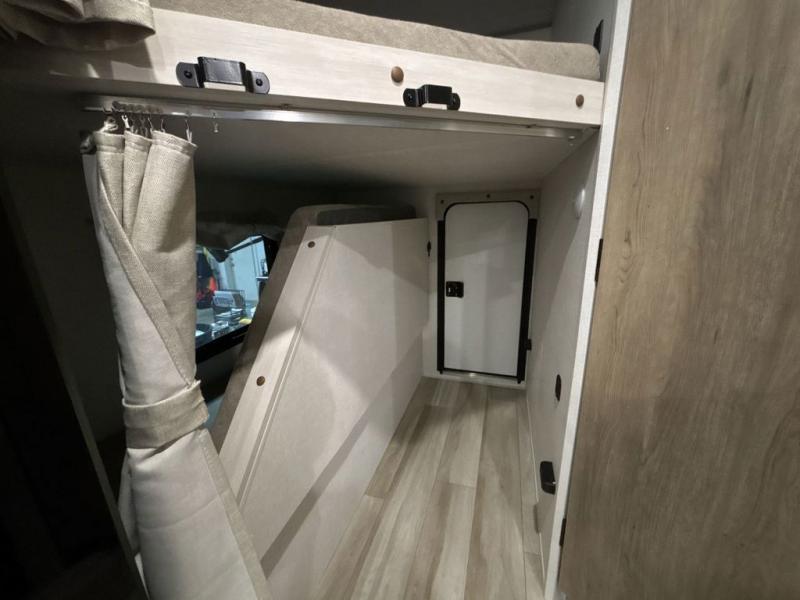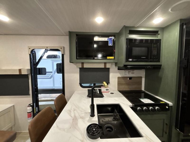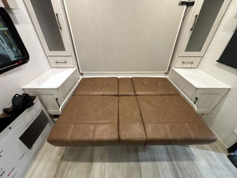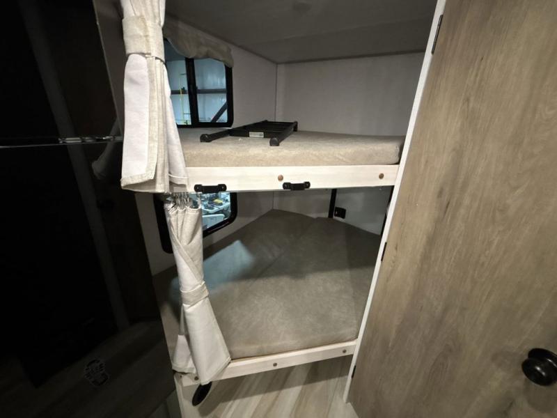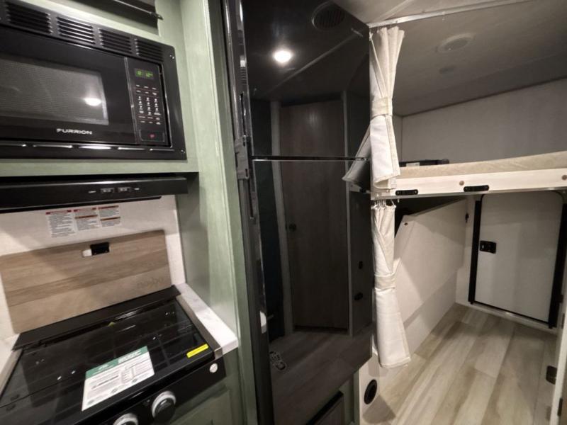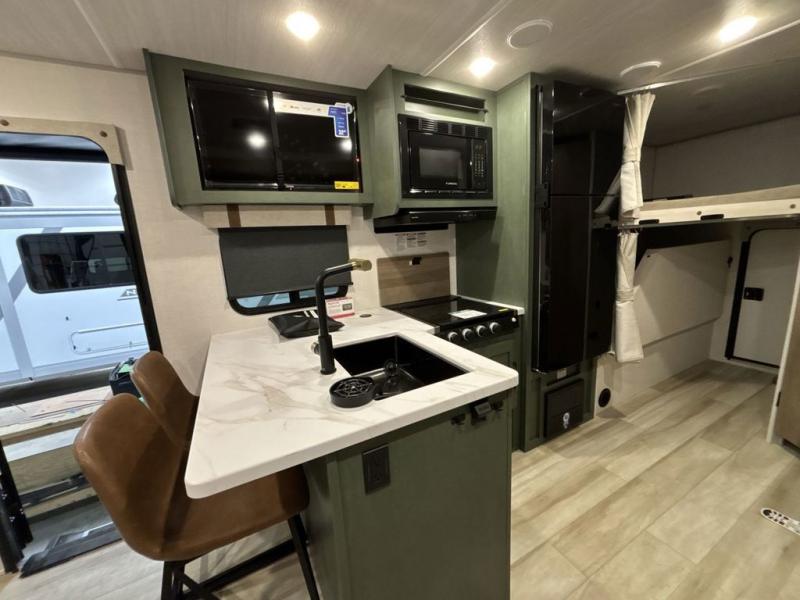 Pack up this very versatile Murphy bed travel trailer and head out to explore! You will love the space saving aspect that a Murphy bed gives you by not increasing the tow length in order to give you a separate bedroom and living space, and you don't even have to make the bed, just fold it up into the wall in the morning! Double-size bunks in the rear corner are perfect for accommodating both children and adults. The kitchen offers everything a cook would need to feed the whole gang and there is even a counter bar area with two stools which will be perfect for breakfast time. There is a booth dinette slide for more dining space, or a place to enjoy a board game or card game when you are inside. When the optional Beast Mode Package on this model is chosen, you'll enjoy a 400-watt solar package, a fresh water filter, a Maxxair roof vent cover, plus a Beast Mode independent suspension for better handling.