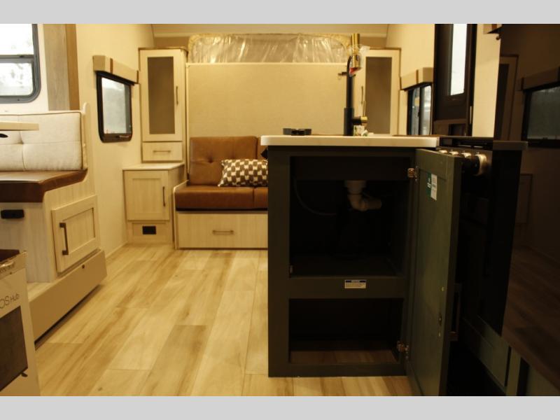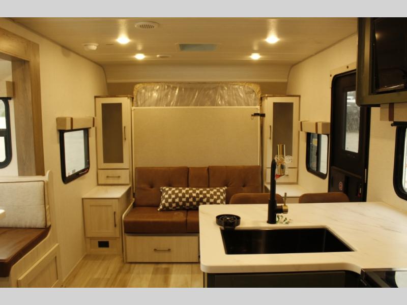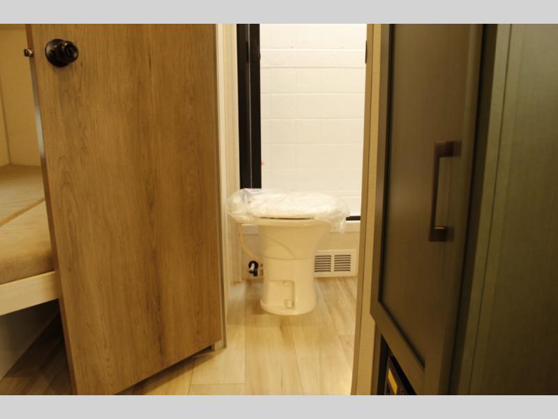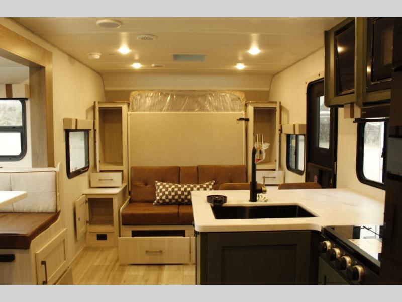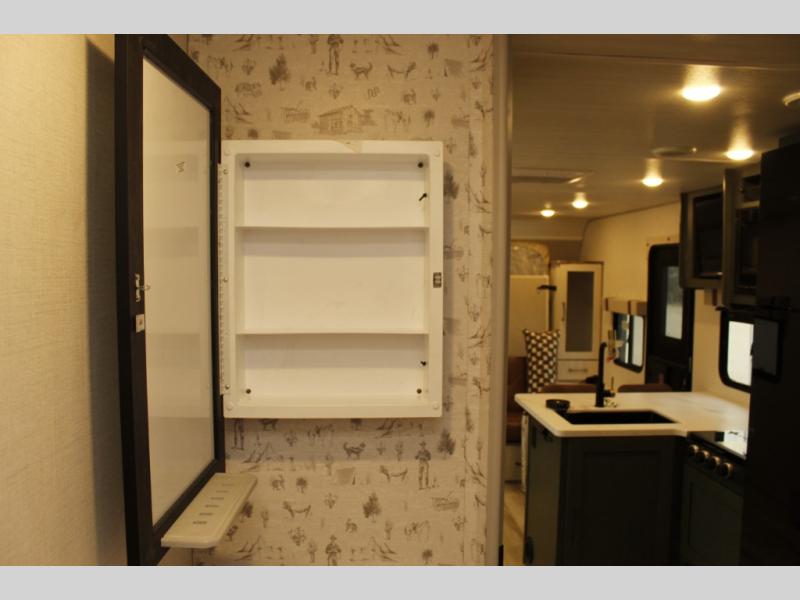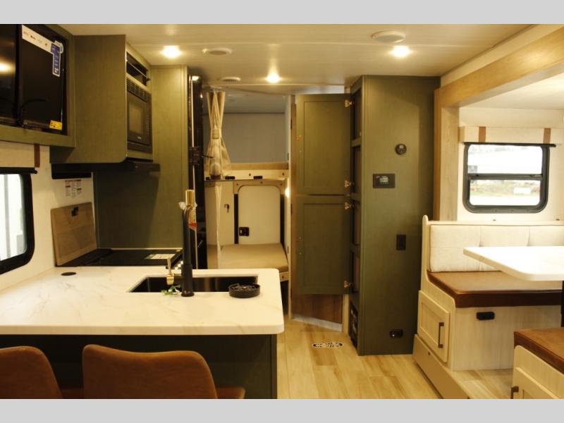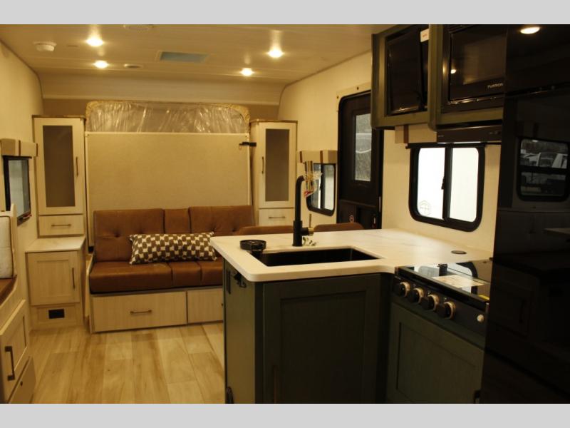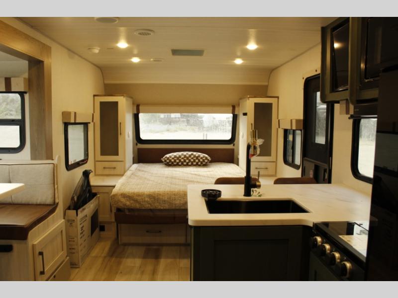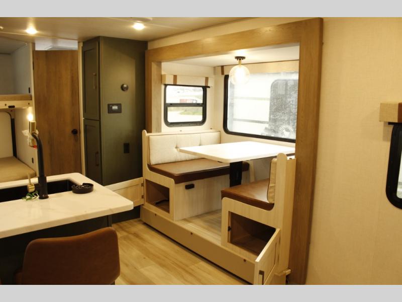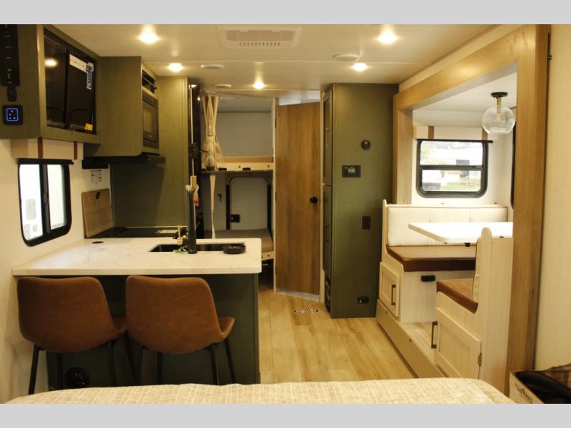 Pack up this very versatile Murphy bed travel trailer and head out to explore! You will love the space saving aspect that a Murphy bed gives you by not increasing the tow length in order to give you a separate bedroom and living space, and you don't even have to make the bed, just fold it up into the wall in the morning! Double-size bunks in the rear corner are perfect for accommodating both children and adults. The kitchen offers everything a cook would need to feed the whole gang and there is even a counter bar area with two stools which will be perfect for breakfast time. There is a booth dinette slide for more dining space, or a place to enjoy a board game or card game when you are inside.