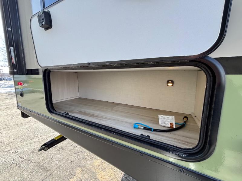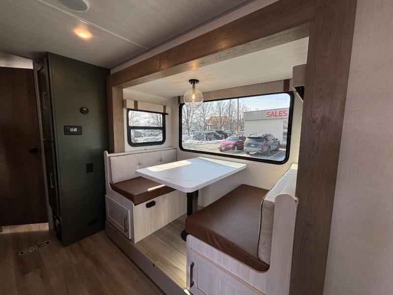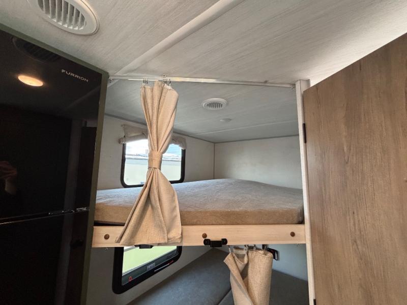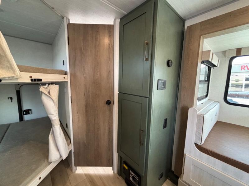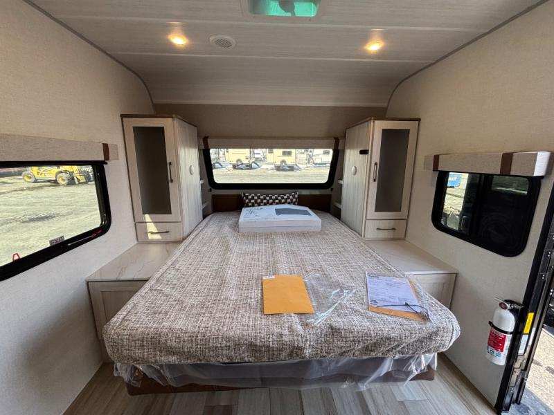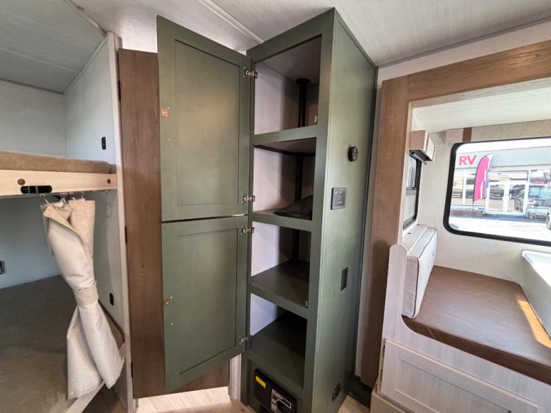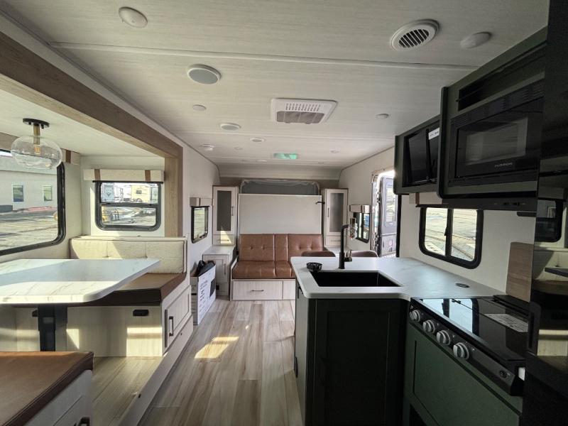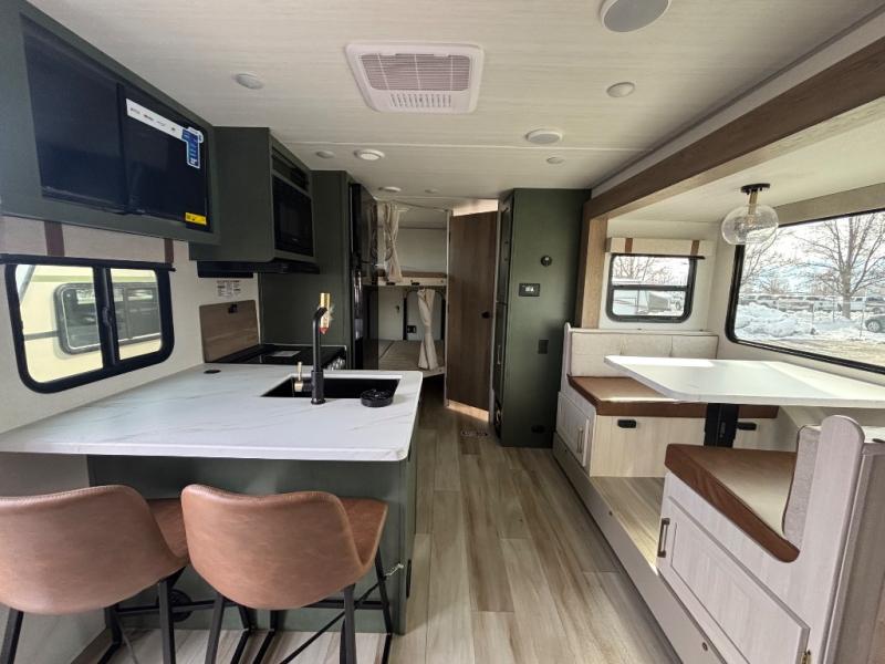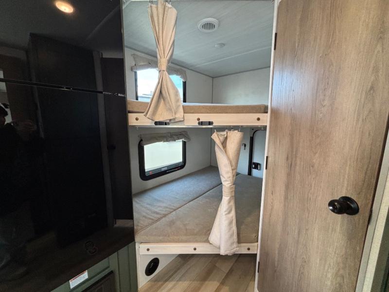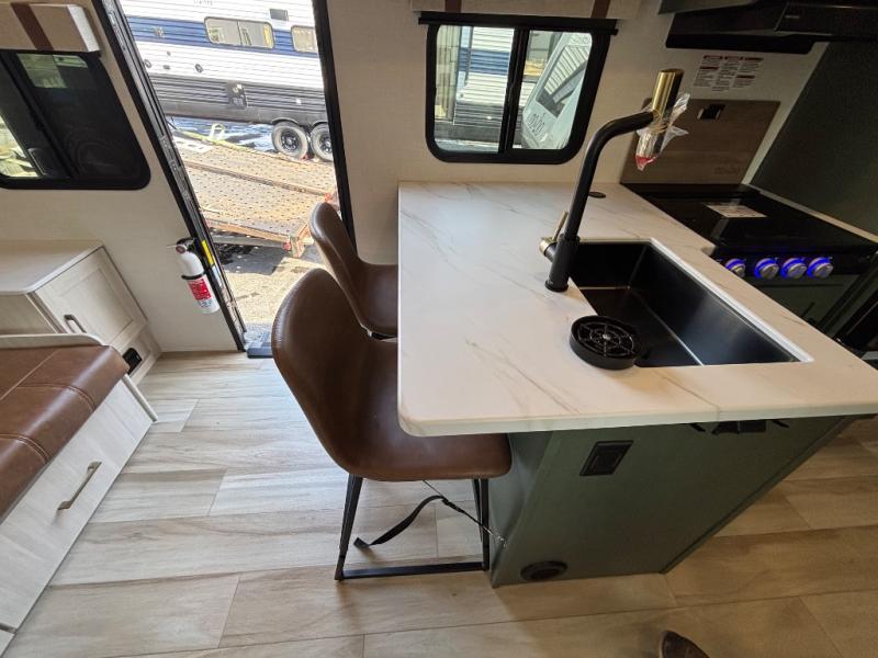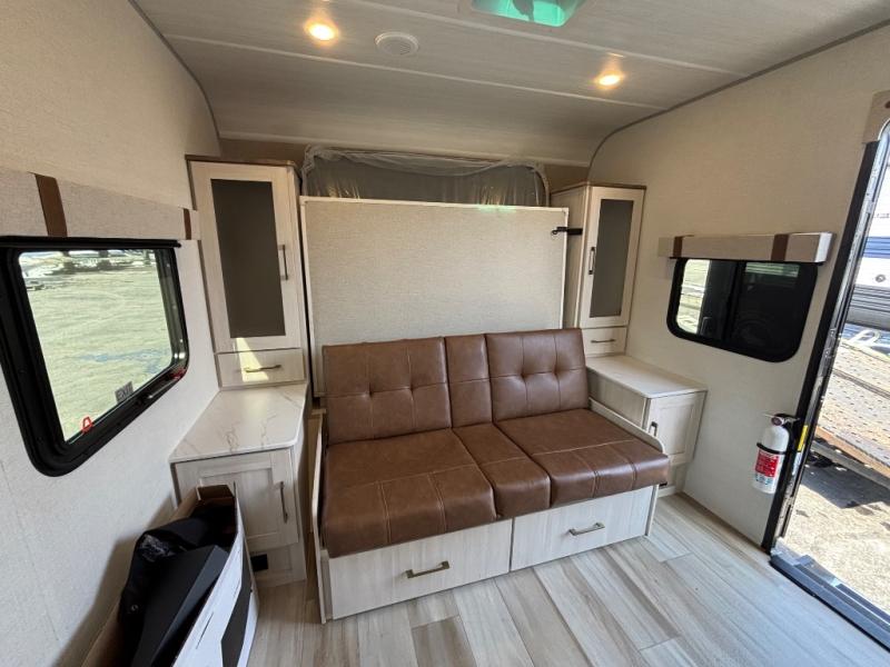 Pack up this very versatile Murphy bed travel trailer and head out to explore! You will love the space saving aspect that a Murphy bed gives you by not increasing the tow length in order to give you a separate bedroom and living space, and you don't even have to make the bed, just fold it up into the wall in the morning! Double-size bunks in the rear corner are perfect for accommodating both children and adults. The kitchen offers everything a cook would need to feed the whole gang and there is even a counter bar area with two stools which will be perfect for breakfast time. There is a booth dinette slide for more dining space, or a place to enjoy a board game or card game when you are inside. When the optional Beast Mode Package on this model is chosen, you'll enjoy a 400-watt solar package, a fresh water filter, a Maxxair roof vent cover, plus a Beast Mode independent suspension for better handling.