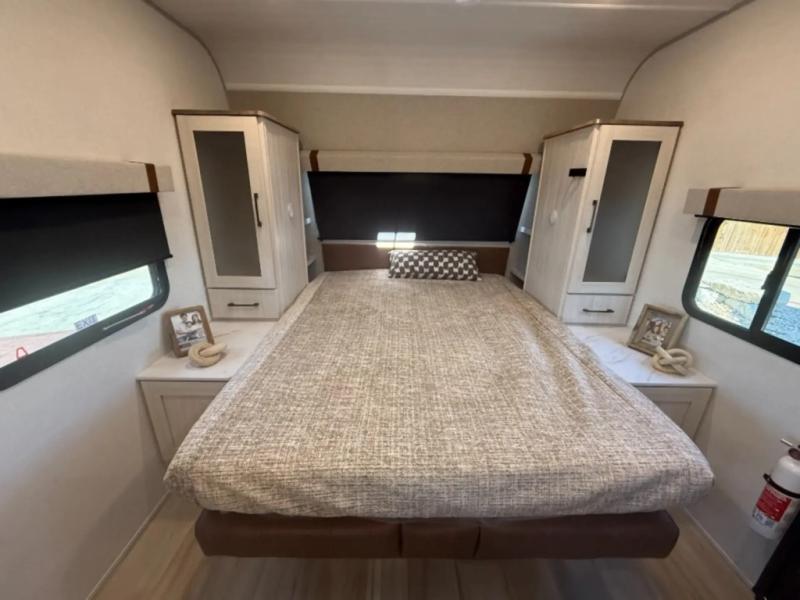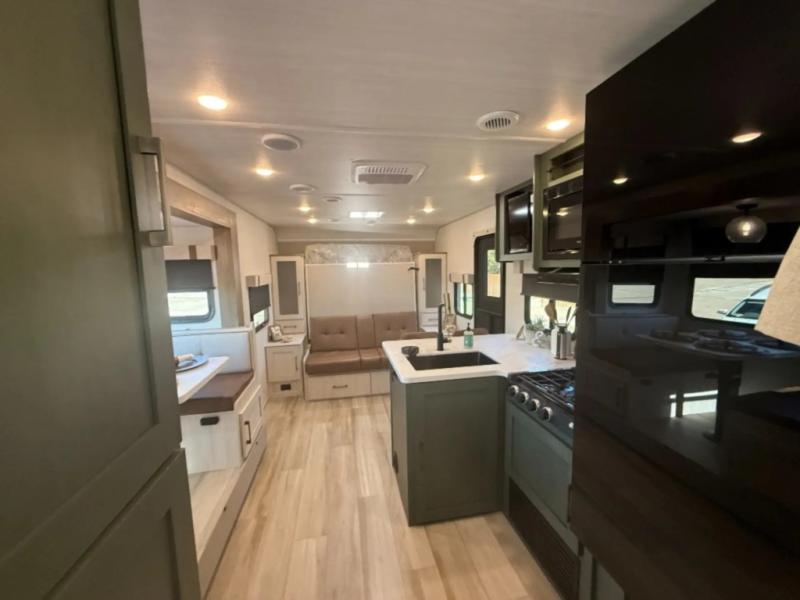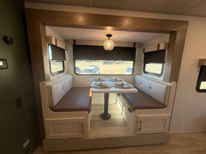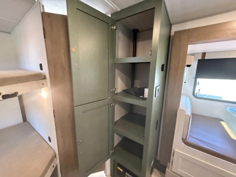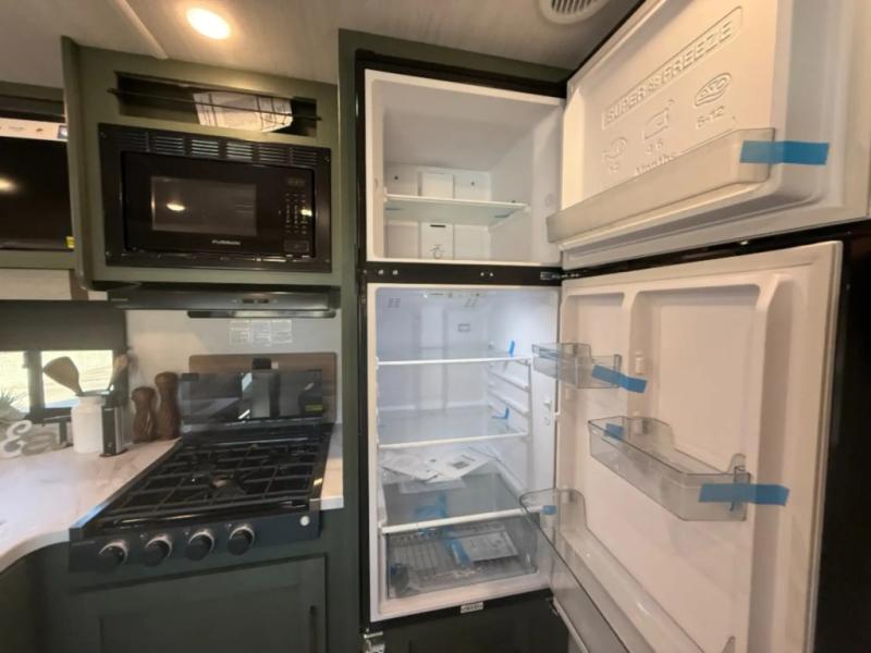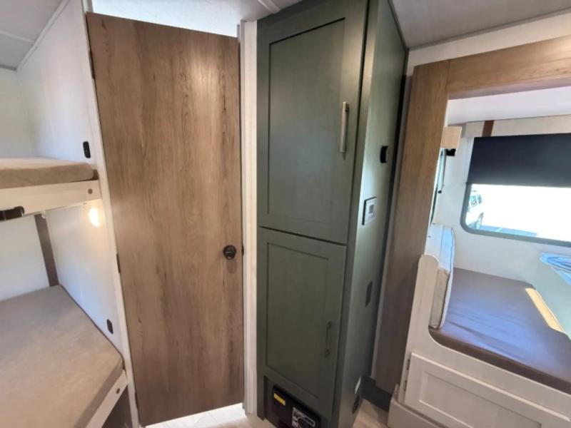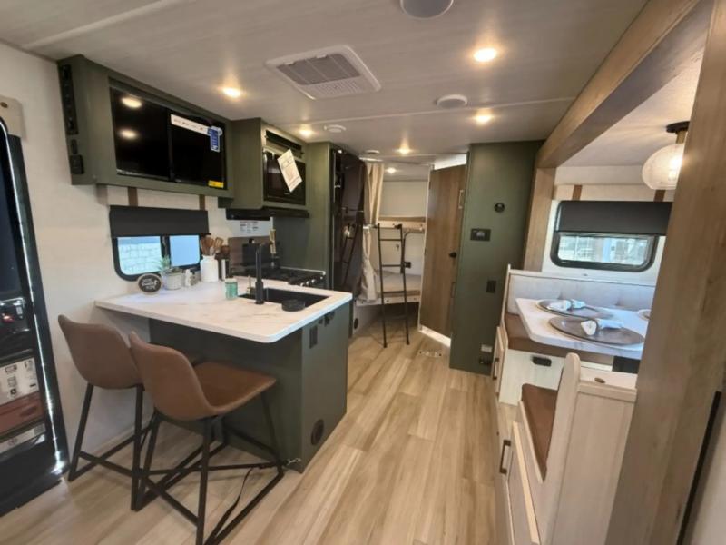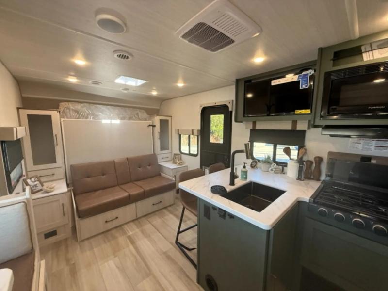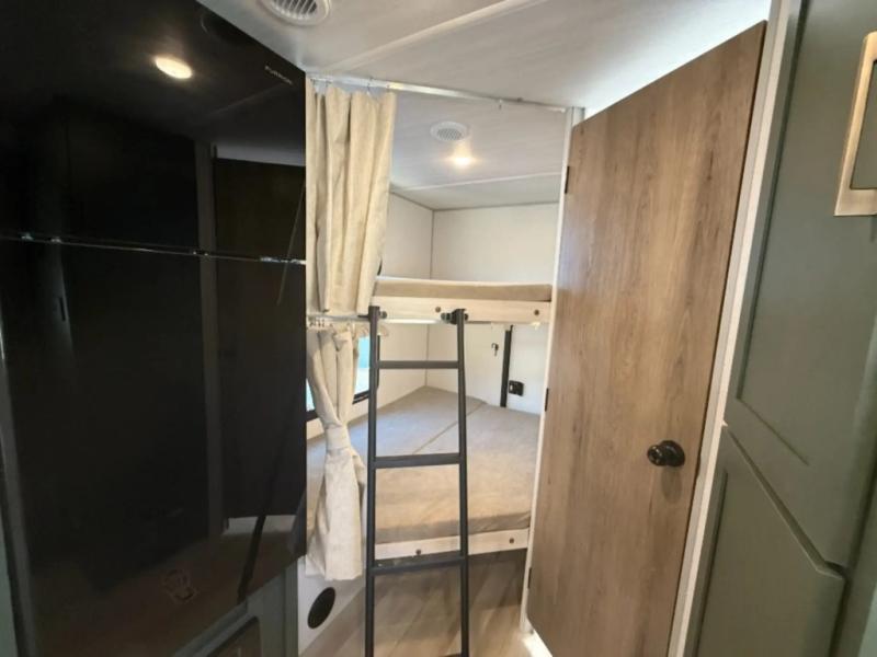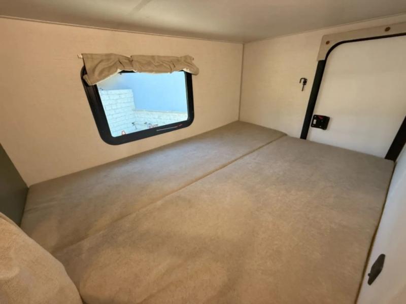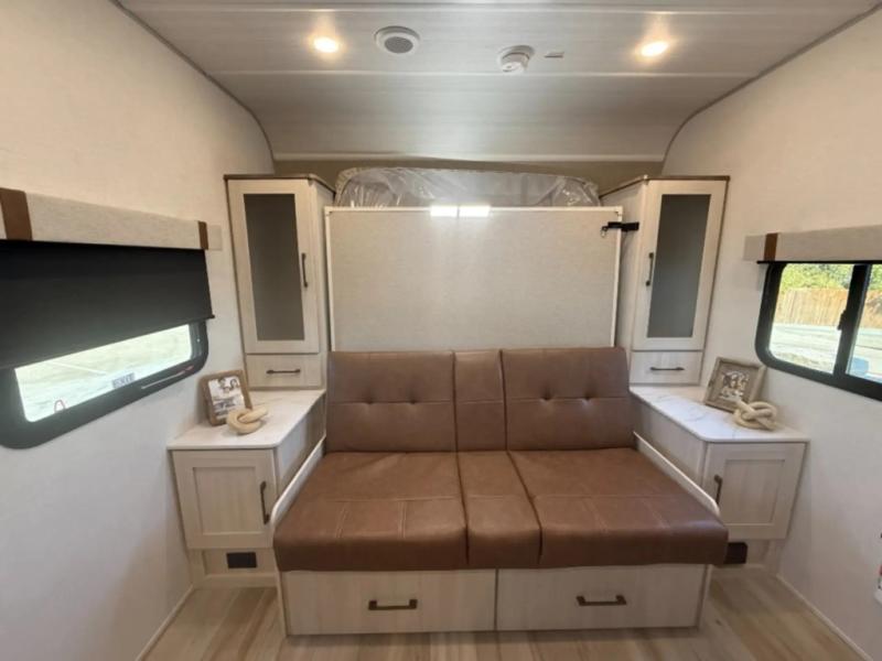 Pack up this very versatile Murphy bed travel trailer and head out to explore! You will love the space saving aspect that a Murphy bed gives you by not increasing the tow length in order to give you a separate bedroom and living space, and you don't even have to make the bed, just fold it up into the wall in the morning! Double-size bunks in the rear corner are perfect for accommodating both children and adults. The kitchen offers everything a cook would need to feed the whole gang and there is even a counter bar area with two stools which will be perfect for breakfast time. There is a booth dinette slide for more dining space, or a place to enjoy a board game or card game when you are inside. When the optional Beast Mode Package on this model is chosen, you'll enjoy a 400-watt solar package, a fresh water filter, a Maxxair roof vent cover, plus a Beast Mode independent suspension for better handling.