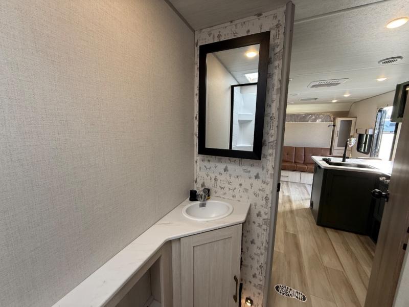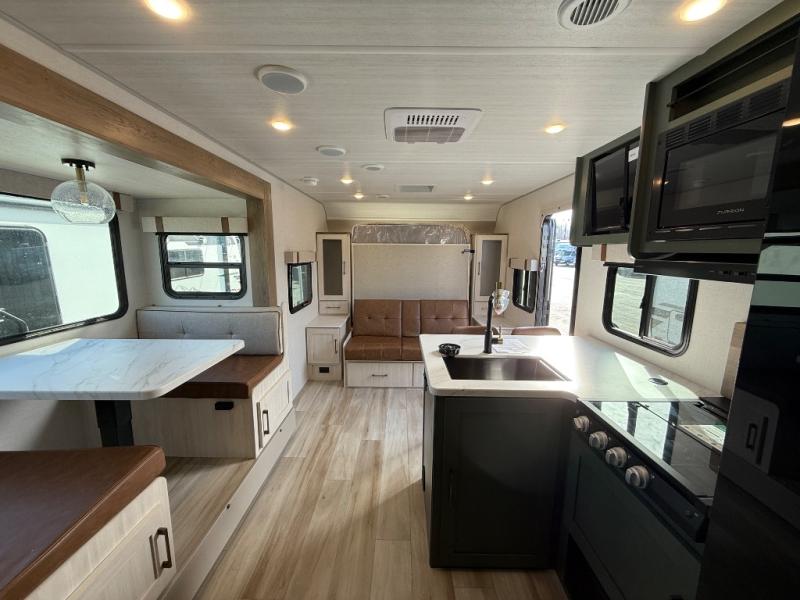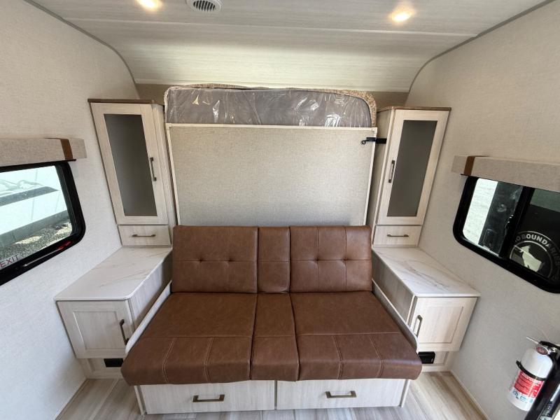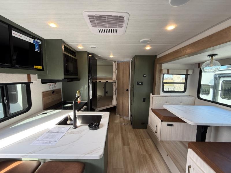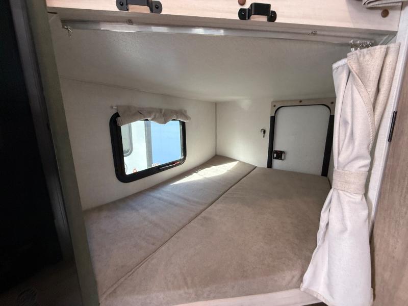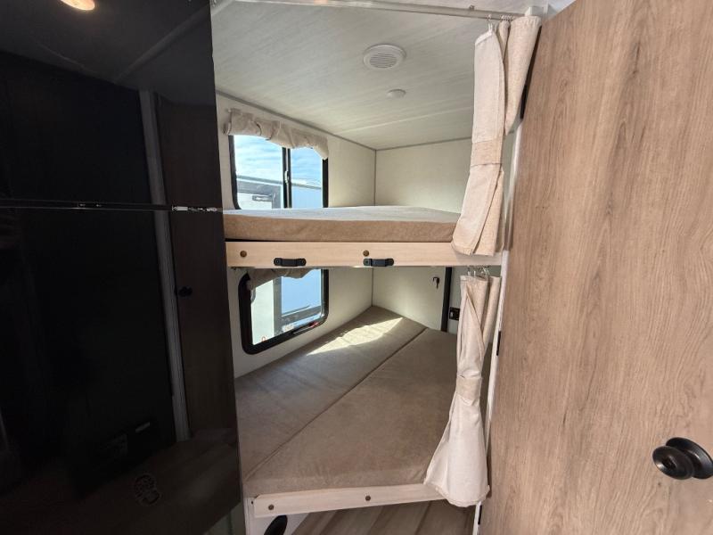 Pack up this very versatile Murphy bed travel trailer and head out to explore! You will love the space saving aspect that a Murphy bed gives you by not increasing the tow length in order to give you a separate bedroom and living space, and you don't even have to make the bed, just fold it up into the wall in the morning! Double-size bunks in the rear corner are perfect for accommodating both children and adults. The kitchen offers everything a cook would need to feed the whole gang and there is even a counter bar area with two stools which will be perfect for breakfast time. There is a booth dinette slide for more dining space, or a place to enjoy a board game or card game when you are inside. When the optional Beast Mode Package on this model is chosen, you'll enjoy a 400-watt solar package, a fresh water filter, a Maxxair roof vent cover, plus a Beast Mode independent suspension for better handling.