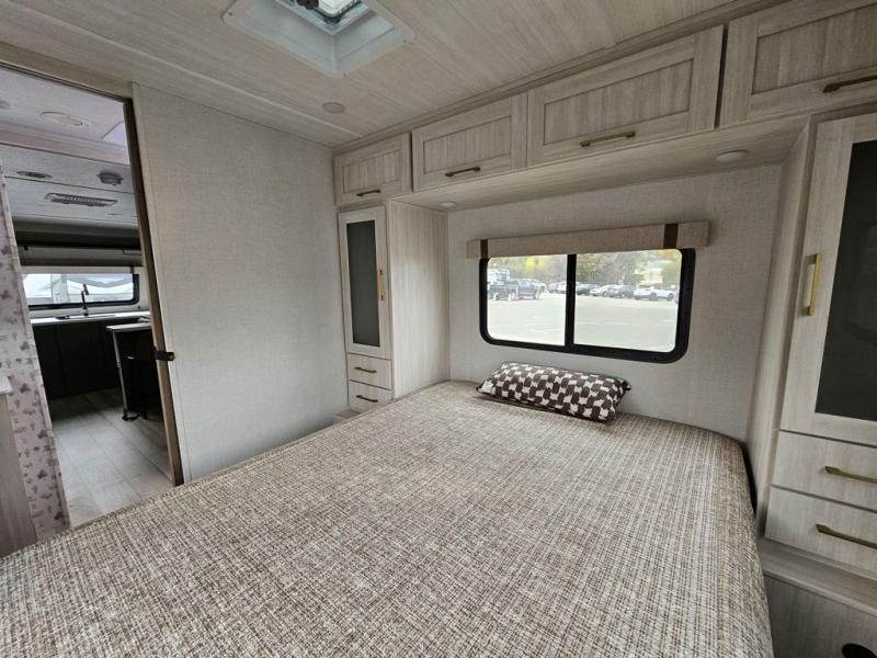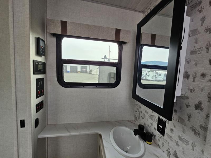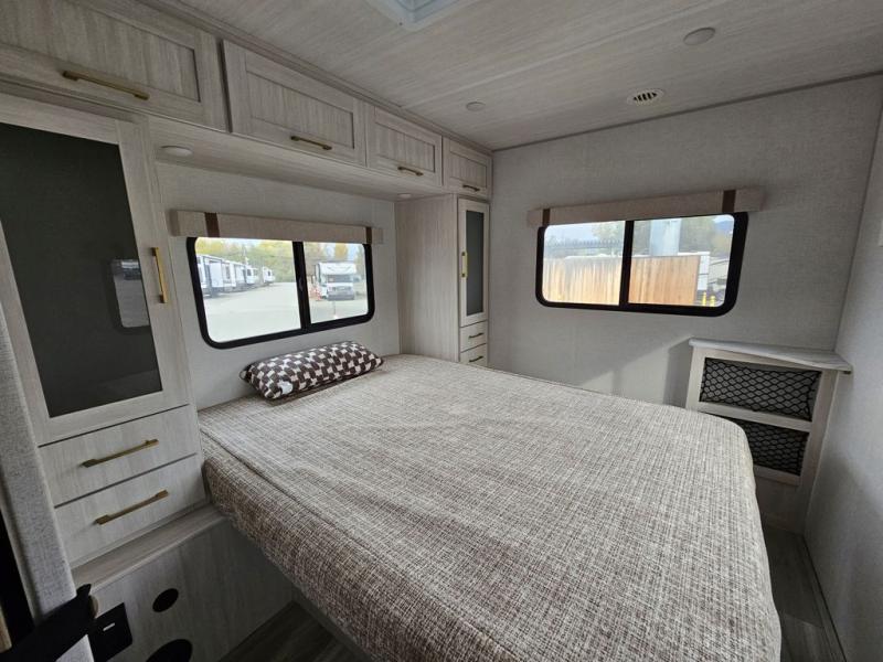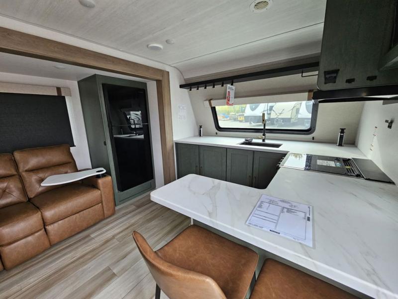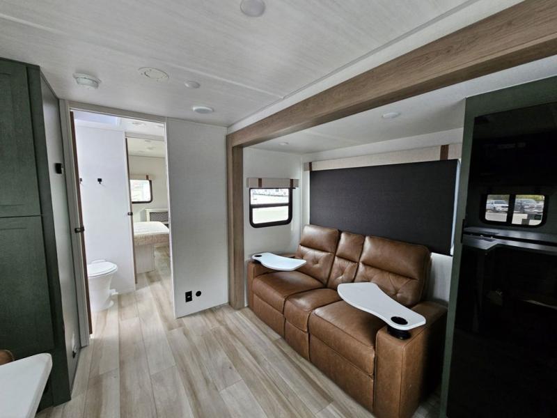This couple's trailer is perfect for weekend trips or extended stays at the campground. A front kitchen includes generous counter space, along with a bar top and two seats. You can relax on the tri-fold sofa slide after breakfast, or head outdoors to sit under the patio awning. The walk-thru bath will lead to the rear master bedroom where you'll find a queen bed and dual wardrobes for your clothes.