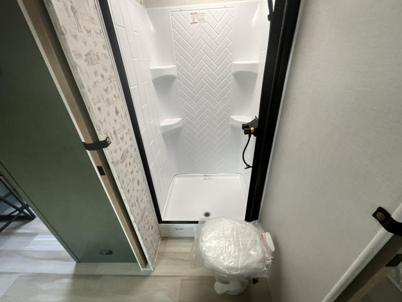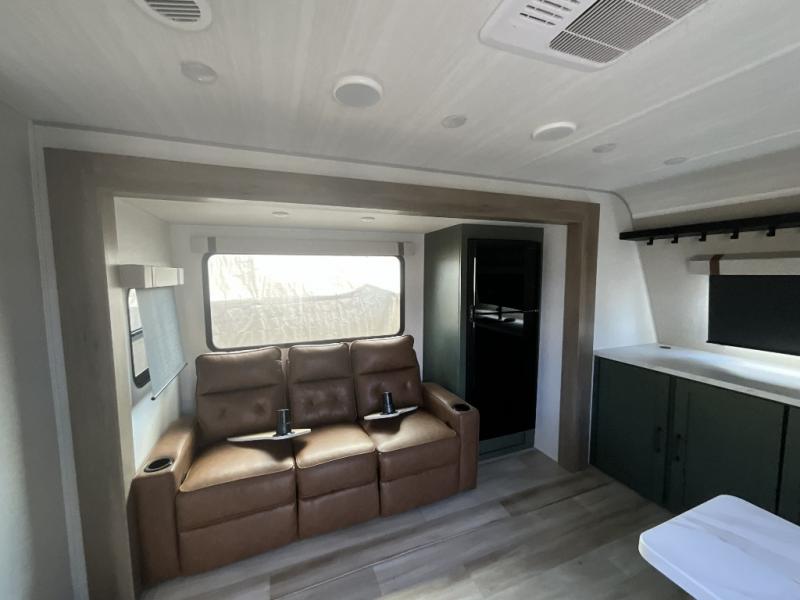 This couple's trailer is perfect for weekend trips or extended stays at the campground. A front kitchen includes generous counter space, along with a bar top and two seats. You can relax on the tri-fold sofa slide after breakfast, or head outdoors to sit under the patio awning. The walk-thru bath will lead to the rear master bedroom where you'll find a queen bed and dual wardrobes for your clothes.