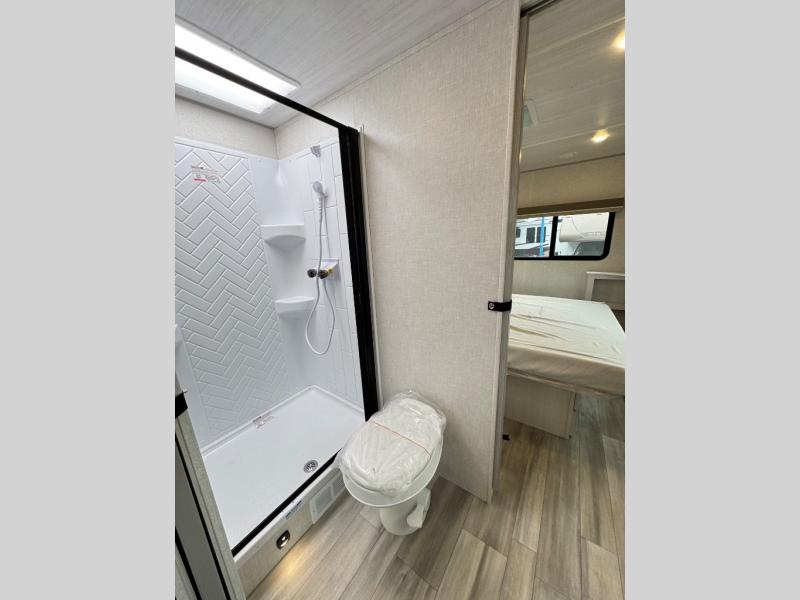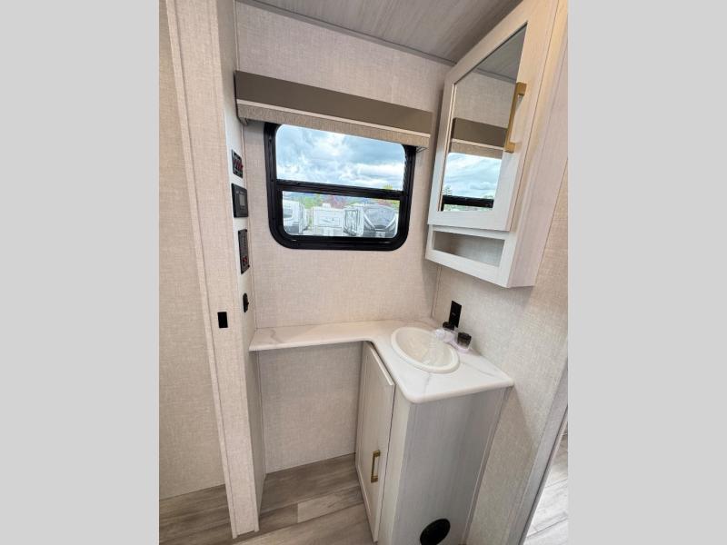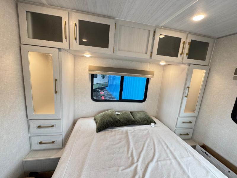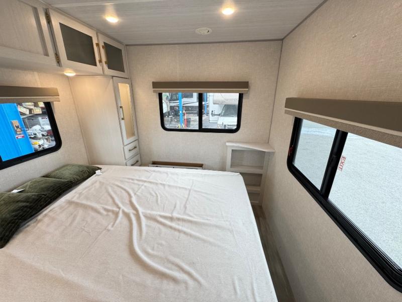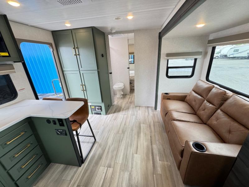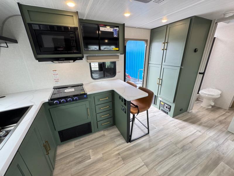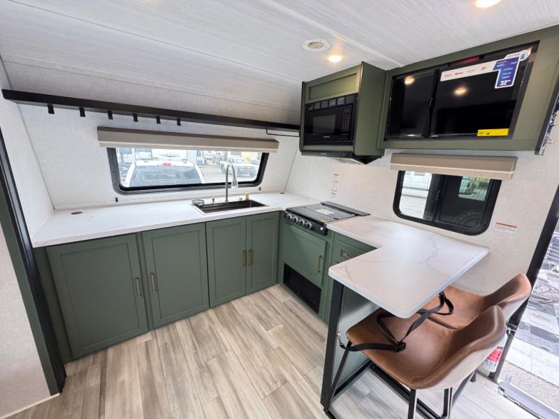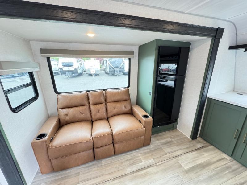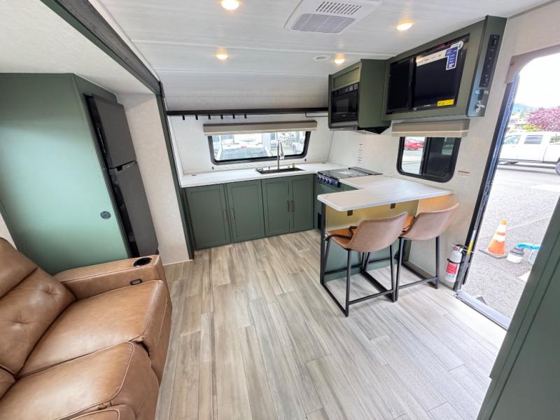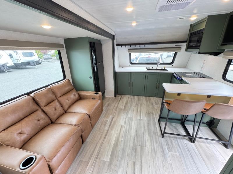 This travel trailer has everything you need for a fun camping trip at your favorite camping spots! The chef will have an easy time preparing meals in the full equipped front kitchen, and will enjoy the company sitting at the breakfast bar on one of the two bar stools. You can read the newspaper on the tri-fold sofa or replace it for the optional theater seating. The walk-through bathroom has everything you need to freshen up, and it leads directly in to the rear private bedroom which has a queen bed, a wardrobe, and a large window to let in some natural lighting. You also have an outside kitchen, a 19' awning, and an enclosed underbelly with forced heat. When the optional Beast Mode Package on this model is chosen, you'll enjoy a 400-watt solar package, a fresh water filter, a Maxxair roof vent cover, plus a Beast Mode independent suspension for better handling.