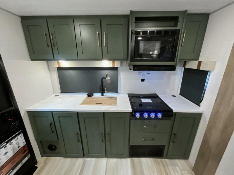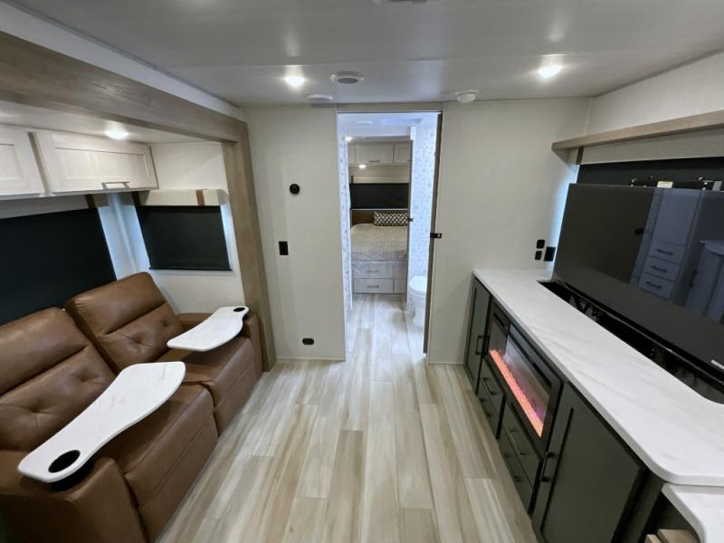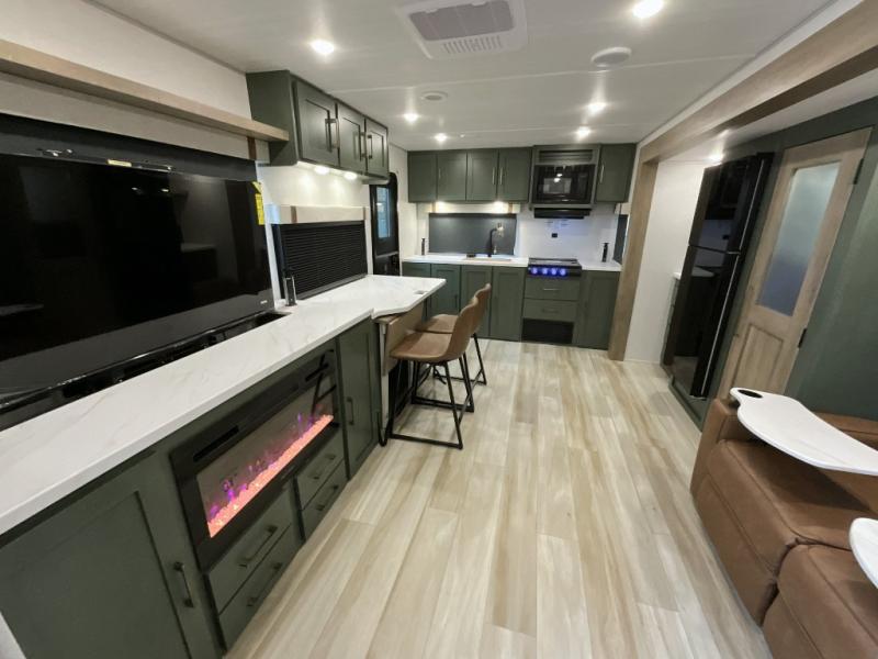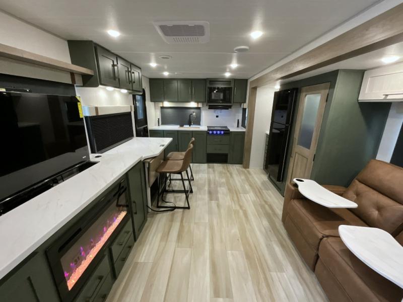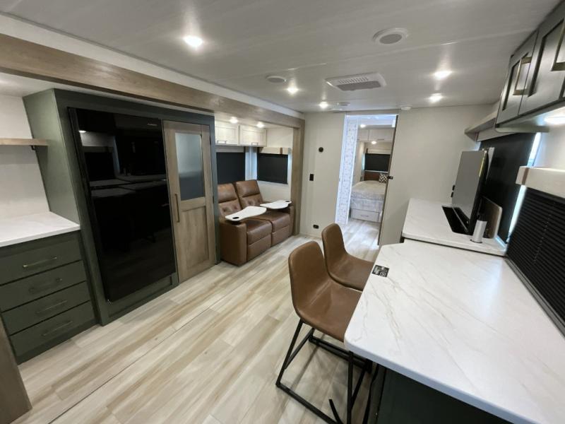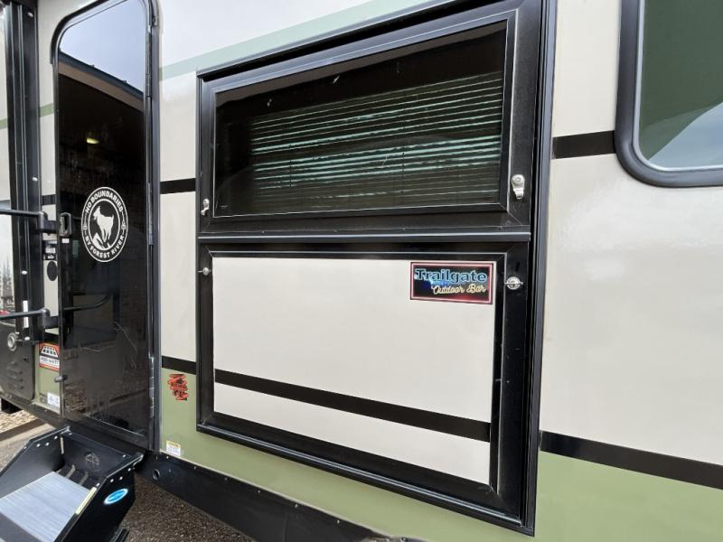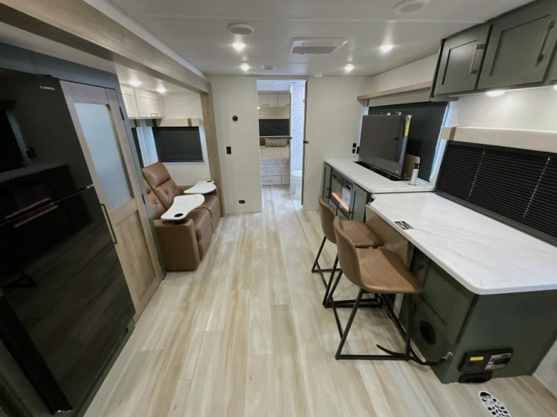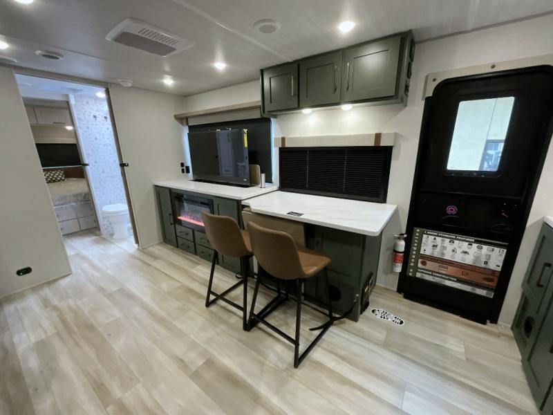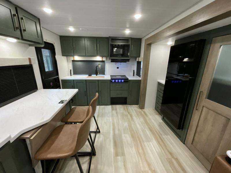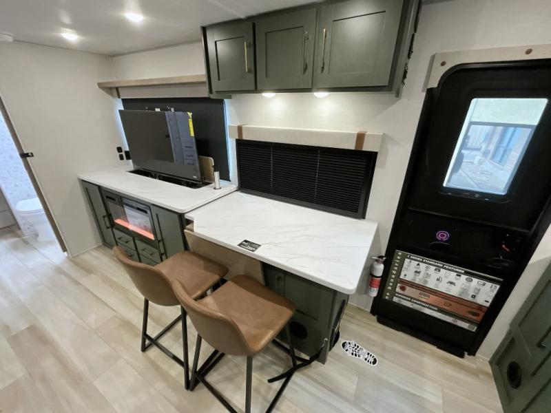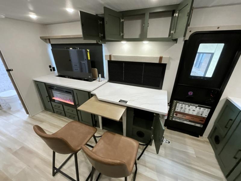 Make each camping trip one to remember in this dual entry, rear kitchen travel trailer! If you enter in through the front master bedroom, you'll find a queen bed and dual wardrobes for your things, plus a private entrance into the walk-thru bath. This will lead you to the main living area that is made spacious thanks to the large slide out. There is theater seating here, along with a refrigerator, pantry, and hutch with a shelf so everything has its place. Once the chef of your group has made dinner in the rear kitchen, you can dine at the Bar 2 Table pull-out dinette, which is conveniently located in front of the flip-up window. Just outside this window, you'll find the Trailgate outdoor bar, giving you a food truck atmosphere where you can visit with those sitting at the dinette table inside. When the optional Beast Mode Package on this model is chosen, you'll enjoy a 400-watt solar package, a fresh water filter, a Maxxair roof vent cover, plus a Beast Mode independent suspension for better handling.