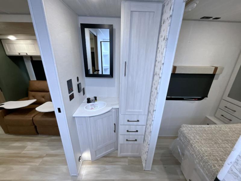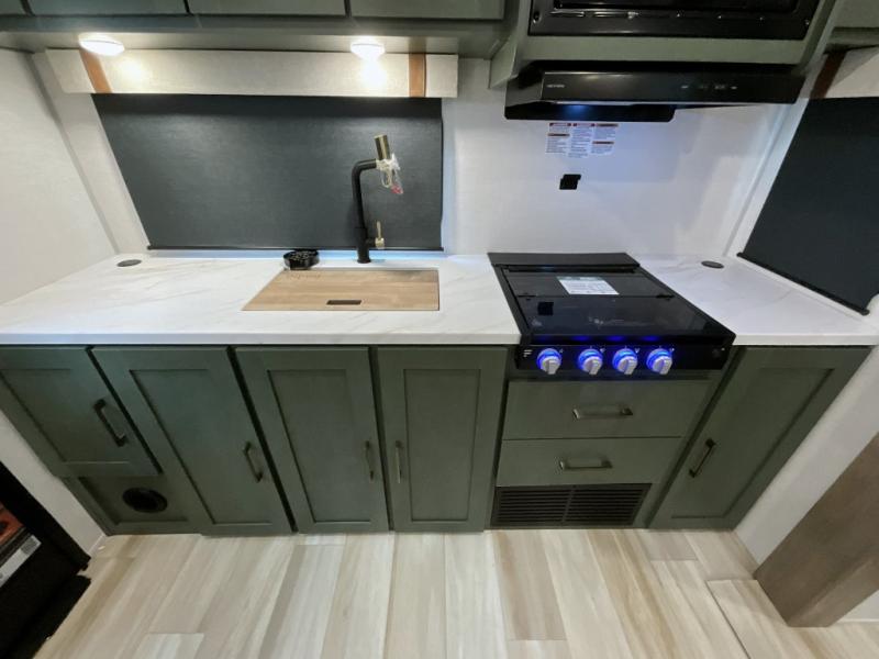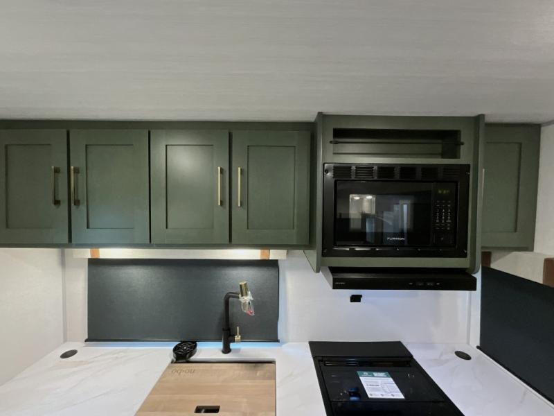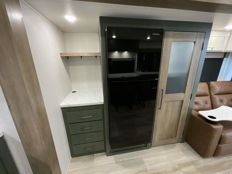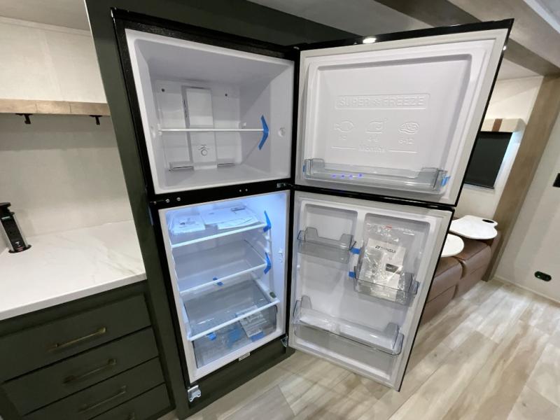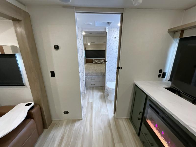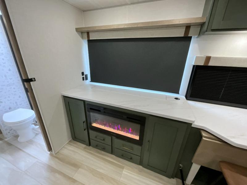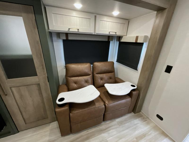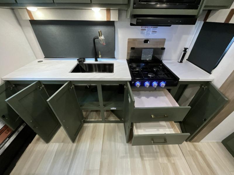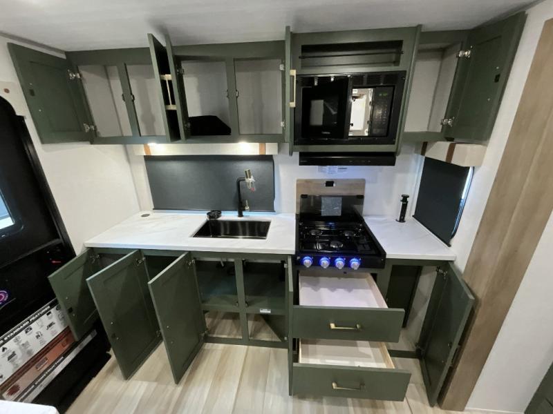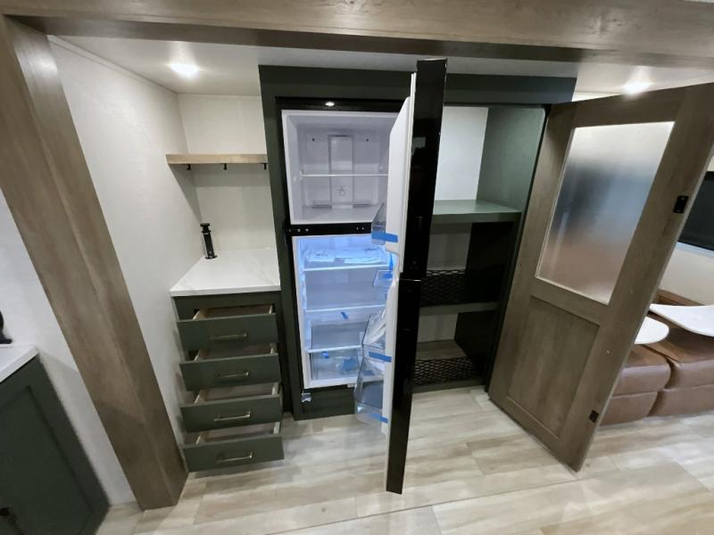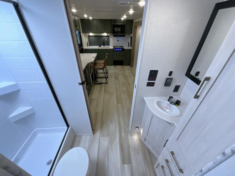 Make each camping trip one to remember in this dual entry, rear kitchen travel trailer! If you enter in through the front master bedroom, you'll find a queen bed and dual wardrobes for your things, plus a private entrance into the walk-thru bath. This will lead you to the main living area that is made spacious thanks to the large slide out. There is theater seating here, along with a refrigerator, pantry, and hutch with a shelf so everything has its place. Once the chef of your group has made dinner in the rear kitchen, you can dine at the Bar 2 Table pull-out dinette, which is conveniently located in front of the flip-up window. Just outside this window, you'll find the Trailgate outdoor bar, giving you a food truck atmosphere where you can visit with those sitting at the dinette table inside. When the optional Beast Mode Package on this model is chosen, you'll enjoy a 400-watt solar package, a fresh water filter, a Maxxair roof vent cover, plus a Beast Mode independent suspension for better handling.