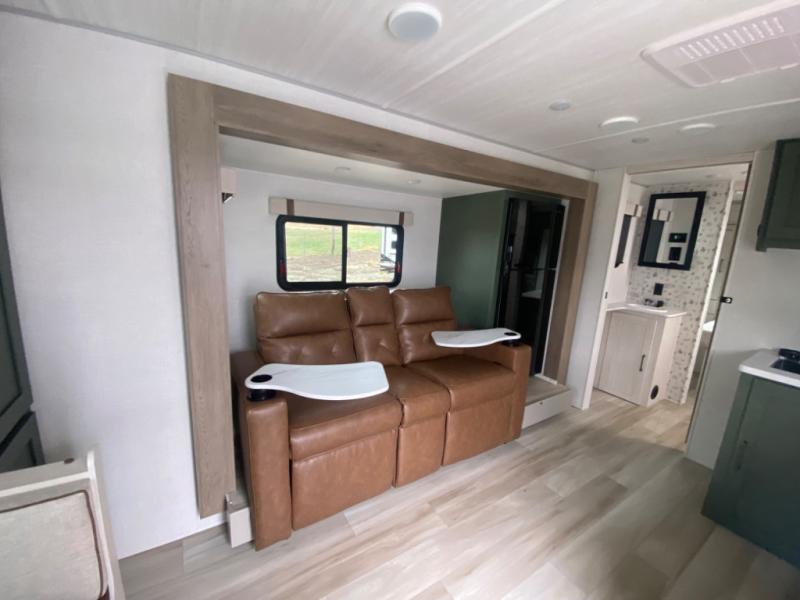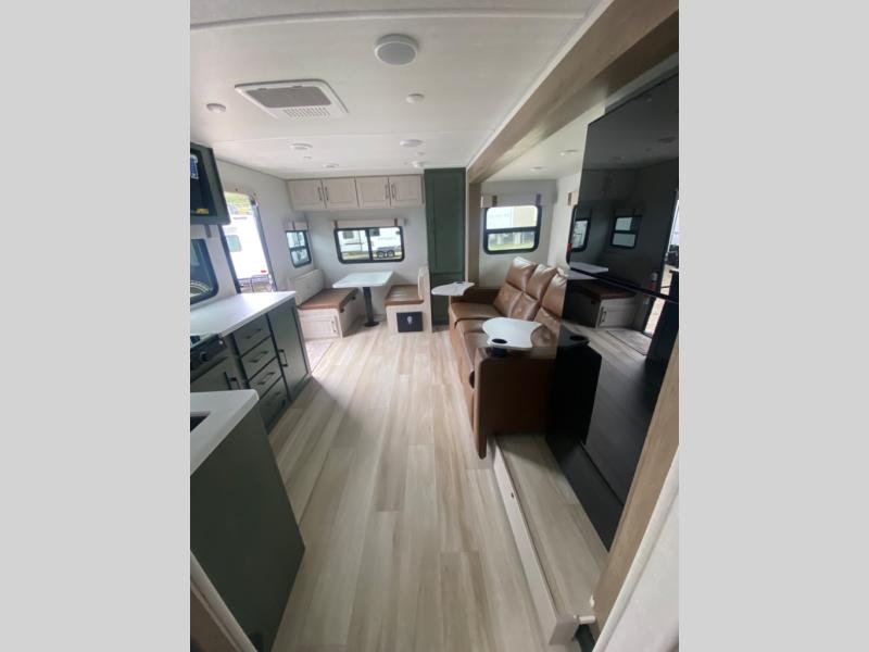 It will be so easy to enjoy camping trips in this No Boundaries travel trailer! The front master bedroom includes one of the dual entry doors so you can slip out early for a morning run without waking anyone else up. When you return, you can freshen up in the walk-thru bath, then head to the kitchen to make breakfast. There is also an outside kitchen so you can cook in the fresh mountain air. There is a booth dinette inside where you can dine at, play games, and even let a guest sleep over, and the tri-fold sofa slide provides more space and comfort!