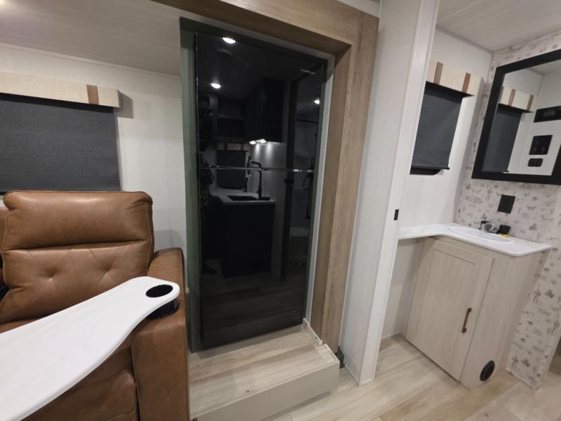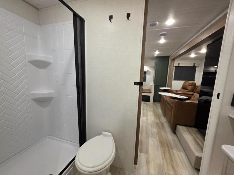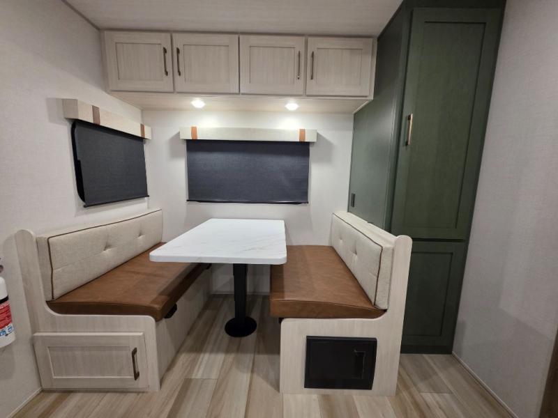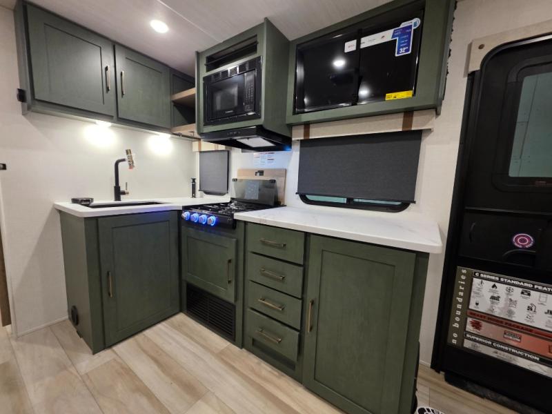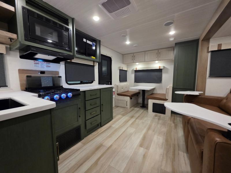 It will be so easy to enjoy camping trips in this No Boundaries travel trailer! The front master bedroom includes one of the dual entry doors so you can slip out early for a morning run without waking anyone else up. When you return, you can freshen up in the walk-thru bath, then head to the kitchen to make breakfast. There is also an outside kitchen so you can cook in the fresh mountain air. There is a booth dinette inside where you can dine at, play games, and even let a guest sleep over, and the tri-fold sofa slide provides more space and comfort!