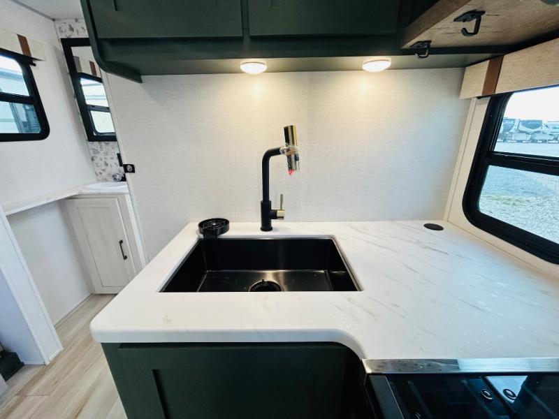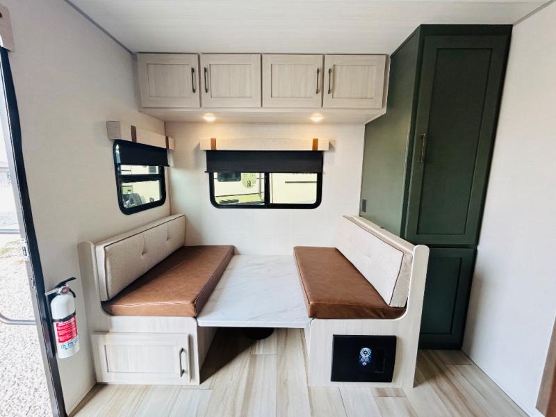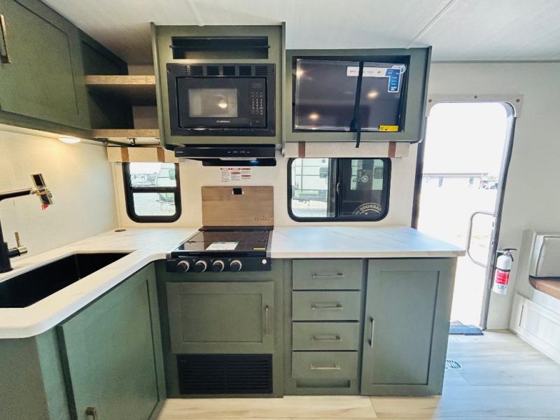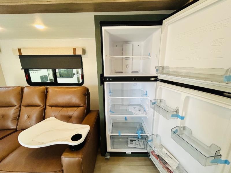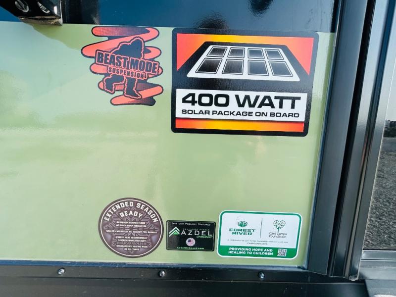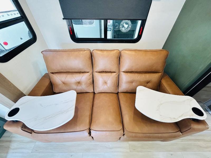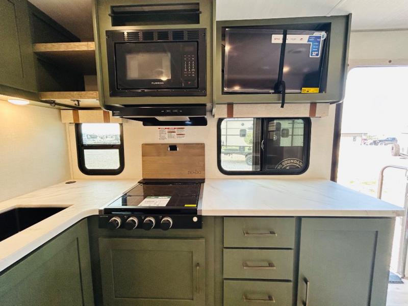 It will be so easy to enjoy camping trips in this No Boundaries travel trailer! The front master bedroom includes one of the dual entry doors so you can slip out early for a morning run without waking anyone else up. When you return, you can freshen up in the walk-thru bath, then head to the kitchen to make breakfast. There is also an outside kitchen so you can cook in the fresh mountain air. There is a booth dinette inside where you can dine at, play games, and even let a guest sleep over, and the tri-fold sofa slide provides more space and comfort! When the optional Beast Mode Package on this model is chosen, you'll enjoy a 400-watt solar package, a fresh water filter, a Maxxair roof vent cover, plus a Beast Mode independent suspension for better handling.