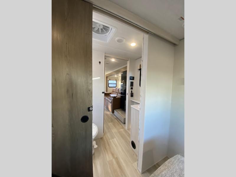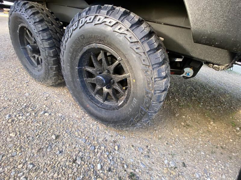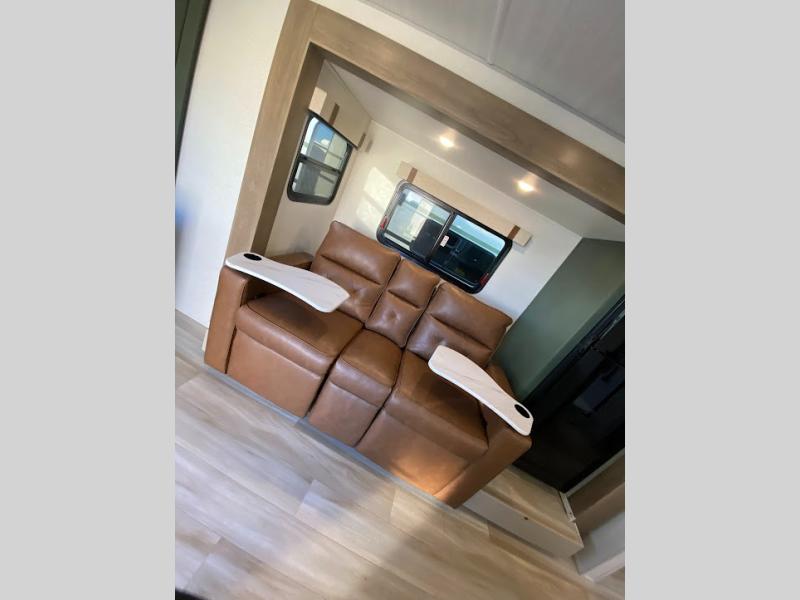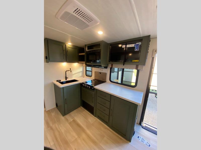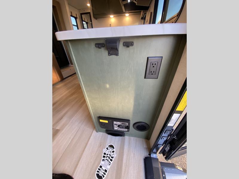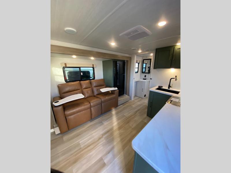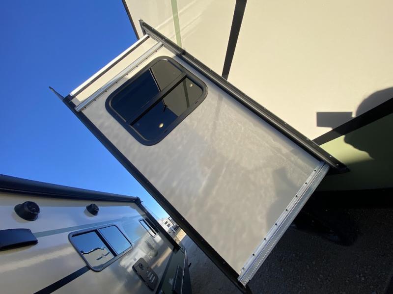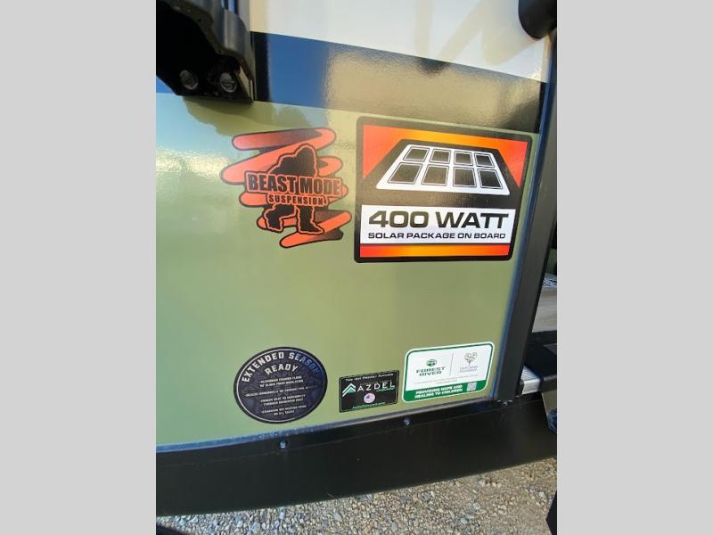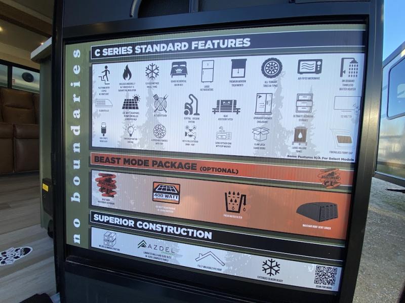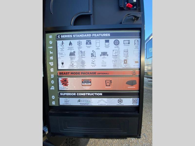 It will be so easy to enjoy camping trips in this No Boundaries travel trailer! The front master bedroom includes one of the dual entry doors so you can slip out early for a morning run without waking anyone else up. When you return, you can freshen up in the walk-thru bath, then head to the kitchen to make breakfast. There is also an outside kitchen so you can cook in the fresh mountain air. There is a booth dinette inside where you can dine at, play games, and even let a guest sleep over, and the tri-fold sofa slide provides more space and comfort! When the optional Beast Mode Package on this model is chosen, you'll enjoy a 400-watt solar package, a fresh water filter, a Maxxair roof vent cover, plus a Beast Mode independent suspension for better handling.
