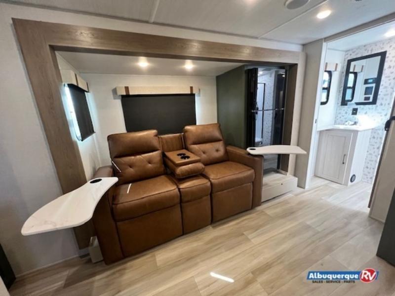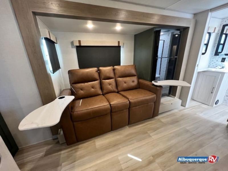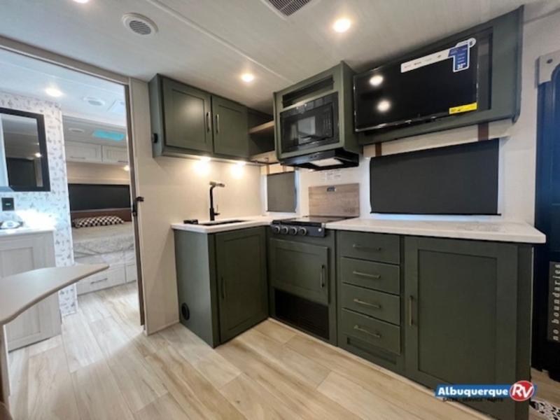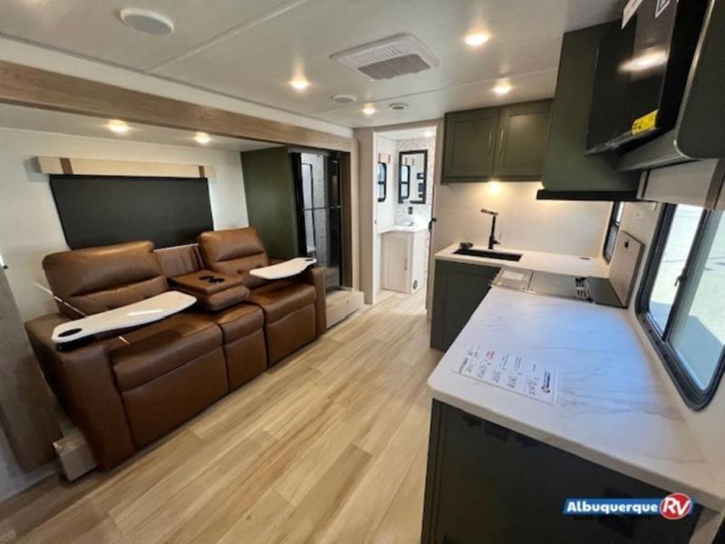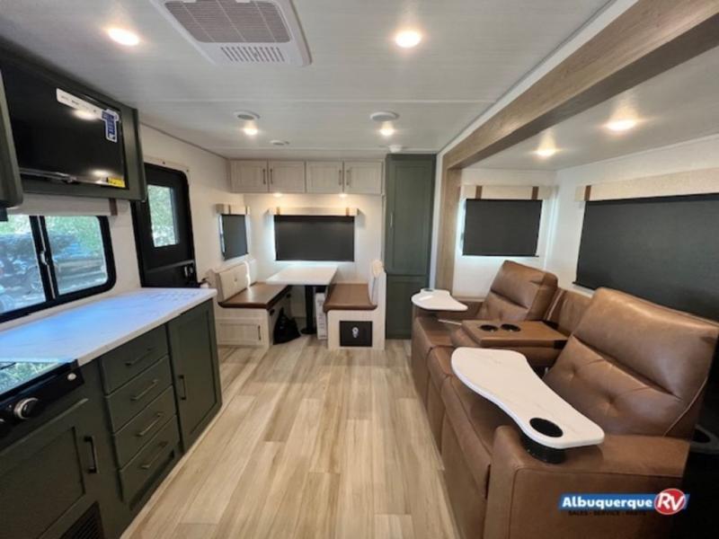 It will be so easy to enjoy camping trips in this No Boundaries travel trailer! The front master bedroom includes one of the dual entry doors so you can slip out early for a morning run without waking anyone else up. When you return, you can freshen up in the walk-thru bath, then head to the kitchen to make breakfast. There is also an outside kitchen so you can cook in the fresh mountain air. There is a booth dinette inside where you can dine at, play games, and even let a guest sleep over, and the tri-fold sofa slide provides more space and comfort! When the optional Beast Mode Package on this model is chosen, you'll enjoy a 400-watt solar package, a fresh water filter, a Maxxair roof vent cover, plus a Beast Mode independent suspension for better handling.