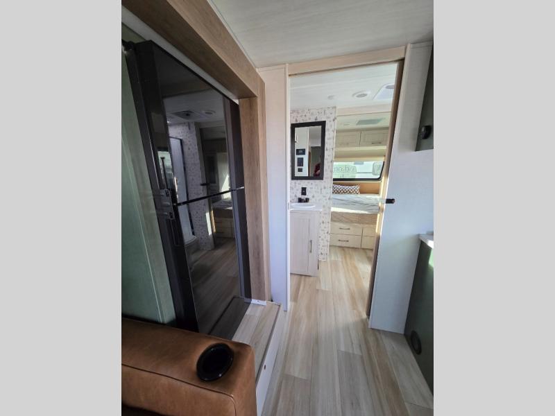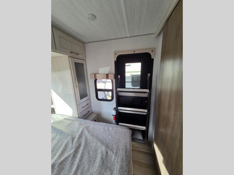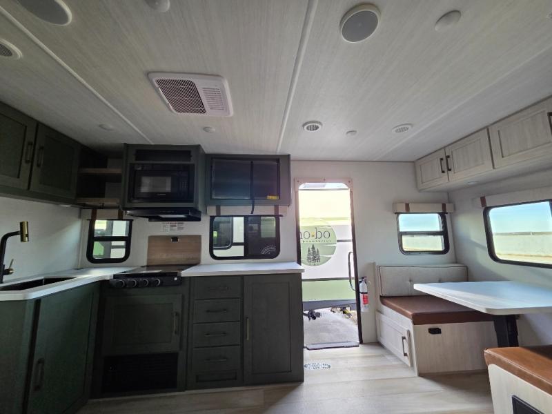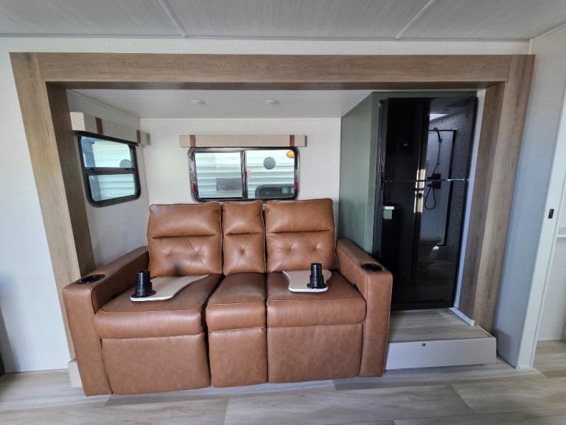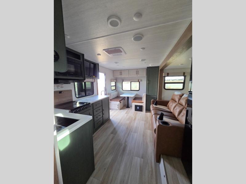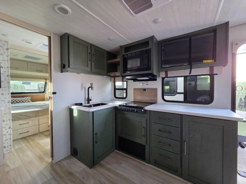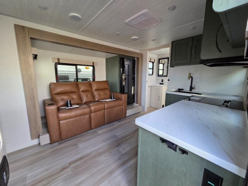 It will be so easy to enjoy camping trips in this No Boundaries travel trailer! The front master bedroom includes one of the dual entry doors so you can slip out early for a morning run without waking anyone else up. When you return, you can freshen up in the walk-thru bath, then head to the kitchen to make breakfast. There is also an outside kitchen so you can cook in the fresh mountain air. There is a booth dinette inside where you can dine at, play games, and even let a guest sleep over, and the tri-fold sofa slide provides more space and comfort! When the optional Beast Mode Package on this model is chosen, you'll enjoy a 400-watt solar package, a fresh water filter, a Maxxair roof vent cover, plus a Beast Mode independent suspension for better handling.