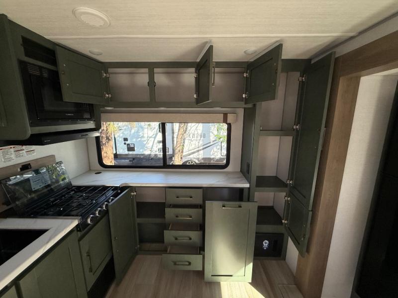 This spacious travel trailer is perfect for weekend trips to the lake. After you've unloaded the pass-through storage and put out the 20' awning, you can make lunch on the outside kitchen. If the weather isn't cooperating, the rear kitchen inside provides all the appliances needed to prepare meals. A Bar 2 Table provides a place to dine together, and there is a flip-up window here to let more light in! Your guests can sleep on the tri-fold sofa, while you take the queen bed in the front private bedroom. This unit also includes a closet with washer and dryer prep of you plan to add these appliances.