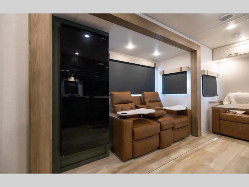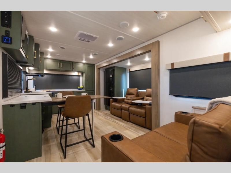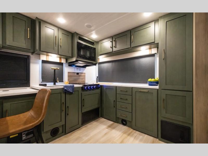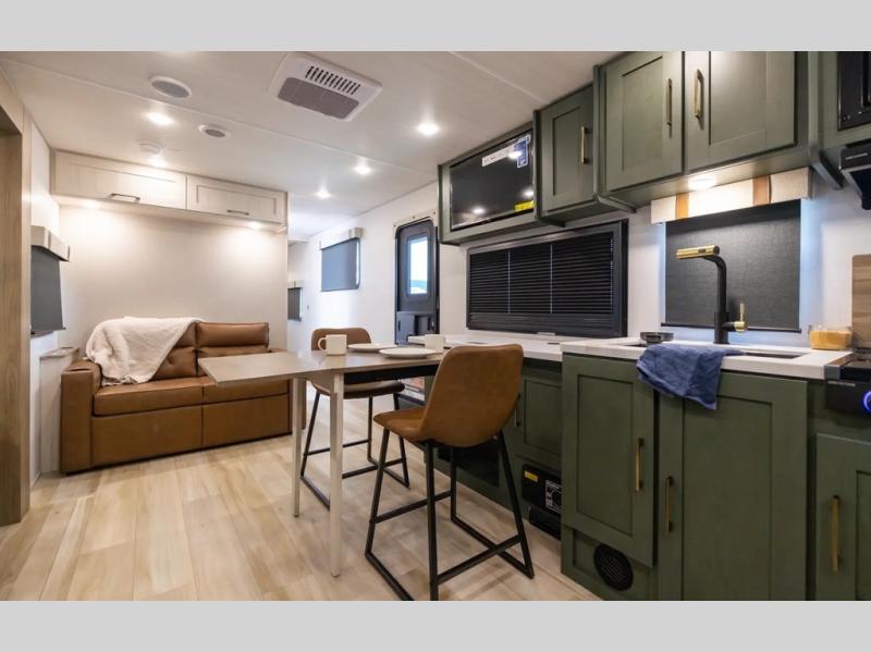 This spacious travel trailer is perfect for weekend trips to the lake. After you've unloaded the pass-through storage and put out the 20' awning, you can make lunch on the outside kitchen. If the weather isn't cooperating, the rear kitchen inside provides all the appliances needed to prepare meals. A Bar 2 Table provides a place to dine together, and there is a flip-up window here to let more light in! Your guests can sleep on the tri-fold sofa, while you take the queen bed in the front private bedroom. This unit also includes a closet with washer and dryer prep if you plan to add these appliances.