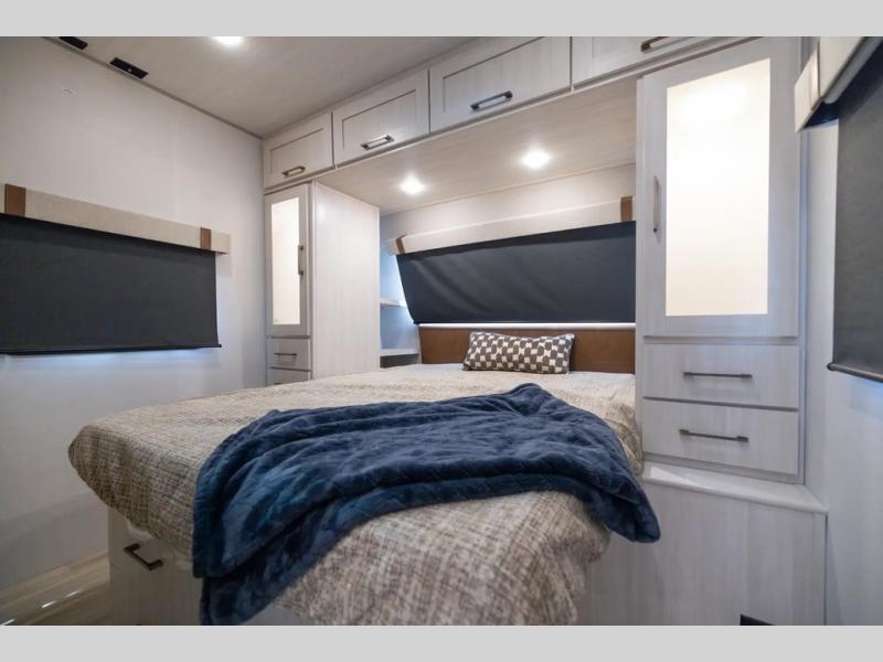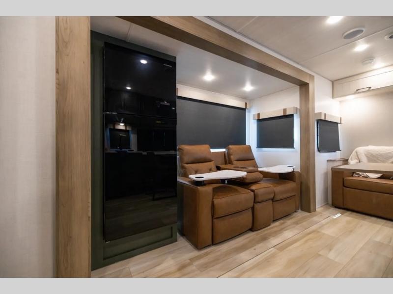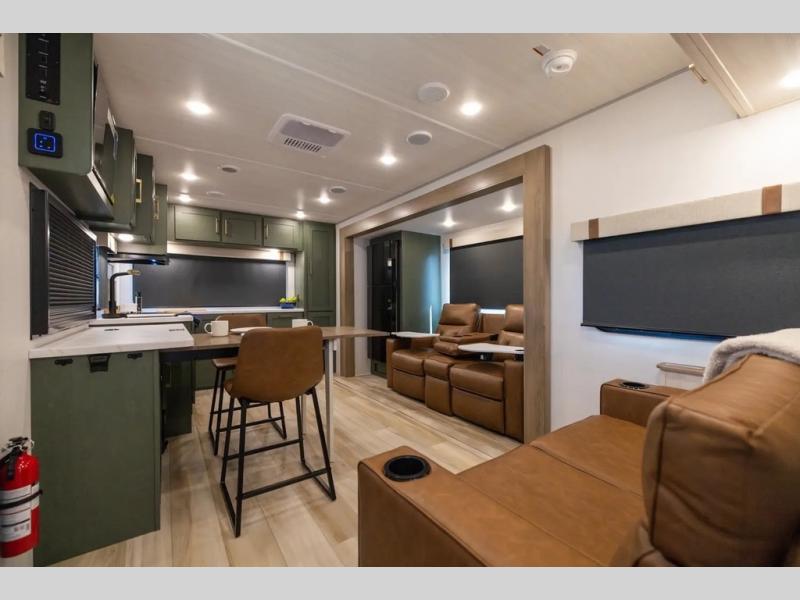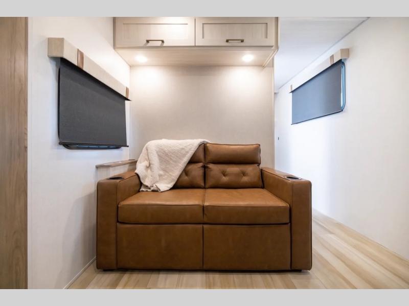 This spacious travel trailer is perfect for weekend trips to the lake. After you've unloaded the pass-through storage and put out the 20' awning, you can make lunch on the outside kitchen. If the weather isn't cooperating, the rear kitchen inside provides all the appliances needed to prepare meals. A Bar 2 Table provides a place to dine together, and there is a flip-up window here to let more light in! Your guests can sleep on the tri-fold sofa, while you take the queen bed in the front private bedroom. This unit also includes a closet with washer and dryer prep if you plan to add these appliances.