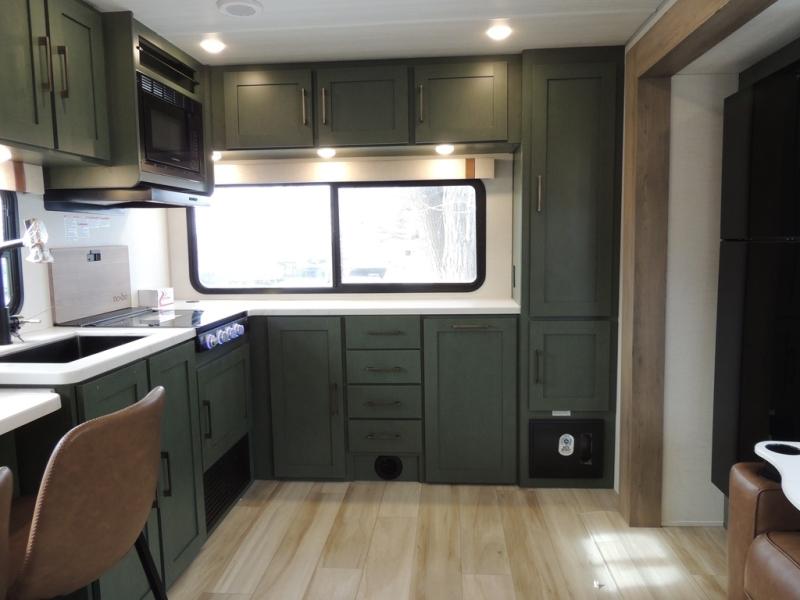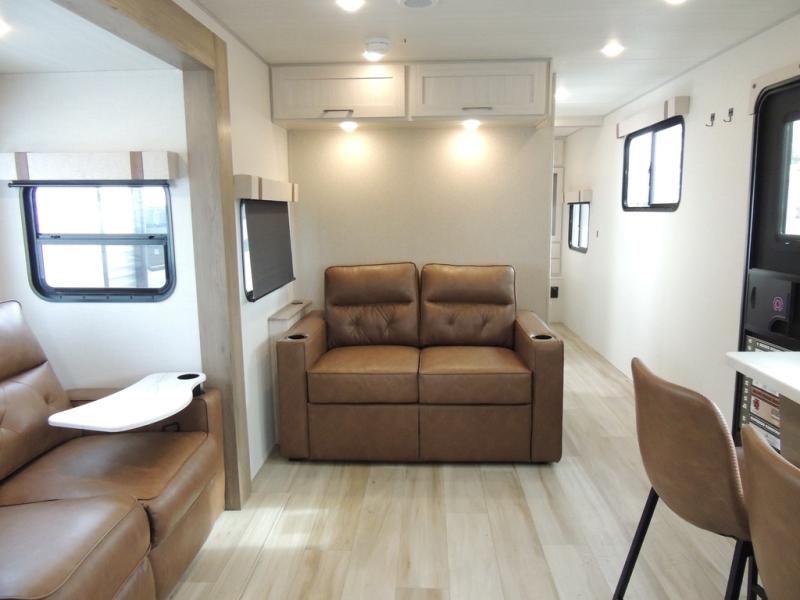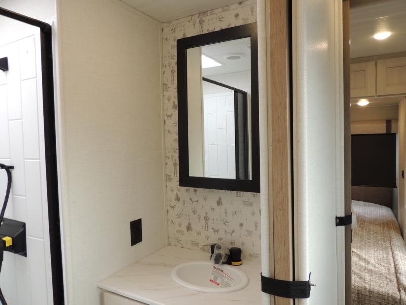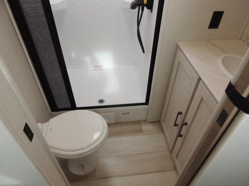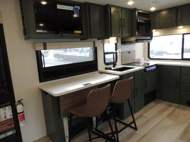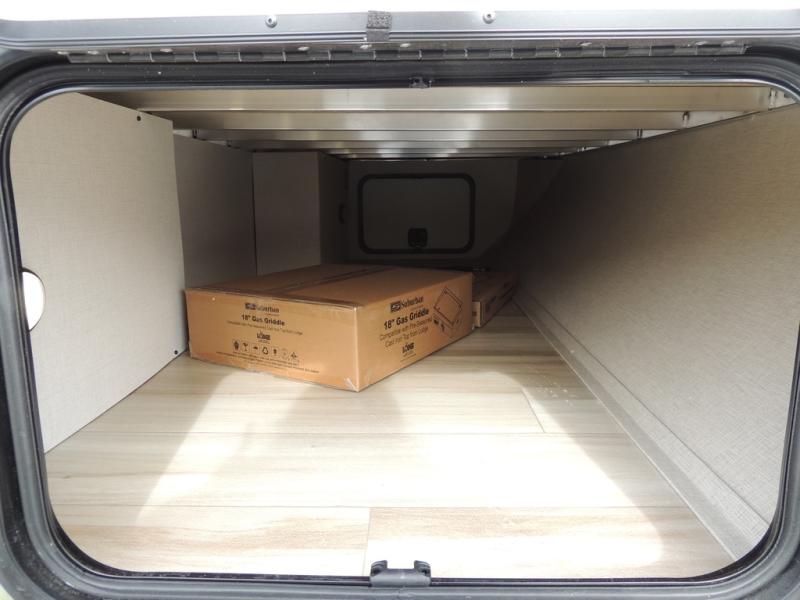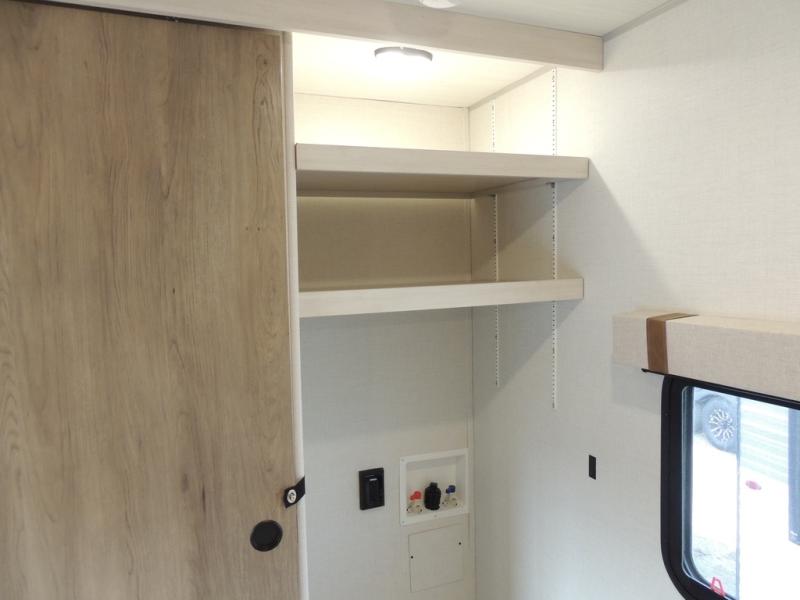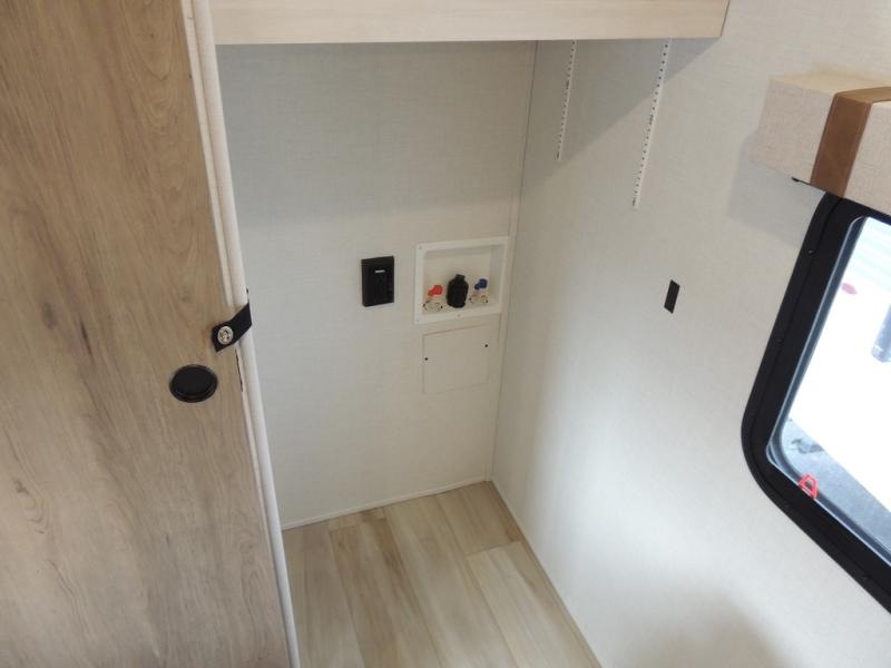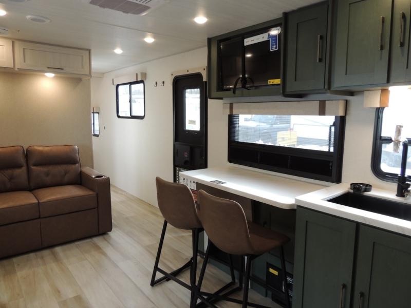 This spacious travel trailer is perfect for weekend trips to the lake. After you've unloaded the pass-through storage and put out the 20' awning, you can make lunch on the outside kitchen. If the weather isn't cooperating, the rear kitchen inside provides all the appliances needed to prepare meals. A Bar 2 Table provides a place to dine together, and there is a flip-up window here to let more light in! Your guests can sleep on the tri-fold sofa, while you take the queen bed in the front private bedroom. This unit also includes a closet with washer and dryer prep if you plan to add these appliances.