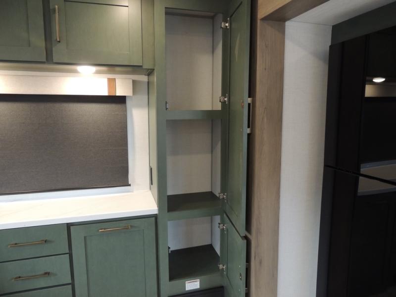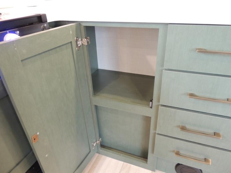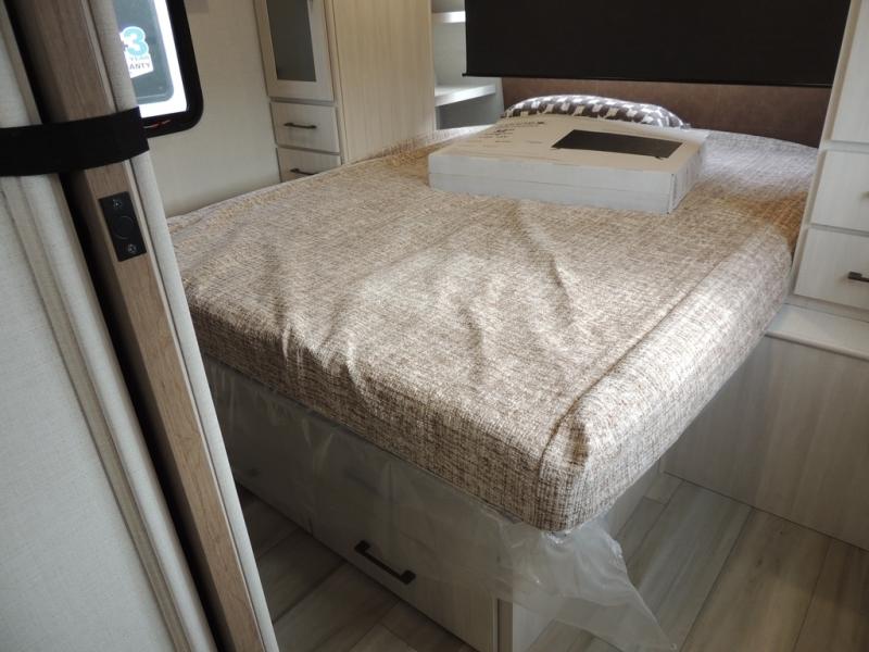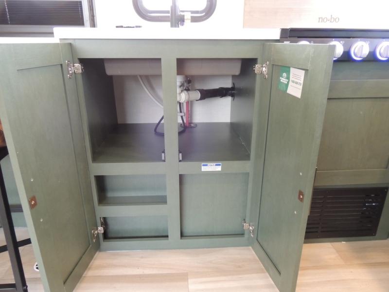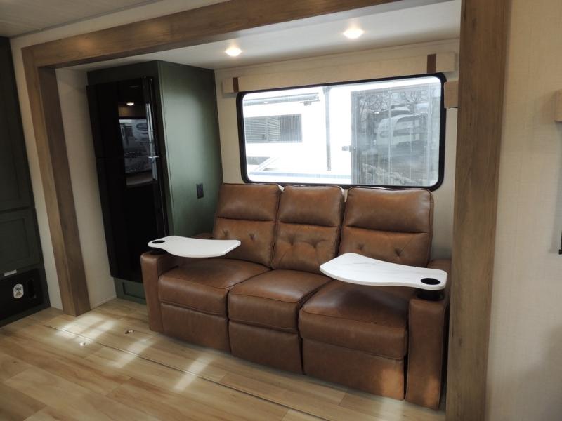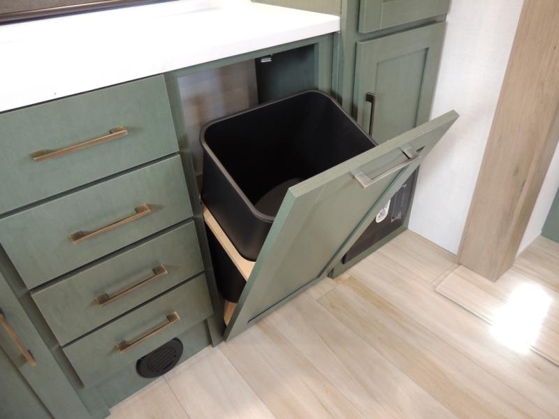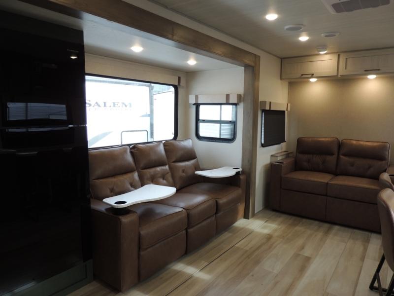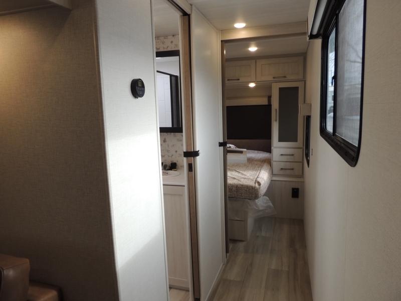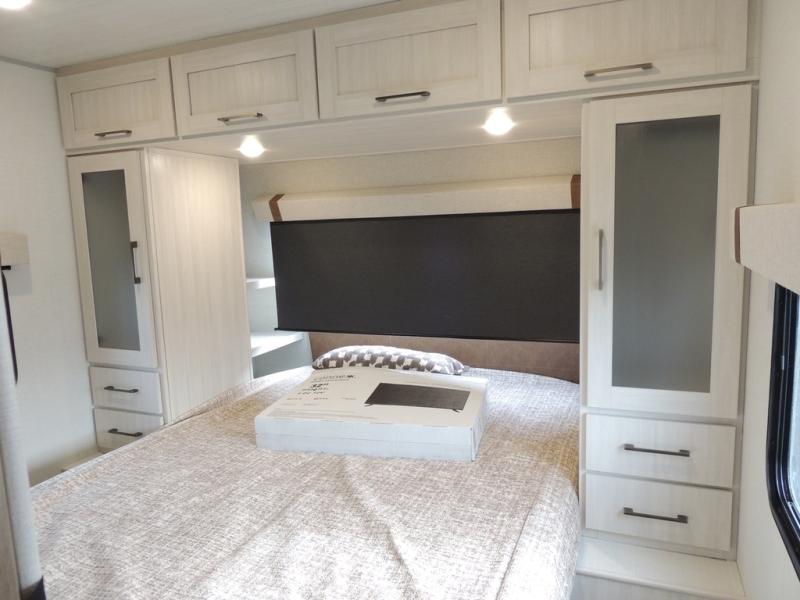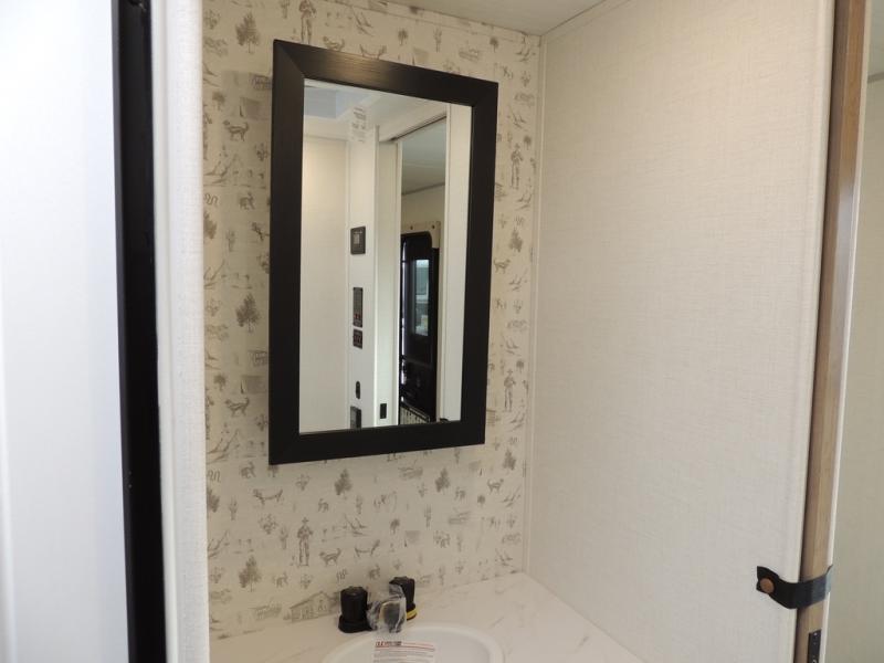 This spacious travel trailer is perfect for weekend trips to the lake. After you've unloaded the pass-through storage and put out the 20' awning, you can make lunch on the outside kitchen. If the weather isn't cooperating, the rear kitchen inside provides all the appliances needed to prepare meals. A Bar 2 Table provides a place to dine together, and there is a flip-up window here to let more light in! Your guests can sleep on the tri-fold sofa, while you take the queen bed in the front private bedroom. This unit also includes a closet with washer and dryer prep if you plan to add these appliances.