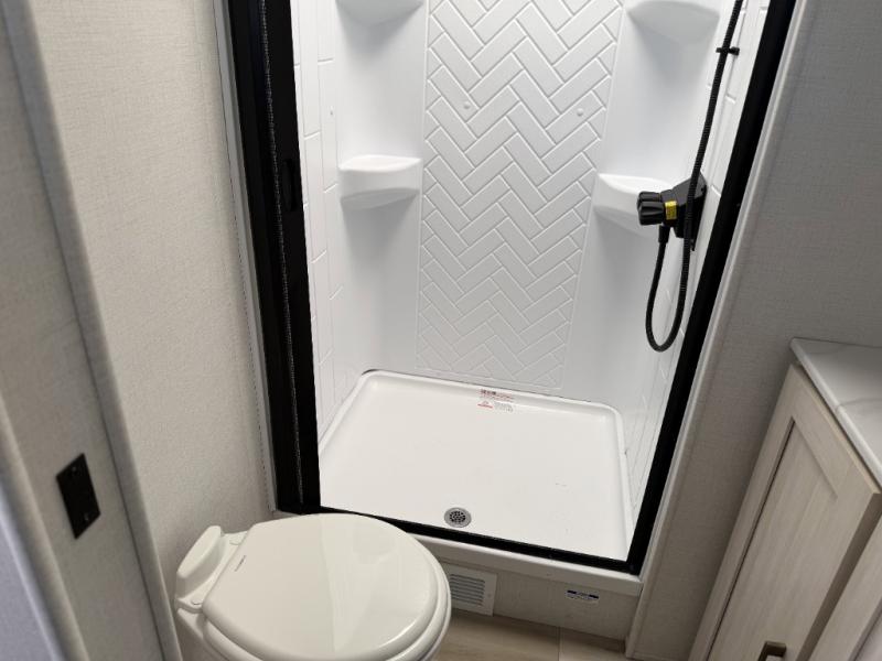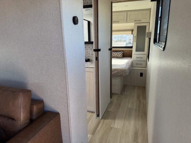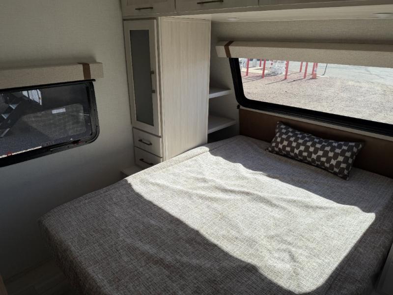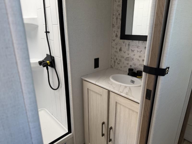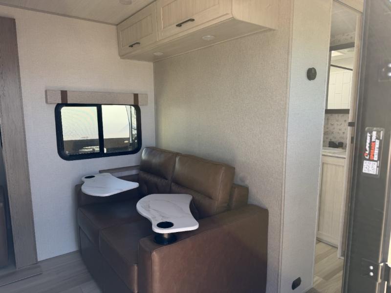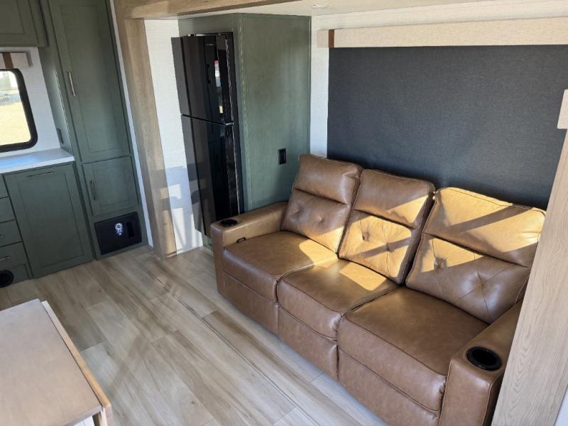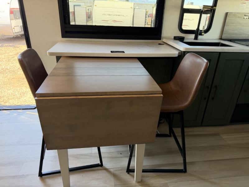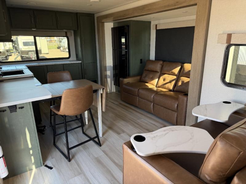 This spacious travel trailer is perfect for weekend trips to the lake. After you've unloaded the pass-through storage and put out the 20' awning, you can make lunch on the outside kitchen. If the weather isn't cooperating, the rear kitchen inside provides all the appliances needed to prepare meals. A Bar 2 Table provides a place to dine together, and there is a flip-up window here to let more light in! Your guests can sleep on the tri-fold sofa, while you take the queen bed in the front private bedroom. This unit also includes a closet with washer and dryer prep if you plan to add these appliances. When the optional Beast Mode Package is chosen on this model, you'll enjoy the Beast Mode suspension, an additional 200-watt solar panel, a Maxxair vent cover and more!
