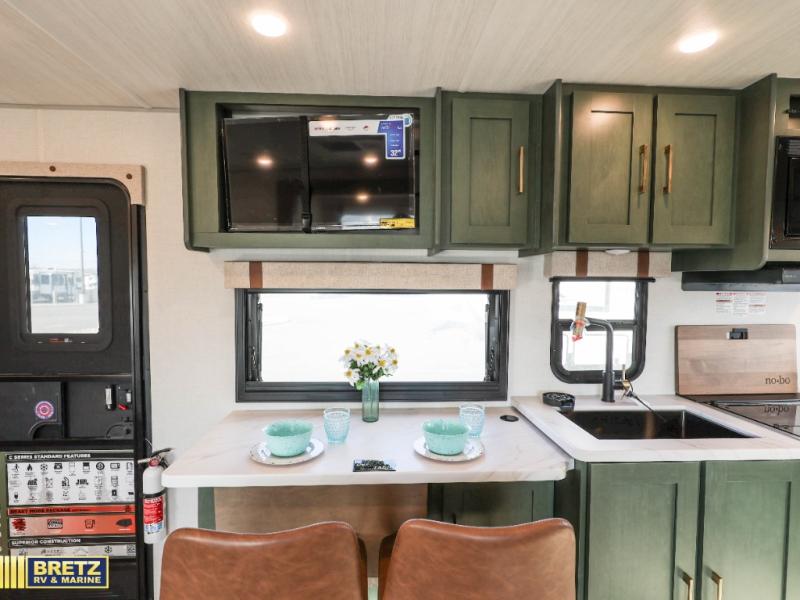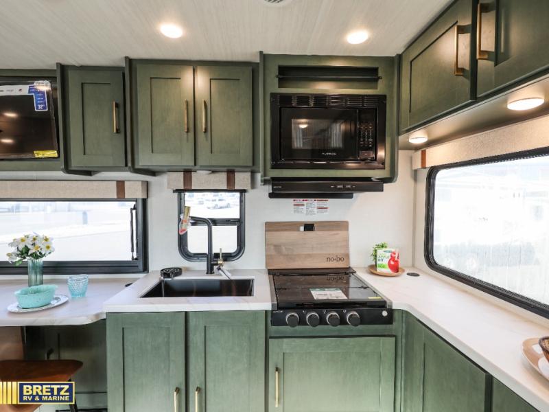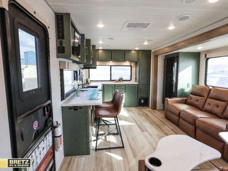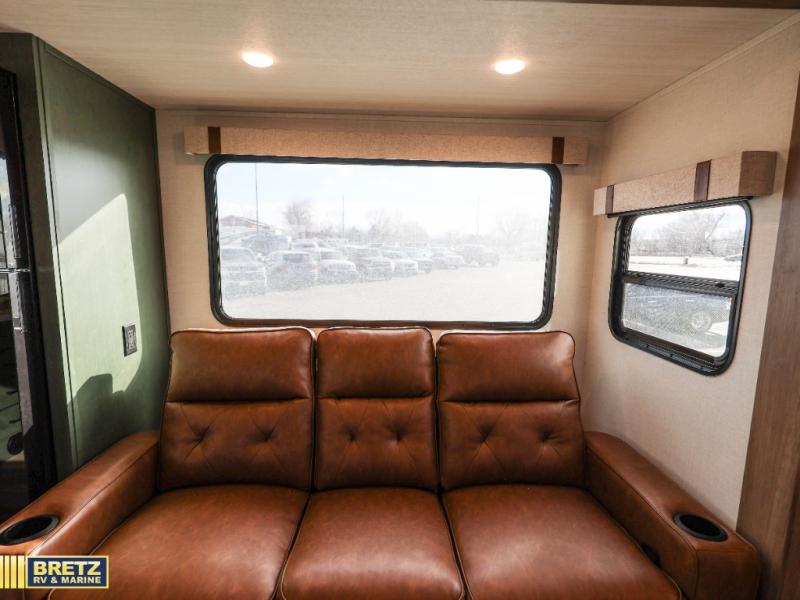 This spacious travel trailer is perfect for weekend trips to the lake. After you've unloaded the pass-through storage and put out the 20' awning, you can make lunch on the outside kitchen. If the weather isn't cooperating, the rear kitchen inside provides all the appliances needed to prepare meals. A Bar 2 Table provides a place to dine together, and there is a flip-up window here to let more light in! Your guests can sleep on the tri-fold sofa, while you take the queen bed in the front private bedroom. This unit also includes a closet with washer and dryer prep if you plan to add these appliances. When the optional Beast Mode Package is chosen on this model, you'll enjoy the Beast Mode suspension, an additional 200-watt solar panel, a Maxxair vent cover and more!